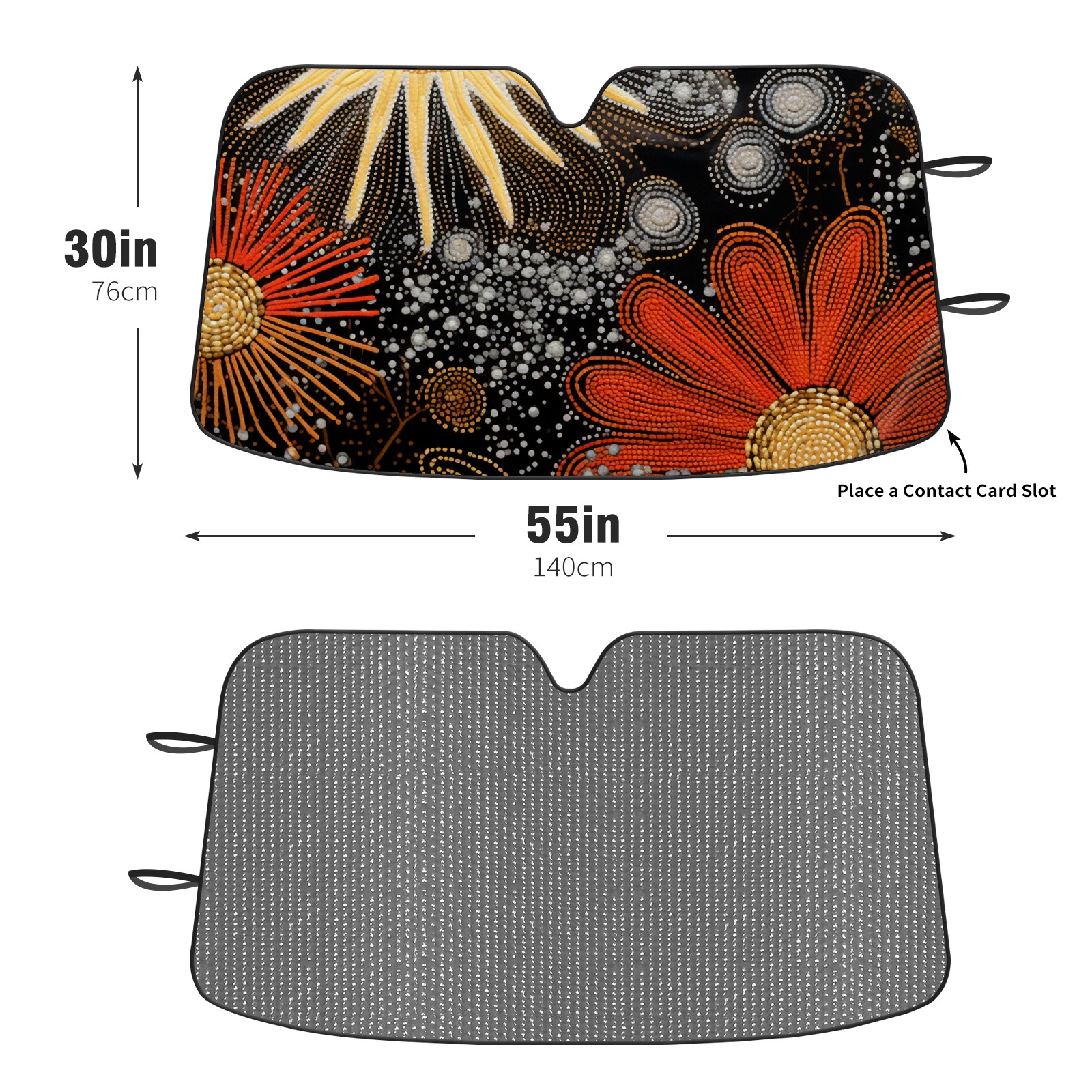 Diameter /Size 63"L x 33.5"W Made from excellent materials which makes it sturdy and protects the car from the sun. Easy to use and pack. Makes the interior of the car cooler.You can easily stash the sunshade in the storage bag or store long term.It open and closes easy. Also the leather storage bag is durable and easy to put the umbrella back into.This windshield sunshade provides complete coverage and keeps your car interior cool under direct sun. It is easy to open and position under the windshield and around the rear-view mirror. Makes Your Car Easy To Identify, Perfect For Finding Your Car In Crowded Parking Lots And Garages.Great Choice: It Is A Great Gift For Dad, Boyfriend, Brother, Brother And Uncle, Friends, Classmates, Family And So On. Notice: Due To Difference Computer Monitors, The Color Maybe Slightly Different From Picture. As Different Measurement Methods, Measurement Data Will Float Within 2%.I Hope You Understand. If You Have Any Question About The Item Please Do Not Hesitate To Contact Us Immediately And We Will Give You A Satisfactory Reply Within 24 Hours.