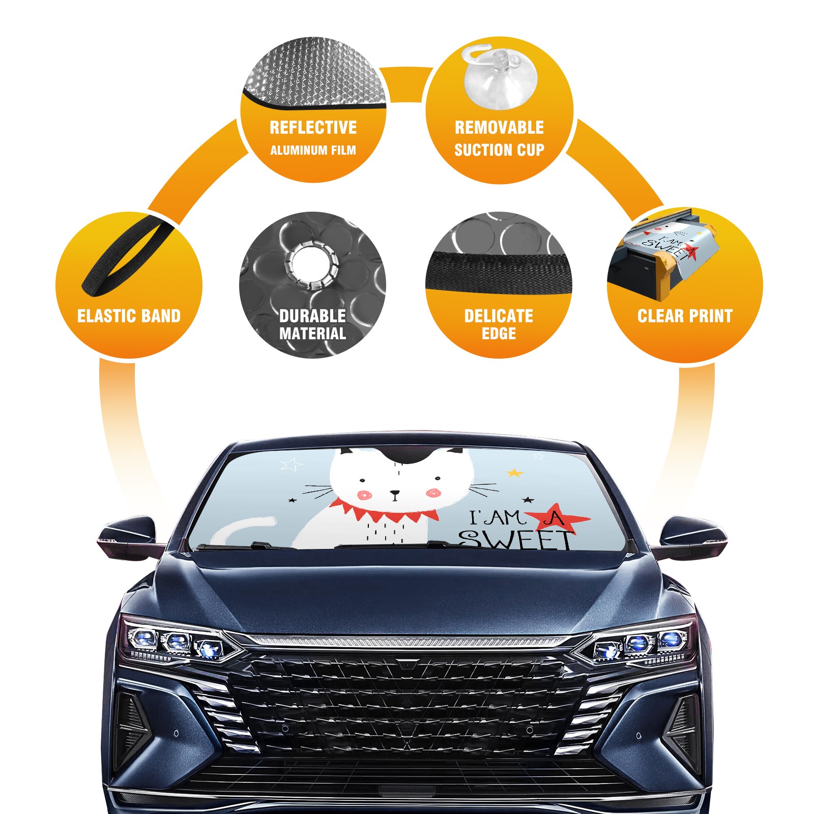 Diameter /Size 63"L x 33.5"W Made from excellent materials which makes it sturdy and protects the car from the sun. Easy to use and pack. Makes the interior of the car cooler.You can easily stash the sunshade in the storage bag or store long term.It open and closes easy. Also the leather storage bag is durable and easy to put the umbrella back into.This windshield sunshade provides complete coverage and keeps your car interior cool under direct sun. It is easy to open and position under the windshield and around the rear-view mirror. Makes Your Car Easy To Identify, Perfect For Finding Your Car In Crowded Parking Lots And Garages.Great Choice: It Is A Great Gift For Dad, Boyfriend, Brother, Brother And Uncle, Friends, Classmates, Family And So On. Notice: Due To Difference Computer Monitors, The Color Maybe Slightly Different From Picture. As Different Measurement Methods, Measurement Data Will Float Within 2%.I Hope You Understand. If You Have Any Question About The Item Please Do Not Hesitate To Contact Us Immediately And We Will Give You A Satisfactory Reply Within 24 Hours.