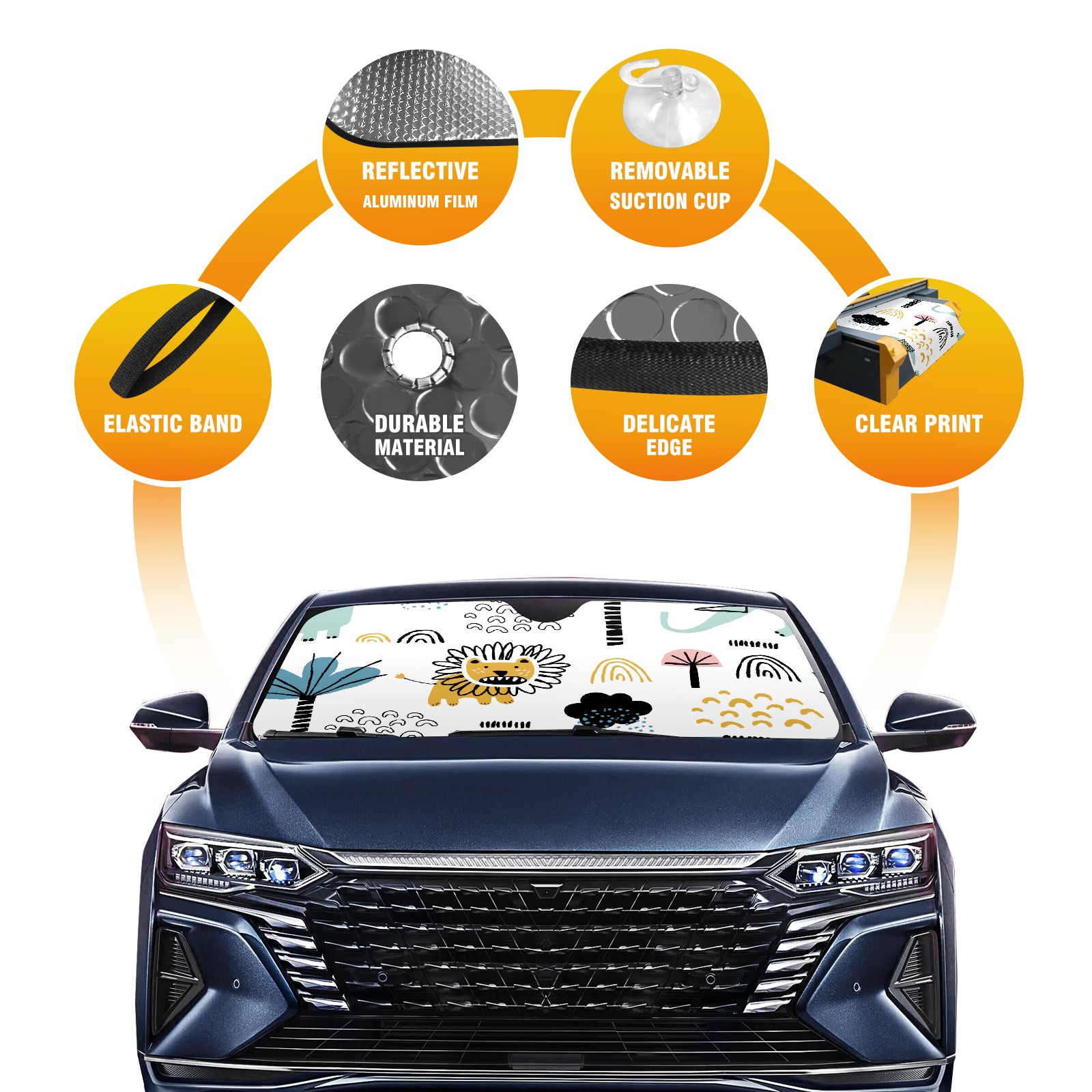 Diameter /Size 63"L x 33.5"W Made from excellent materials which makes it sturdy and protects the car from the sun. Easy to use and pack. Makes the interior of the car cooler.You can easily stash the sunshade in the storage bag or store long term.It open and closes easy. Also the leather storage bag is durable and easy to put the umbrella back into.This windshield sunshade provides complete coverage and keeps your car interior cool under direct sun. It is easy to open and position under the windshield and around the rear-view mirror. Makes Your Car Easy To Identify, Perfect For Finding Your Car In Crowded Parking Lots And Garages.Great Choice: It Is A Great Gift For Dad, Boyfriend, Brother, Brother And Uncle, Friends, Classmates, Family And So On. Notice: Due To Difference Computer Monitors, The Color Maybe Slightly Different From Picture. As Different Measurement Methods, Measurement Data Will Float Within 2%.I Hope You Understand. If You Have Any Question About The Item Please Do Not Hesitate To Contact Us Immediately And We Will Give You A Satisfactory Reply Within 24 Hours.