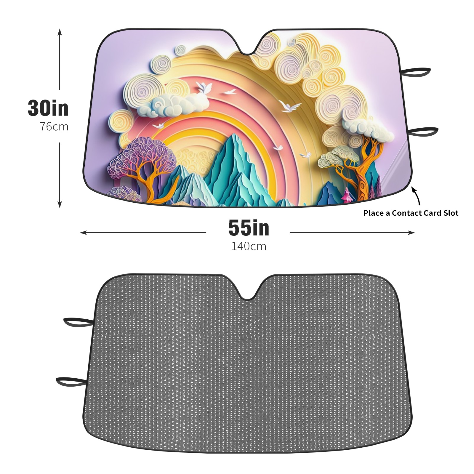 Diameter /Size 63"L x 33.5"W Made from excellent materials which makes it sturdy and protects the car from the sun. Easy to use and pack. Makes the interior of the car cooler.You can easily stash the sunshade in the storage bag or store long term.It open and closes easy. Also the leather storage bag is durable and easy to put the umbrella back into.This windshield sunshade provides complete coverage and keeps your car interior cool under direct sun. It is easy to open and position under the windshield and around the rear-view mirror. Makes Your Car Easy To Identify, Perfect For Finding Your Car In Crowded Parking Lots And Garages.Great Choice: It Is A Great Gift For Dad, Boyfriend, Brother, Brother And Uncle, Friends, Classmates, Family And So On. Notice: Due To Difference Computer Monitors, The Color Maybe Slightly Different From Picture. As Different Measurement Methods, Measurement Data Will Float Within 2%.I Hope You Understand. If You Have Any Question About The Item Please Do Not Hesitate To Contact Us Immediately And We Will Give You A Satisfactory Reply Within 24 Hours.