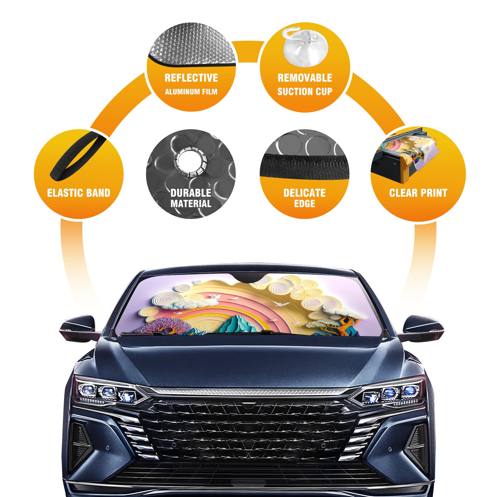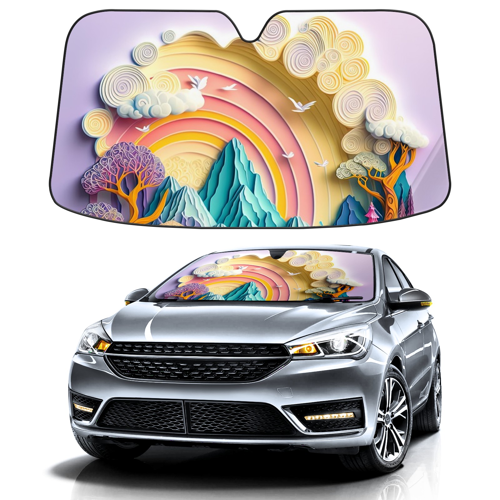 • Diameter /Size 63"L x 33.5"W Made from excellent materials which makes it sturdy and protects the car from the sun. Easy to use and pack. Makes the interior of the car cooler.You can easily stash the sunshade in the storage bag or store long term.It open and closes easy. Also the leather storage bag is durable and easy to put the umbrella back into.This windshield sunshade provides complete coverage and keeps your car interior cool under direct sun. It is easy to open and position under the windshield and around the rear-view mirror. Makes Your Car Easy To Identify, Perfect For Finding Your Car In Crowded Parking Lots And Garages.Great Choice: It Is A Great Gift For Dad, Boyfriend, Brother, Brother And Uncle, Friends, Classmates, Family And So On. Notice: Due To Difference Computer Monitors, The Color Maybe Slightly Different From Picture. As Different Measurement Methods, Measurement Data Will Float Within 2%.I Hope You Understand. If You Have Any Question About The Item Please Do Not Hesitate To Contact Us Immediately And We Will Give You A Satisfactory Reply Within 24 Hours.