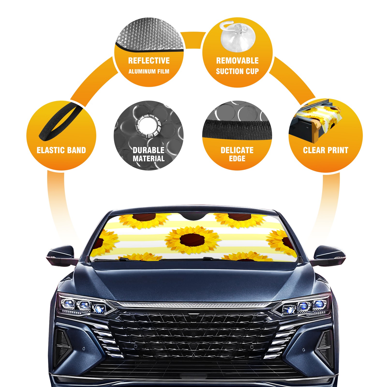 Diameter /Size 63"L x 33.5"W Made from excellent materials which makes it sturdy and protects the car from the sun. Easy to use and pack. Makes the interior of the car cooler.You can easily stash the sunshade in the storage bag or store long term.It open and closes easy. Also the leather storage bag is durable and easy to put the umbrella back into.This windshield sunshade provides complete coverage and keeps your car interior cool under direct sun. It is easy to open and position under the windshield and around the rear-view mirror. Makes Your Car Easy To Identify, Perfect For Finding Your Car In Crowded Parking Lots And Garages.Great Choice: It Is A Great Gift For Dad, Boyfriend, Brother, Brother And Uncle, Friends, Classmates, Family And So On. Notice: Due To Difference Computer Monitors, The Color Maybe Slightly Different From Picture. As Different Measurement Methods, Measurement Data Will Float Within 2%.I Hope You Understand. If You Have Any Question About The Item Please Do Not Hesitate To Contact Us Immediately And We Will Give You A Satisfactory Reply Within 24 Hours.