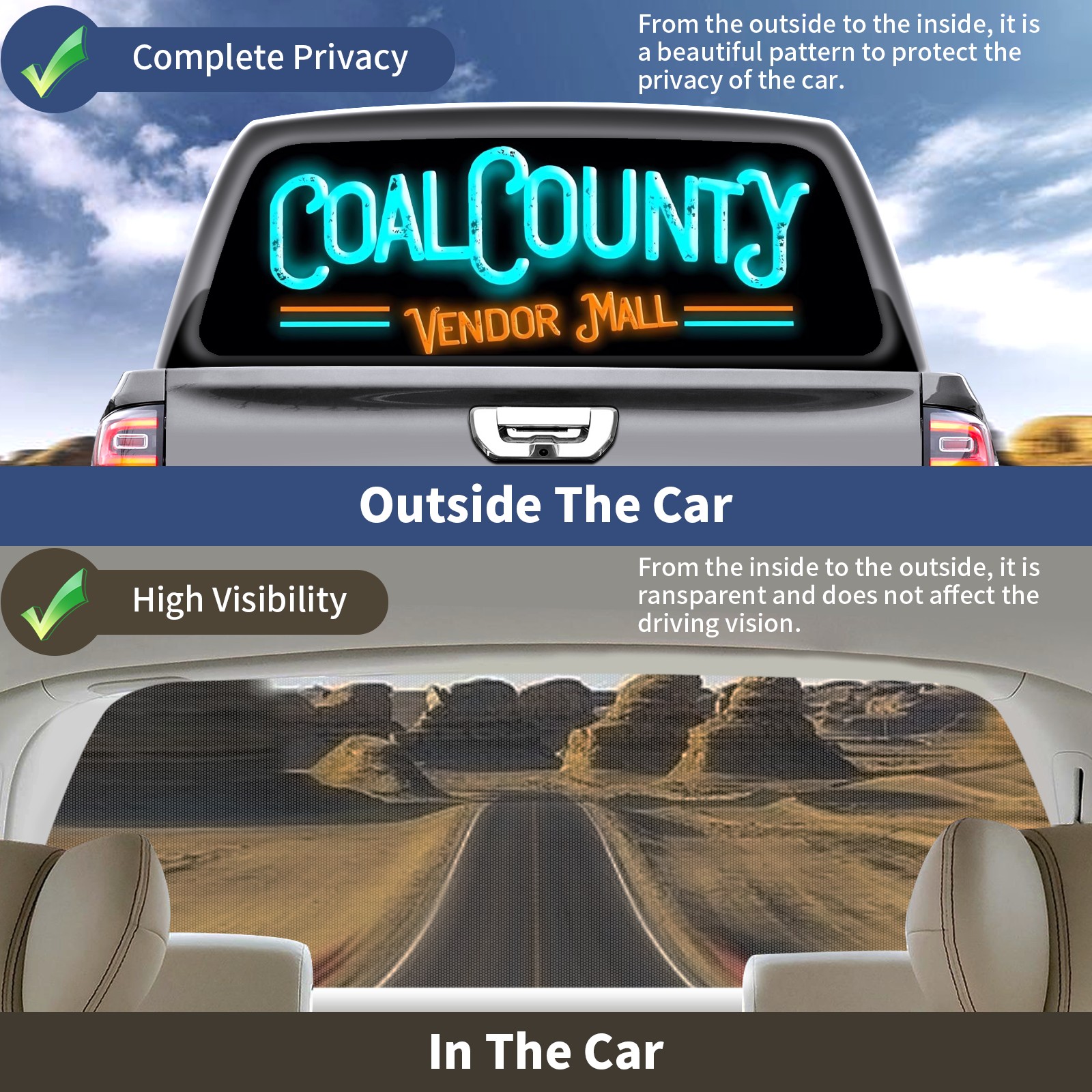 <p><strong>Truck Rear Window Graphics Decals Pickup Trucks Back Window Film Stickers 66" x 22" Perforated Vinyl Wrap Stickers Decorations for Car Rear Window</strong></p><p><strong><br /></strong></p><p><strong>Features :</strong></p><p>- Size of the rear window decals for trucks is 66x22 Inches (168x56cm).</p><p>- High quality perforated vinyl window film, one way vision sticker.</p><p>- Perforated is see through from the inside but not from outside.</p><p>- Clear printing, waterproof and durable.</p><p>- The car back window graphics stickers fits most truck and makes your vehicle more beautiful. </p><p><br /></p><p><strong>【Installation Instructions】</strong></p><p><strong>1. CLEAN SURFACE -</strong> Clean the rear window thoroughly and make sure the surface clean.</p><p><strong>2. STICK THE DECALS -</strong> Tear off the paper on the back and stick the decal on the window.</p><p><strong>3. SCRAPE OFF AIR BUBBLES -</strong> Use a squeegee or other card to scrape off the excess air bubbles.</p><p><strong>4. TRIM THE EXCESS -</strong> Use a knife to cut off the excess stickers of the window, finally complete.</p><p><br /></p><p>1. Please measure the size before purchasing, back window graphics decal for truck can be cut to your desired size.</p><p>2.The graphics stickers for truck back window is a great gift for yourself also can as a birthday / halloween / christmas gift for your friends and family.</p>