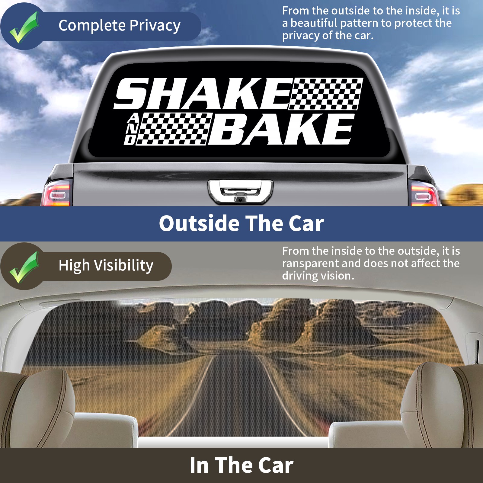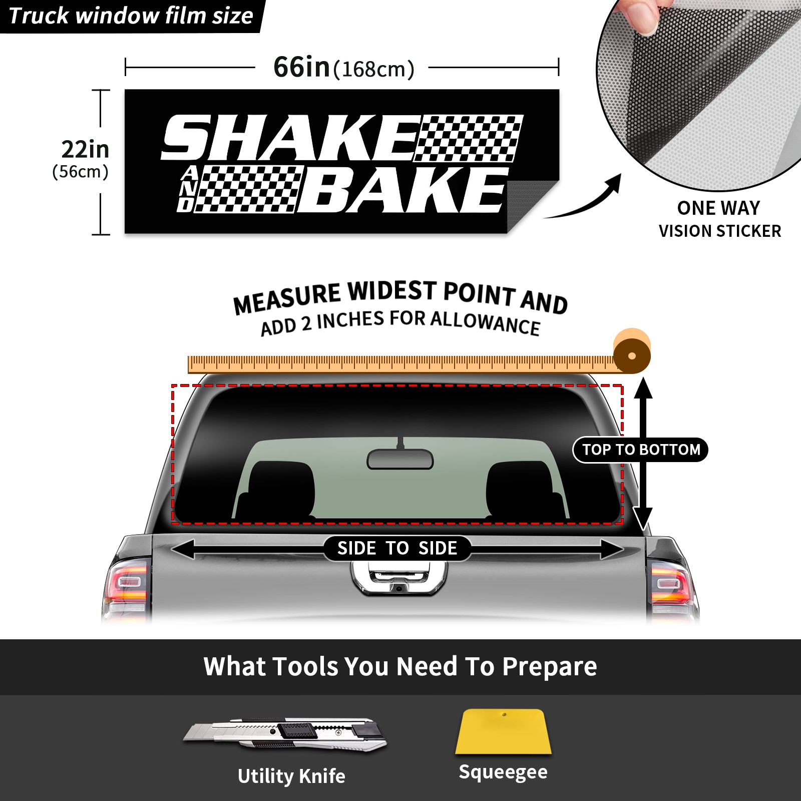 • <p><strong>Truck Rear Window Graphics Decals Pickup Trucks Back Window Film Stickers 66" x 22" Perforated Vinyl Wrap Stickers Decorations for Car Rear Window</strong></p><p><strong><br /></strong></p><p><strong>Features :</strong></p><p>- Size of the rear window decals for trucks is 66x22 Inches (168x56cm).</p><p>- High quality perforated vinyl window film, one way vision sticker.</p><p>- Perforated is see through from the inside but not from outside.</p><p>- Clear printing, waterproof and durable.</p><p>- The car back window graphics stickers fits most truck and makes your vehicle more beautiful.&nbsp;</p><p><br /></p><p><strong>【Installation Instructions】</strong></p><p><strong>1. CLEAN SURFACE -</strong> Clean the rear window thoroughly and make sure the surface clean.</p><p><strong>2. STICK THE DECALS -</strong> Tear off the paper on the back and stick the decal on the window.</p><p><strong>3. SCRAPE OFF AIR BUBBLES -</strong> Use a squeegee or other card to scrape off the excess air bubbles.</p><p><strong>4. TRIM THE EXCESS -</strong> Use a knife to cut off the excess stickers of the window, finally complete.</p><p><br /></p><p>1. Please measure the size before purchasing, back window graphics decal for truck can be cut to your desired size.</p><p>2.The graphics stickers for truck back window is a great gift for yourself also can as a birthday / halloween / christmas gift for your friends and family.</p>