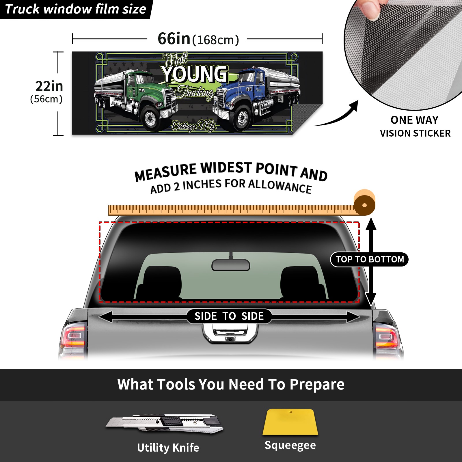 <p><strong>Truck Rear Window Graphics Decals Pickup Trucks Back Window Film Stickers 66" x 22" Perforated Vinyl Wrap Stickers Decorations for Car Rear Window</strong></p><p><strong><br /></strong></p><p><strong>Features :</strong></p><p>- Size of the rear window decals for trucks is 66x22 Inches (168x56cm).</p><p>- High quality perforated vinyl window film, one way vision sticker.</p><p>- Perforated is see through from the inside but not from outside.</p><p>- Clear printing, waterproof and durable.</p><p>- The car back window graphics stickers fits most truck and makes your vehicle more beautiful. </p><p><br /></p><p><strong>【Installation Instructions】</strong></p><p><strong>1. CLEAN SURFACE -</strong> Clean the rear window thoroughly and make sure the surface clean.</p><p><strong>2. STICK THE DECALS -</strong> Tear off the paper on the back and stick the decal on the window.</p><p><strong>3. SCRAPE OFF AIR BUBBLES -</strong> Use a squeegee or other card to scrape off the excess air bubbles.</p><p><strong>4. TRIM THE EXCESS -</strong> Use a knife to cut off the excess stickers of the window, finally complete.</p><p><br /></p><p>1. Please measure the size before purchasing, back window graphics decal for truck can be cut to your desired size.</p><p>2.The graphics stickers for truck back window is a great gift for yourself also can as a birthday / halloween / christmas gift for your friends and family.</p>