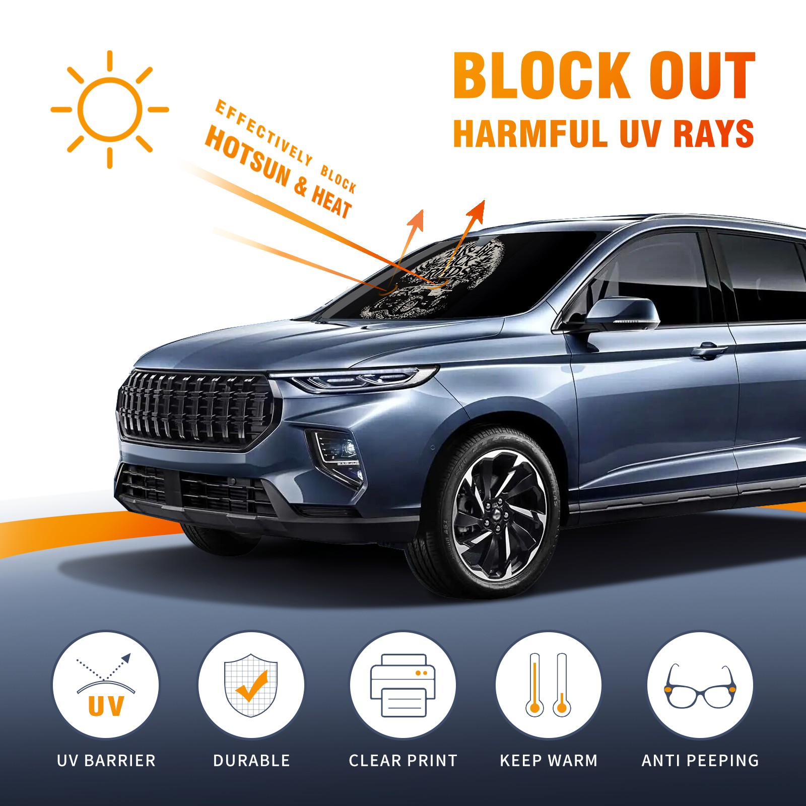• <p><strong>Cute Funny Car Windshield Sun Shades SUV Front Window Sunshade Covers</strong></p><p><br /></p><p><br /></p><p><strong>ABOUT THE CAR SUN SHADE.</strong></p><p><strong>Material:</strong> Our car sun shade is made of durable heat-resistant polyester material, which is lightweight, hold up well to repeated use.</p><p><strong>Size:</strong> Our car sun shade is 55x30 inches. It fits fit different types of vehicles, such as sedans or SUVs.</p><p><strong>Keeps car interior cooler in summer: </strong>The car sun shade can block the sun so it doesn’t heat up your car’s interior. The sun shade also prevents your steering wheel, console, seat belts, and upholstery from getting uncomfortably hot. It takes much less time for the air conditioning to cool down the car once you get inside.</p><p><strong>Protects electronics: </strong>The sun shield also protects the electronics in your car, such as the GPS device, DVD player, or CD player.</p><p><strong>Prevent fading:</strong> The windshield sun shade also blocks UV rays as the rays can make your car interior dashboard, console, and upholstery, and the steering wheel to fade.</p><p><strong>Easy to open and close:</strong> The car windshield sun visor is easy to install and storage.</p><p><br /></p><p><br /></p><p>The sunshade for car windshield fully protect your car suv pickup trucks from intense sun heat and UV rays, keeps your car interior cool even on the hottest days. No more getting into a steaming car that makes you sweaty and uncomfortable, enjoy a cool summer.</p>