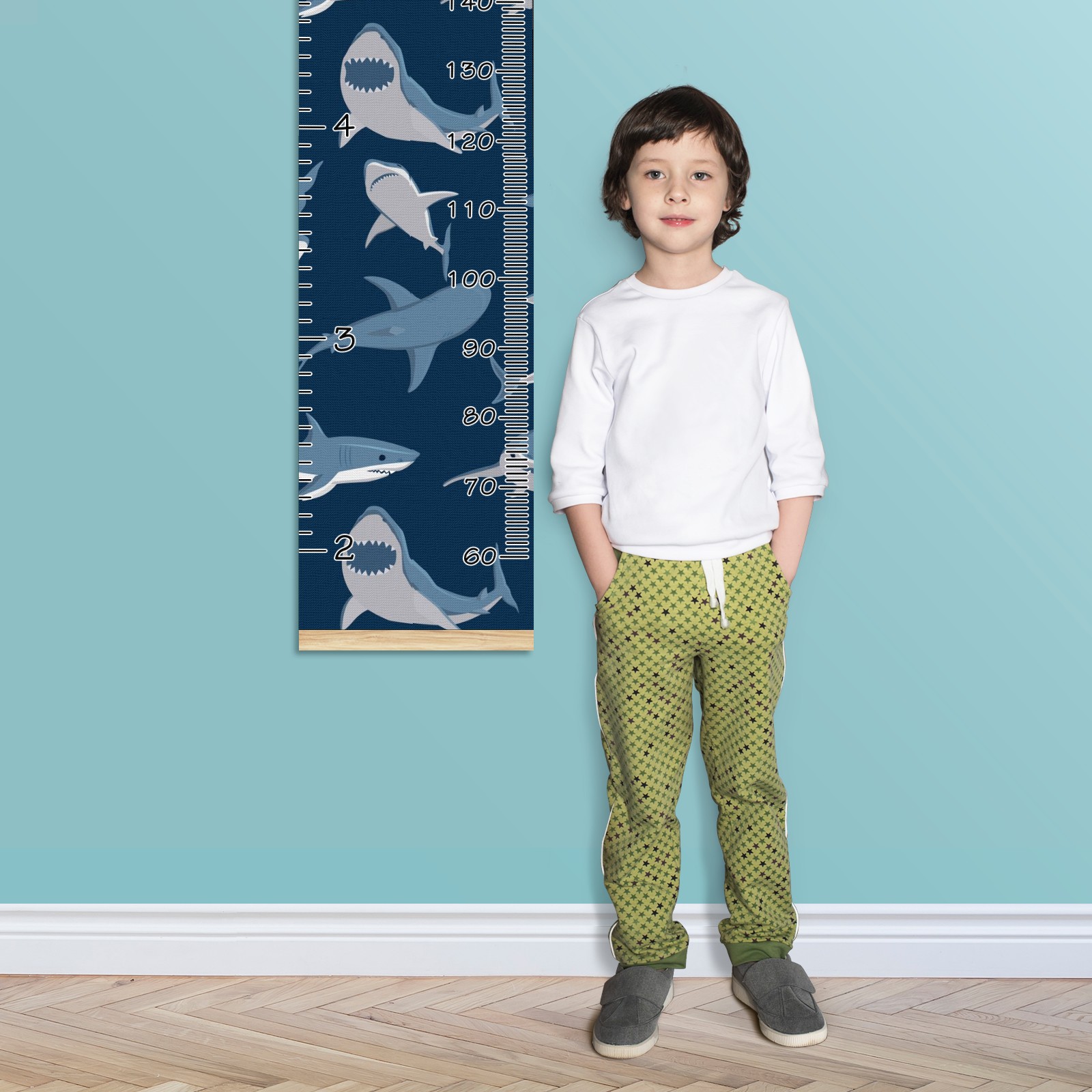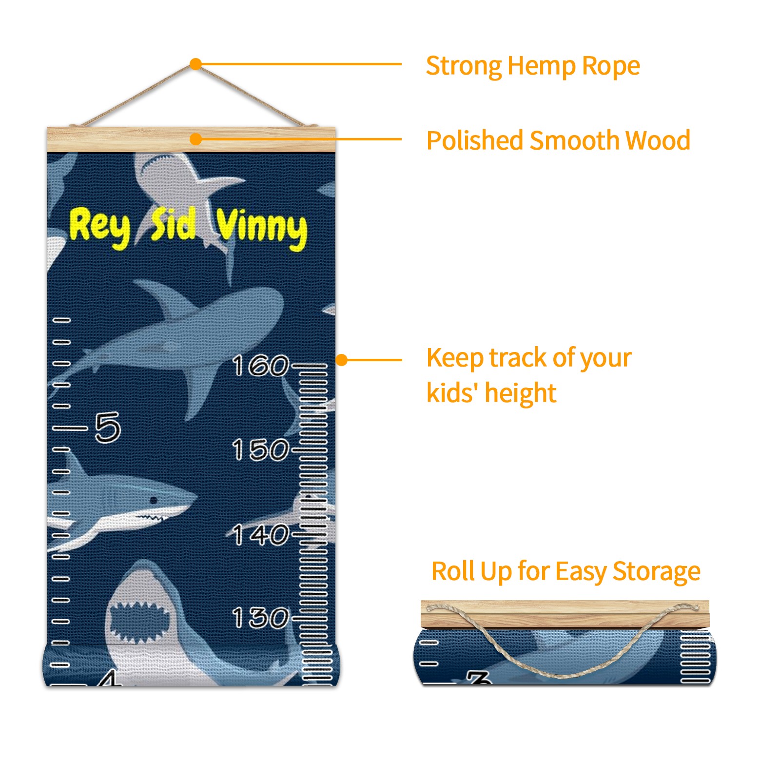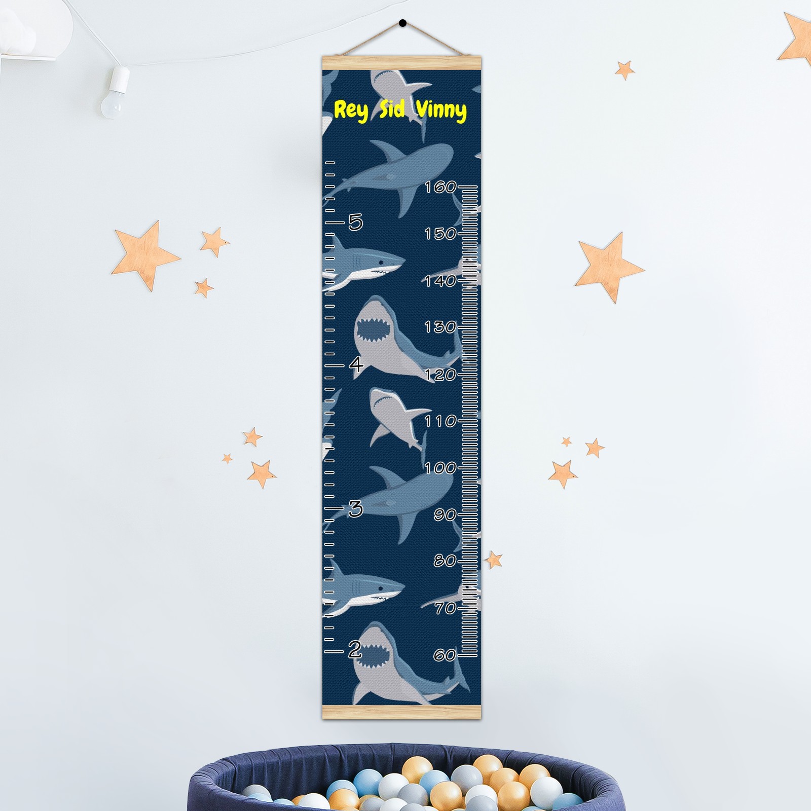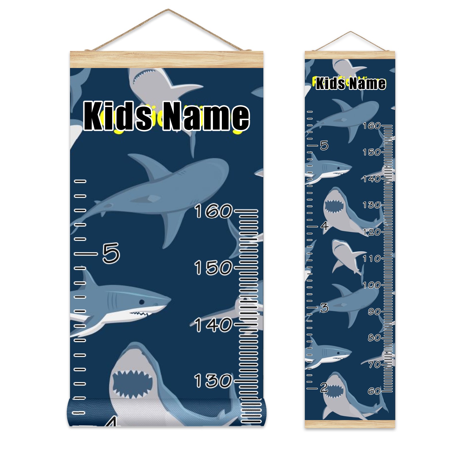 Personalized Kids Name Growth Chart Ruler for Wall Wood Frame Height Measure Chart 13.4x56 in Linen Hanging Height Growth Chart Shark Blue Seamless Pattern3.21 Kids Room Decor