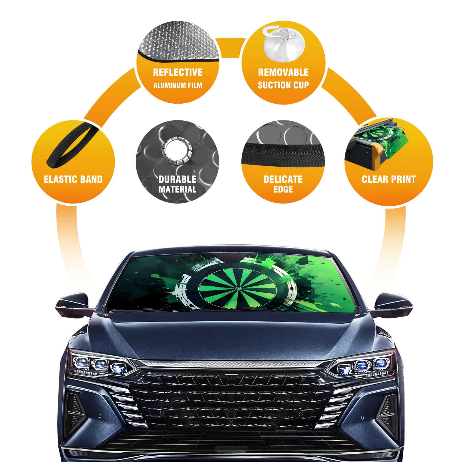 • Diameter /Size 63"L x 33.5"W Made from excellent materials which makes it sturdy and protects the car from the sun. Easy to use and pack. Makes the interior of the car cooler.You can easily stash the sunshade in the storage bag or store long term.It open and closes easy. Also the leather storage bag is durable and easy to put the umbrella back into.This windshield sunshade provides complete coverage and keeps your car interior cool under direct sun. It is easy to open and position under the windshield and around the rear-view mirror. Makes Your Car Easy To Identify, Perfect For Finding Your Car In Crowded Parking Lots And Garages.Great Choice: It Is A Great Gift For Dad, Boyfriend, Brother, Brother And Uncle, Friends, Classmates, Family And So On. Notice: Due To Difference Computer Monitors, The Color Maybe Slightly Different From Picture. As Different Measurement Methods, Measurement Data Will Float Within 2%.I Hope You Understand. If You Have Any Question About The Item Please Do Not Hesitate To Contact Us Immediately And We Will Give You A Satisfactory Reply Within 24 Hours.