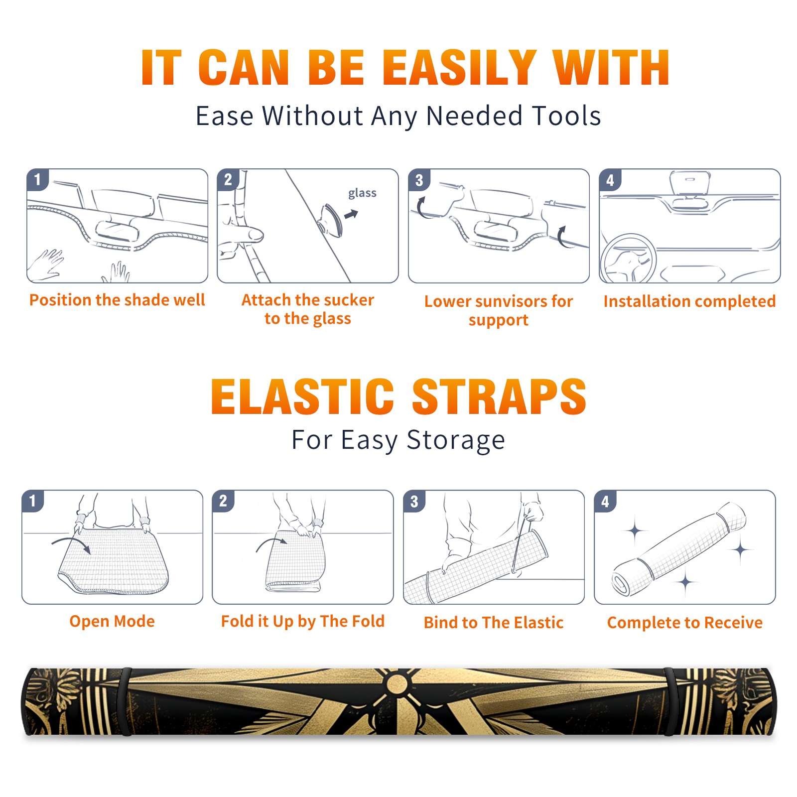 • Diameter /Size 63"L x 33.5"W Made from excellent materials which makes it sturdy and protects the car from the sun. Easy to use and pack. Makes the interior of the car cooler.You can easily stash the sunshade in the storage bag or store long term.It open and closes easy. Also the leather storage bag is durable and easy to put the umbrella back into.This windshield sunshade provides complete coverage and keeps your car interior cool under direct sun. It is easy to open and position under the windshield and around the rear-view mirror. Makes Your Car Easy To Identify, Perfect For Finding Your Car In Crowded Parking Lots And Garages.Great Choice: It Is A Great Gift For Dad, Boyfriend, Brother, Brother And Uncle, Friends, Classmates, Family And So On. Notice: Due To Difference Computer Monitors, The Color Maybe Slightly Different From Picture. As Different Measurement Methods, Measurement Data Will Float Within 2%.I Hope You Understand. If You Have Any Question About The Item Please Do Not Hesitate To Contact Us Immediately And We Will Give You A Satisfactory Reply Within 24 Hours.