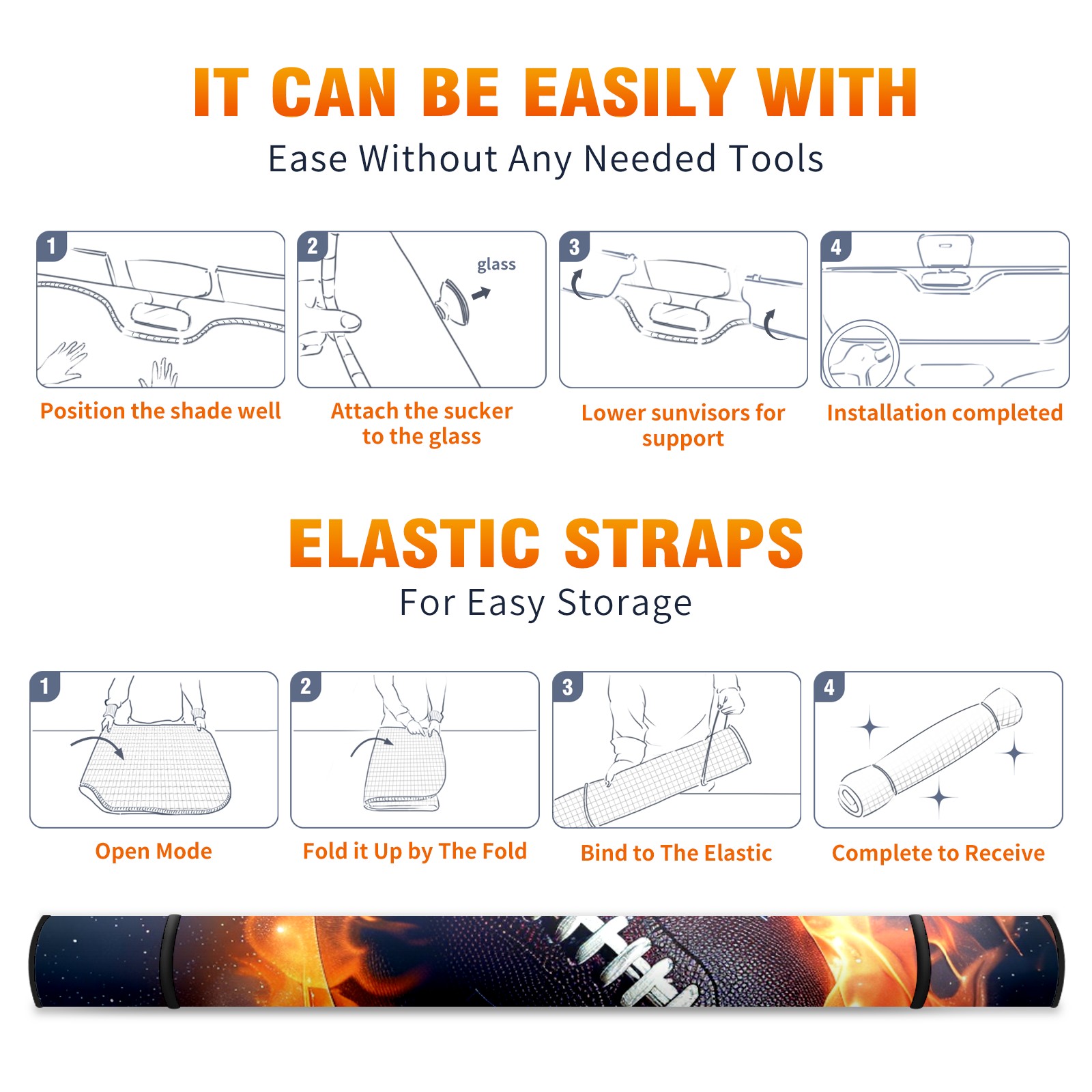Diameter /Size 63"L x 33.5"W Made from excellent materials which makes it sturdy and protects the car from the sun. Easy to use and pack. Makes the interior of the car cooler.You can easily stash the sunshade in the storage bag or store long term.It open and closes easy. Also the leather storage bag is durable and easy to put the umbrella back into.This windshield sunshade provides complete coverage and keeps your car interior cool under direct sun. It is easy to open and position under the windshield and around the rear-view mirror. Makes Your Car Easy To Identify, Perfect For Finding Your Car In Crowded Parking Lots And Garages.Great Choice: It Is A Great Gift For Dad, Boyfriend, Brother, Brother And Uncle, Friends, Classmates, Family And So On. Notice: Due To Difference Computer Monitors, The Color Maybe Slightly Different From Picture. As Different Measurement Methods, Measurement Data Will Float Within 2%.I Hope You Understand. If You Have Any Question About The Item Please Do Not Hesitate To Contact Us Immediately And We Will Give You A Satisfactory Reply Within 24 Hours.