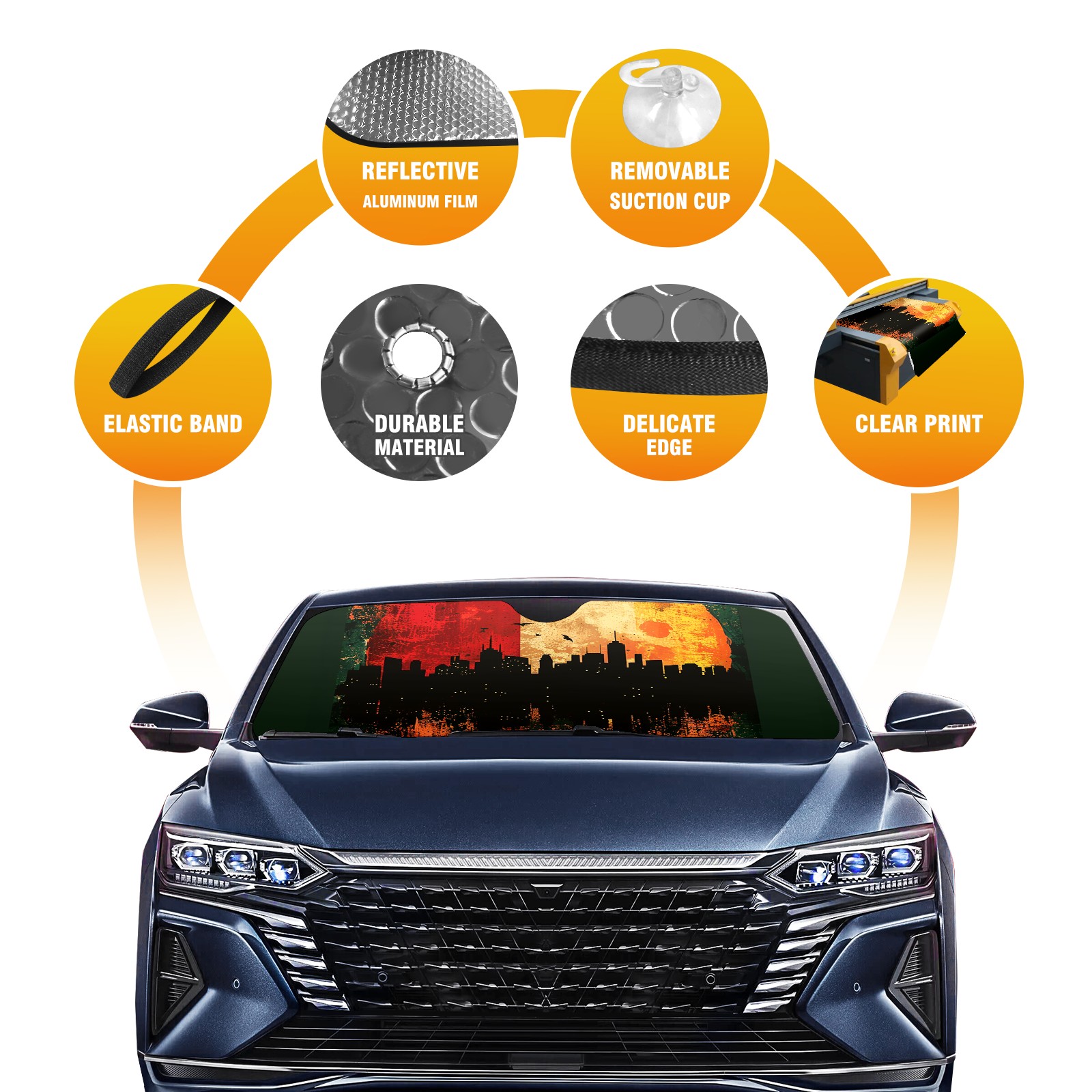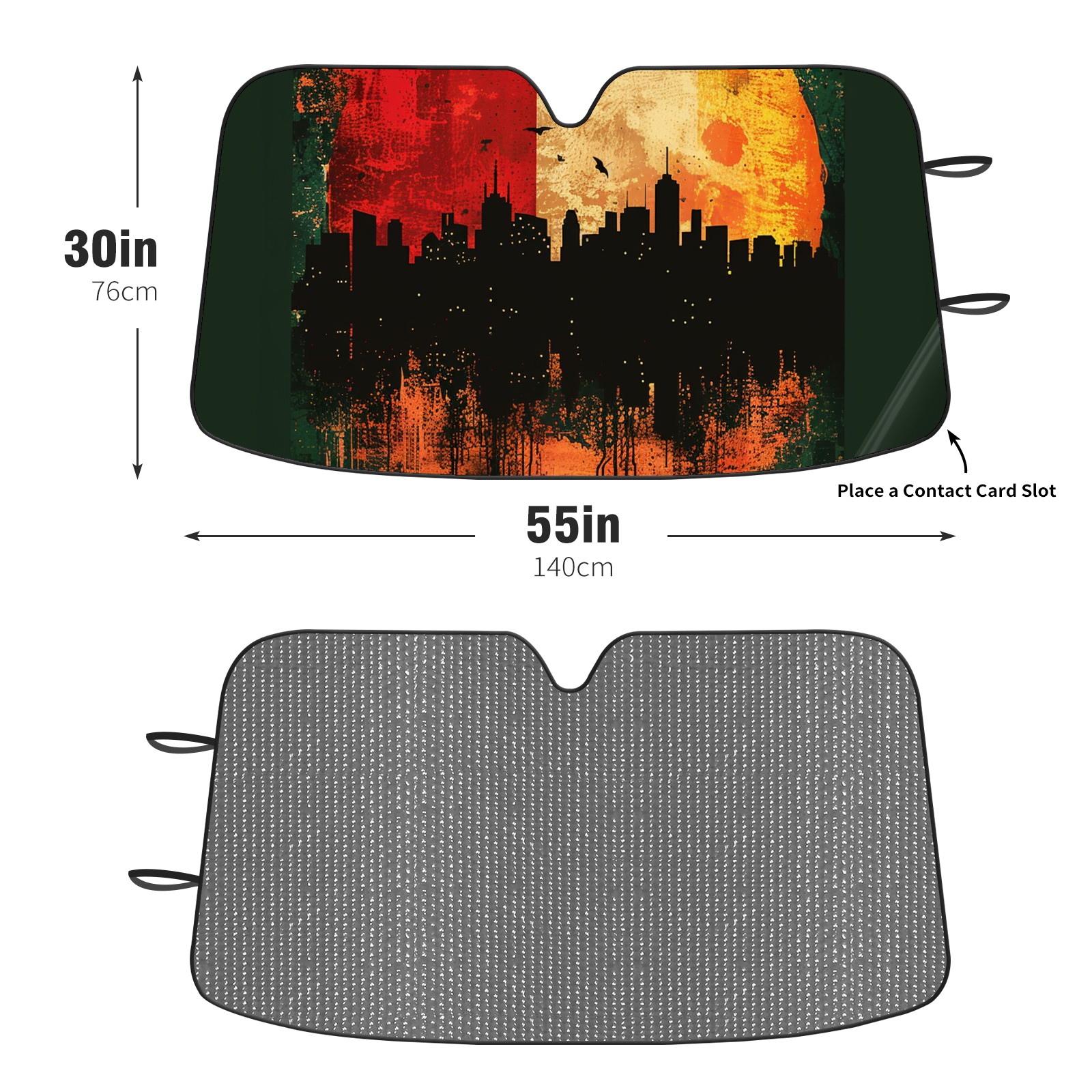 Diameter /Size 63"L x 33.5"W Made from excellent materials which makes it sturdy and protects the car from the sun. Easy to use and pack. Makes the interior of the car cooler.You can easily stash the sunshade in the storage bag or store long term.It open and closes easy. Also the leather storage bag is durable and easy to put the umbrella back into.This windshield sunshade provides complete coverage and keeps your car interior cool under direct sun. It is easy to open and position under the windshield and around the rear-view mirror. Makes Your Car Easy To Identify, Perfect For Finding Your Car In Crowded Parking Lots And Garages.Great Choice: It Is A Great Gift For Dad, Boyfriend, Brother, Brother And Uncle, Friends, Classmates, Family And So On. Notice: Due To Difference Computer Monitors, The Color Maybe Slightly Different From Picture. As Different Measurement Methods, Measurement Data Will Float Within 2%.I Hope You Understand. If You Have Any Question About The Item Please Do Not Hesitate To Contact Us Immediately And We Will Give You A Satisfactory Reply Within 24 Hours.
