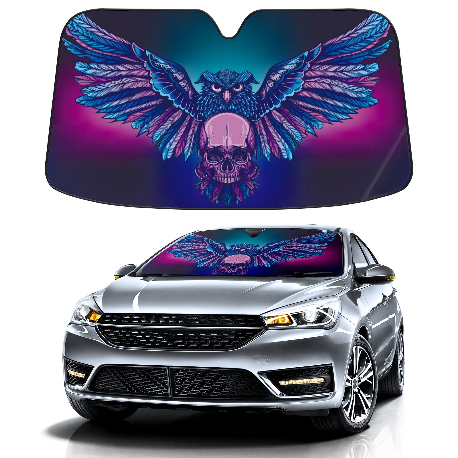 Car Windshield Sun Shade For Front Window Cool Owl Skull Head Foldable Vehicle Windshield Car Sun Visor Covers Automotive Window Protector Car Camping Privacy Sun Blocker