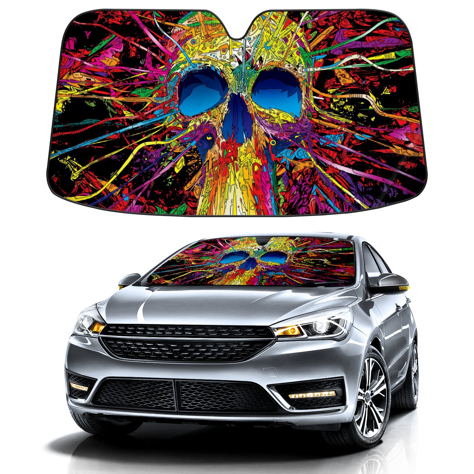 Car Windshield Sun Shade For Front Window Colorful Skull Foldable Vehicle Windshield Car Sun Visor Covers Automotive Window Protector Car Camping Privacy Sun Blocker