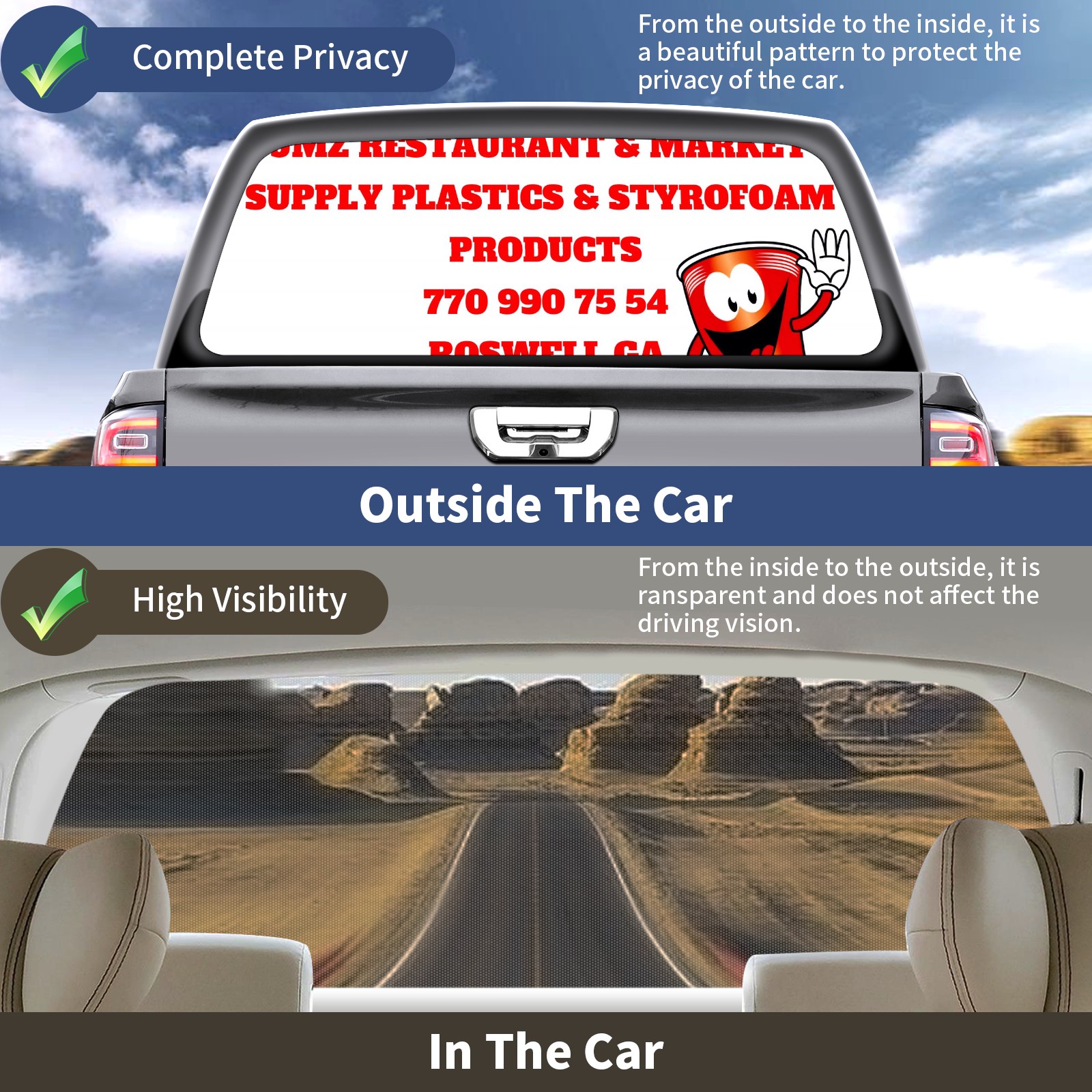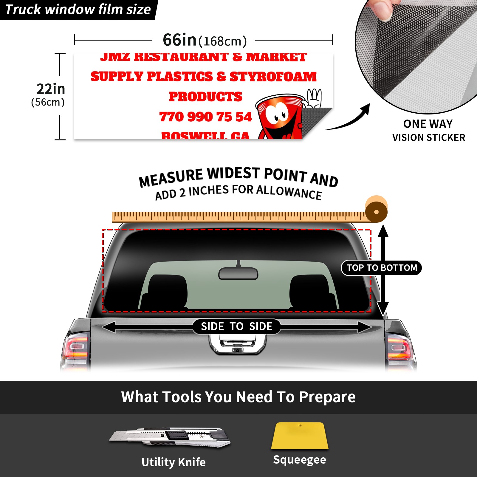 <p><strong>Truck Rear Window Graphics Decals Pickup Trucks Back Window Film Stickers 66" x 22" Perforated Vinyl Wrap Stickers Decorations for Car Rear Window</strong></p><p><strong><br /></strong></p><p><strong>Features :</strong></p><p>- Size of the rear window decals for trucks is 66x22 Inches (168x56cm).</p><p>- High quality perforated vinyl window film, one way vision sticker.</p><p>- Perforated is see through from the inside but not from outside.</p><p>- Clear printing, waterproof and durable.</p><p>- The car back window graphics stickers fits most truck and makes your vehicle more beautiful.&nbsp;</p><p><br /></p><p><strong>【Installation Instructions】</strong></p><p><strong>1. CLEAN SURFACE -</strong> Clean the rear window thoroughly and make sure the surface clean.</p><p><strong>2. STICK THE DECALS -</strong> Tear off the paper on the back and stick the decal on the window.</p><p><strong>3. SCRAPE OFF AIR BUBBLES -</strong> Use a squeegee or other card to scrape off the excess air bubbles.</p><p><strong>4. TRIM THE EXCESS -</strong> Use a knife to cut off the excess stickers of the window, finally complete.</p><p><br /></p><p>1. Please measure the size before purchasing, back window graphics decal for truck can be cut to your desired size.</p><p>2.The graphics stickers for truck back window is a great gift for yourself also can as a birthday / halloween / christmas gift for your friends and family.</p>