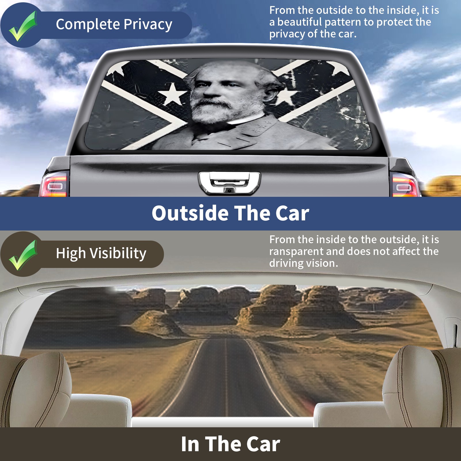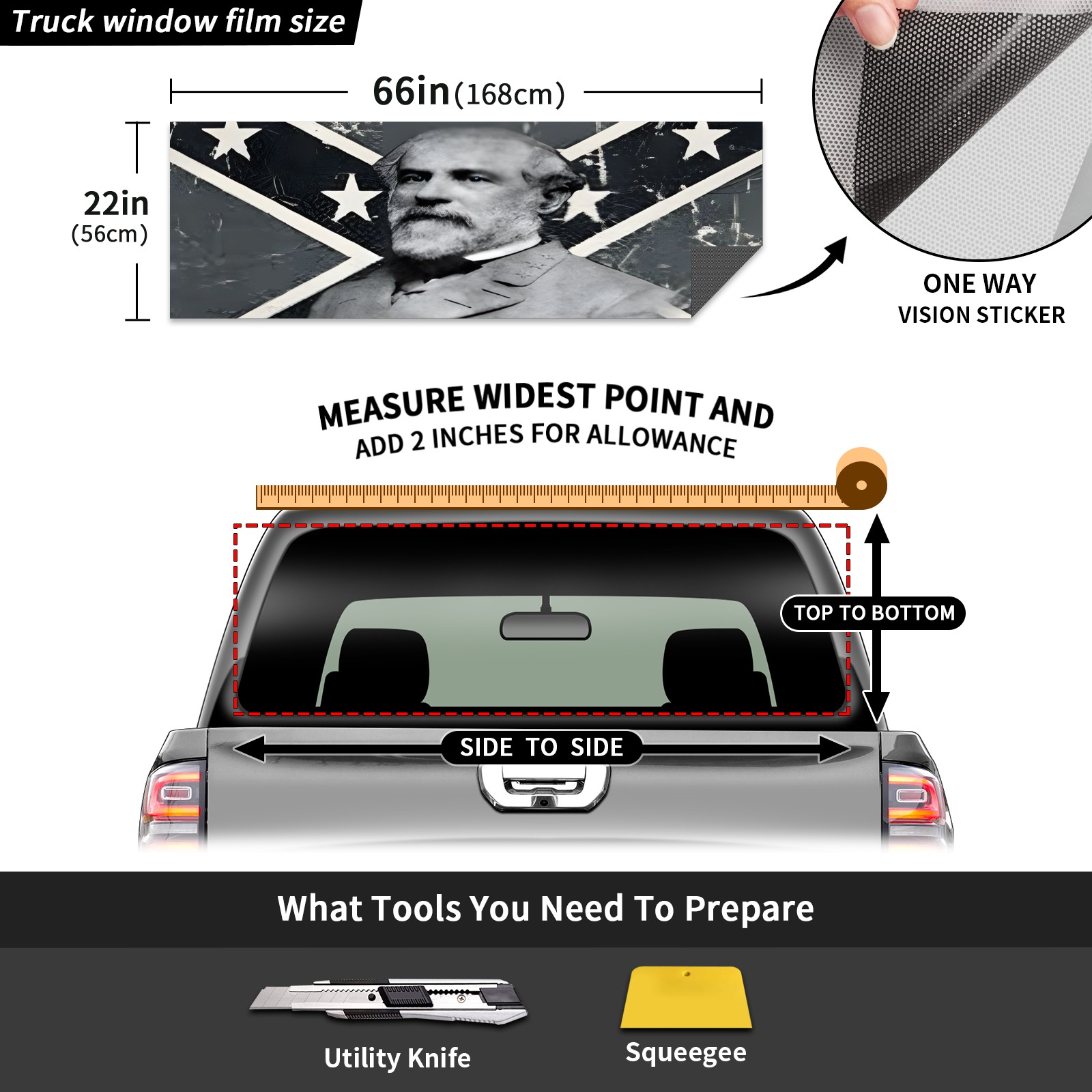 <p><strong>Truck Rear Window Graphics Decals Pickup Trucks Back Window Film Stickers 66" x 22" Perforated Vinyl Wrap Stickers Decorations for Car Rear Window</strong></p><p><strong><br /></strong></p><p><strong>Features :</strong></p><p>- Size of the rear window decals for trucks is 66x22 Inches (168x56cm).</p><p>- High quality perforated vinyl window film, one way vision sticker.</p><p>- Perforated is see through from the inside but not from outside.</p><p>- Clear printing, waterproof and durable.</p><p>- The car back window graphics stickers fits most truck and makes your vehicle more beautiful.&nbsp;</p><p><br /></p><p><strong>【Installation Instructions】</strong></p><p><strong>1. CLEAN SURFACE -</strong> Clean the rear window thoroughly and make sure the surface clean.</p><p><strong>2. STICK THE DECALS -</strong> Tear off the paper on the back and stick the decal on the window.</p><p><strong>3. SCRAPE OFF AIR BUBBLES -</strong> Use a squeegee or other card to scrape off the excess air bubbles.</p><p><strong>4. TRIM THE EXCESS -</strong> Use a knife to cut off the excess stickers of the window, finally complete.</p><p><br /></p><p>1. Please measure the size before purchasing, back window graphics decal for truck can be cut to your desired size.</p><p>2.The graphics stickers for truck back window is a great gift for yourself also can as a birthday / halloween / christmas gift for your friends and family.</p>