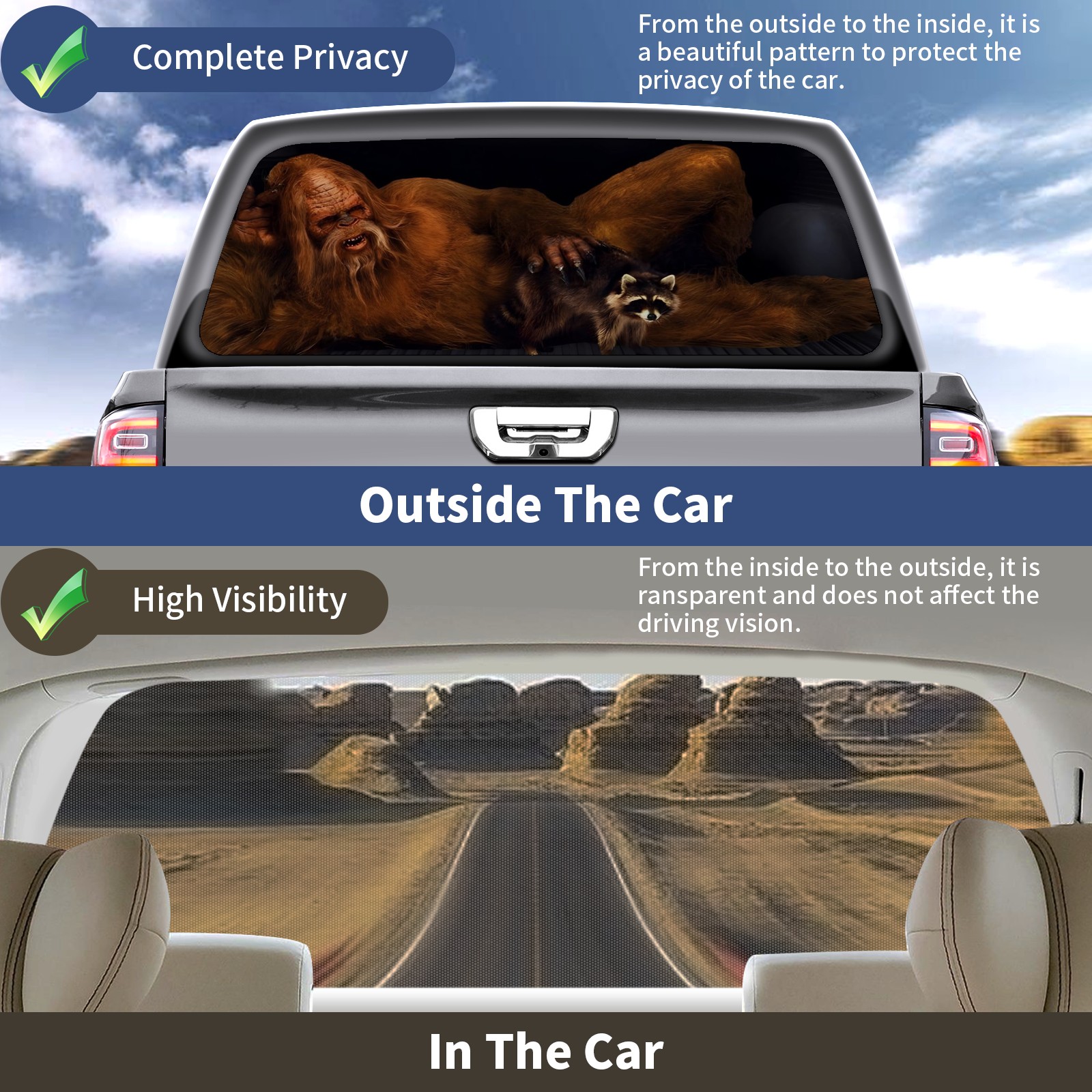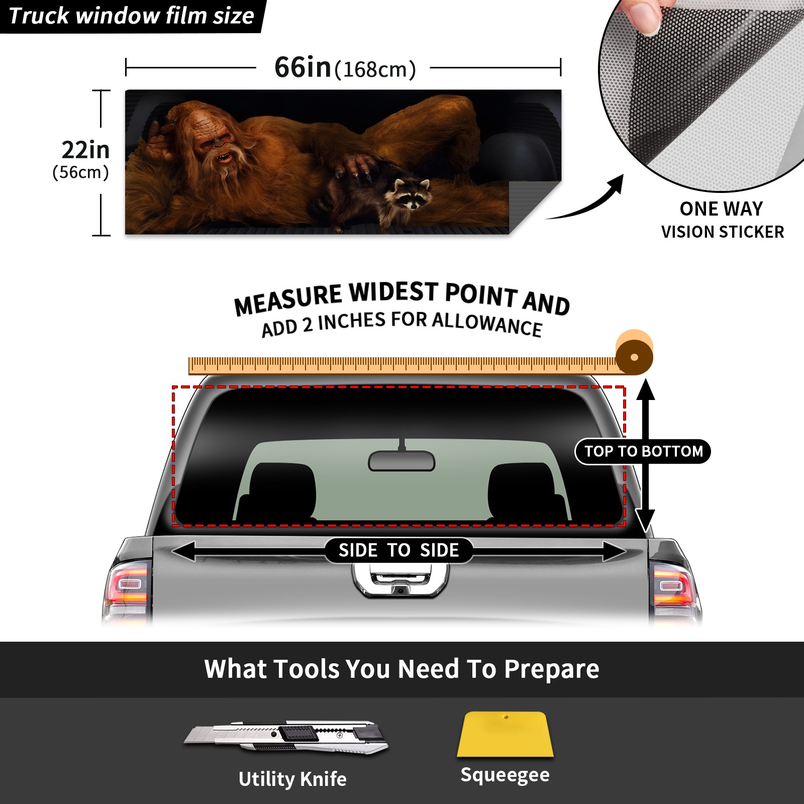<p><strong>Truck Rear Window Graphics Decals Pickup Trucks Back Window Film Stickers 66" x 22" Perforated Vinyl Wrap Stickers Decorations for Car Rear Window</strong></p><p><strong><br /></strong></p><p><strong>Features :</strong></p><p>- Size of the rear window decals for trucks is 66x22 Inches (168x56cm).</p><p>- High quality perforated vinyl window film, one way vision sticker.</p><p>- Perforated is see through from the inside but not from outside.</p><p>- Clear printing, waterproof and durable.</p><p>- The car back window graphics stickers fits most truck and makes your vehicle more beautiful. </p><p><br /></p><p><strong>【Installation Instructions】</strong></p><p><strong>1. CLEAN SURFACE -</strong> Clean the rear window thoroughly and make sure the surface clean.</p><p><strong>2. STICK THE DECALS -</strong> Tear off the paper on the back and stick the decal on the window.</p><p><strong>3. SCRAPE OFF AIR BUBBLES -</strong> Use a squeegee or other card to scrape off the excess air bubbles.</p><p><strong>4. TRIM THE EXCESS -</strong> Use a knife to cut off the excess stickers of the window, finally complete.</p><p><br /></p><p>1. Please measure the size before purchasing, back window graphics decal for truck can be cut to your desired size.</p><p>2.The graphics stickers for truck back window is a great gift for yourself also can as a birthday / halloween / christmas gift for your friends and family.</p>