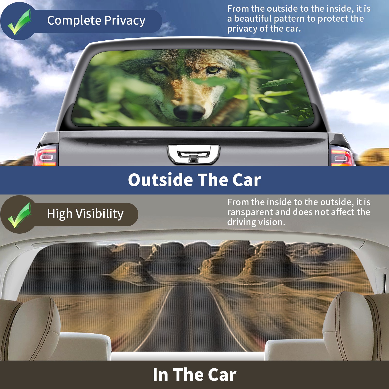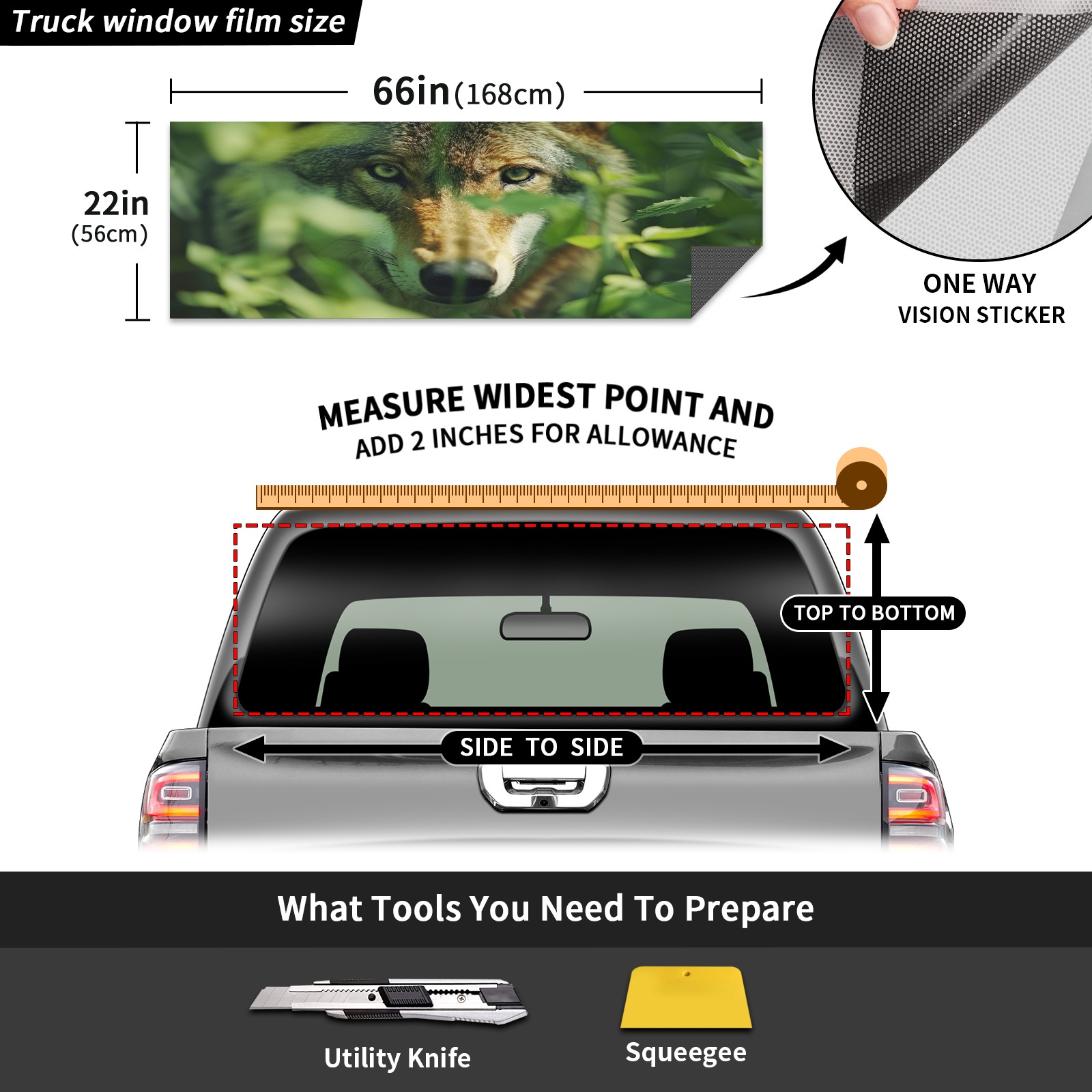 <p><strong>Truck Rear Window Graphics Decals Pickup Trucks Back Window Film Stickers 66" x 22" Perforated Vinyl Wrap Stickers Decorations for Car Rear Window</strong></p><p><strong><br /></strong></p><p><strong>Features :</strong></p><p>- Size of the rear window decals for trucks is 66x22 Inches (168x56cm).</p><p>- High quality perforated vinyl window film, one way vision sticker.</p><p>- Perforated is see through from the inside but not from outside.</p><p>- Clear printing, waterproof and durable.</p><p>- The car back window graphics stickers fits most truck and makes your vehicle more beautiful.&nbsp;</p><p><br /></p><p><strong>【Installation Instructions】</strong></p><p><strong>1. CLEAN SURFACE -</strong> Clean the rear window thoroughly and make sure the surface clean.</p><p><strong>2. STICK THE DECALS -</strong> Tear off the paper on the back and stick the decal on the window.</p><p><strong>3. SCRAPE OFF AIR BUBBLES -</strong> Use a squeegee or other card to scrape off the excess air bubbles.</p><p><strong>4. TRIM THE EXCESS -</strong> Use a knife to cut off the excess stickers of the window, finally complete.</p><p><br /></p><p>1. Please measure the size before purchasing, back window graphics decal for truck can be cut to your desired size.</p><p>2.The graphics stickers for truck back window is a great gift for yourself also can as a birthday / halloween / christmas gift for your friends and family.</p>