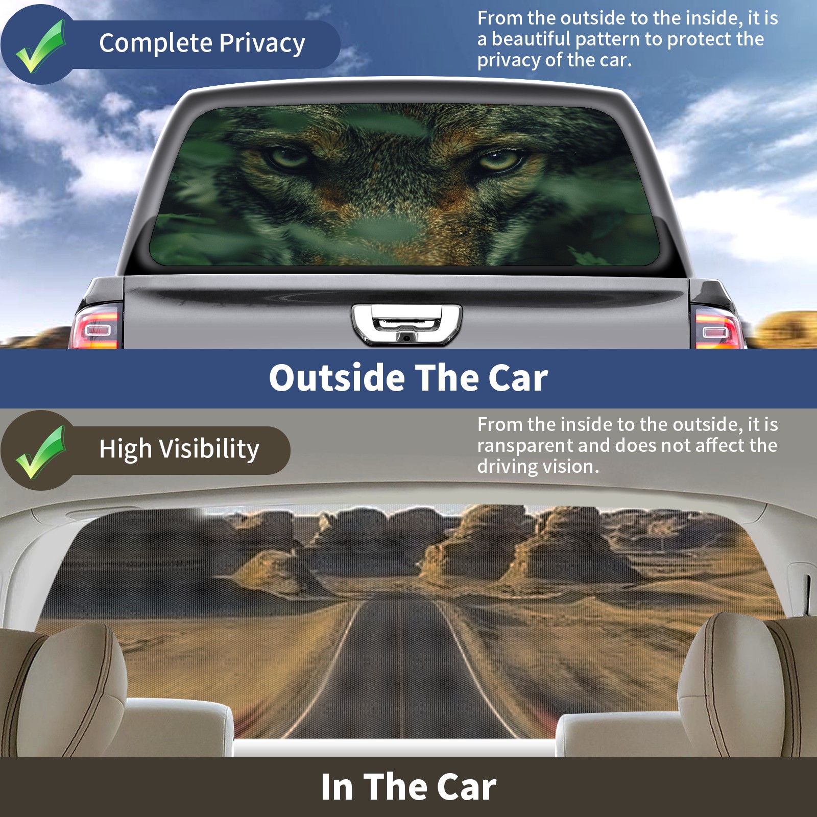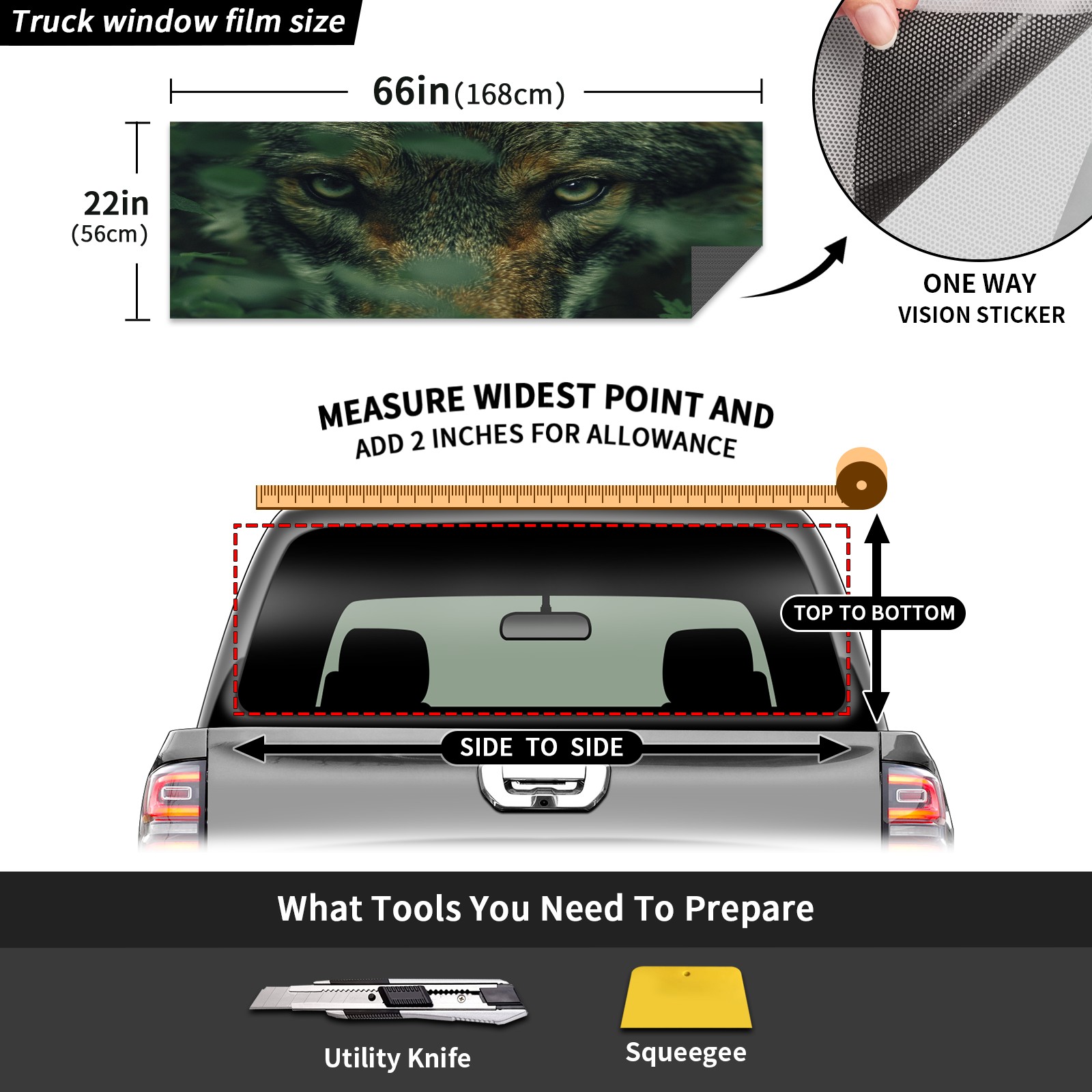 <p><strong>Truck Rear Window Graphics Decals Pickup Trucks Back Window Film Stickers 66" x 22" Perforated Vinyl Wrap Stickers Decorations for Car Rear Window</strong></p><p><strong><br /></strong></p><p><strong>Features :</strong></p><p>- Size of the rear window decals for trucks is 66x22 Inches (168x56cm).</p><p>- High quality perforated vinyl window film, one way vision sticker.</p><p>- Perforated is see through from the inside but not from outside.</p><p>- Clear printing, waterproof and durable.</p><p>- The car back window graphics stickers fits most truck and makes your vehicle more beautiful.&nbsp;</p><p><br /></p><p><strong>【Installation Instructions】</strong></p><p><strong>1. CLEAN SURFACE -</strong> Clean the rear window thoroughly and make sure the surface clean.</p><p><strong>2. STICK THE DECALS -</strong> Tear off the paper on the back and stick the decal on the window.</p><p><strong>3. SCRAPE OFF AIR BUBBLES -</strong> Use a squeegee or other card to scrape off the excess air bubbles.</p><p><strong>4. TRIM THE EXCESS -</strong> Use a knife to cut off the excess stickers of the window, finally complete.</p><p><br /></p><p>1. Please measure the size before purchasing, back window graphics decal for truck can be cut to your desired size.</p><p>2.The graphics stickers for truck back window is a great gift for yourself also can as a birthday / halloween / christmas gift for your friends and family.</p>