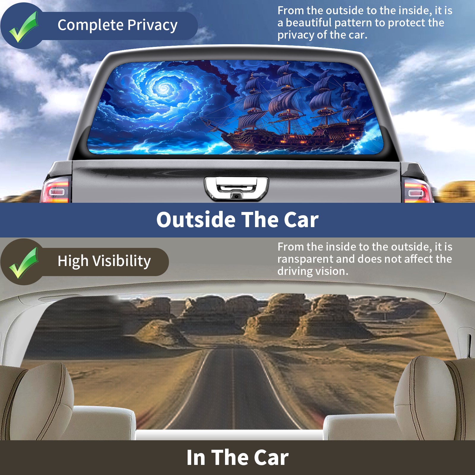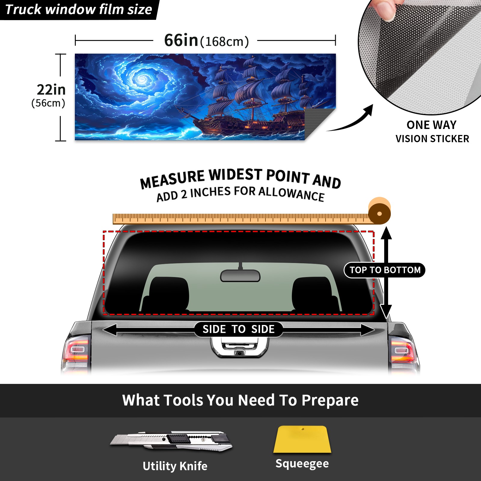 <p><strong>Truck Rear Window Graphics Decals Pickup Trucks Back Window Film Stickers 66" x 22" Perforated Vinyl Wrap Stickers Decorations for Car Rear Window</strong></p><p><strong><br /></strong></p><p><strong>Features :</strong></p><p>- Size of the rear window decals for trucks is 66x22 Inches (168x56cm).</p><p>- High quality perforated vinyl window film, one way vision sticker.</p><p>- Perforated is see through from the inside but not from outside.</p><p>- Clear printing, waterproof and durable.</p><p>- The car back window graphics stickers fits most truck and makes your vehicle more beautiful. </p><p><br /></p><p><strong>【Installation Instructions】</strong></p><p><strong>1. CLEAN SURFACE -</strong> Clean the rear window thoroughly and make sure the surface clean.</p><p><strong>2. STICK THE DECALS -</strong> Tear off the paper on the back and stick the decal on the window.</p><p><strong>3. SCRAPE OFF AIR BUBBLES -</strong> Use a squeegee or other card to scrape off the excess air bubbles.</p><p><strong>4. TRIM THE EXCESS -</strong> Use a knife to cut off the excess stickers of the window, finally complete.</p><p><br /></p><p>1. Please measure the size before purchasing, back window graphics decal for truck can be cut to your desired size.</p><p>2.The graphics stickers for truck back window is a great gift for yourself also can as a birthday / halloween / christmas gift for your friends and family.</p>
