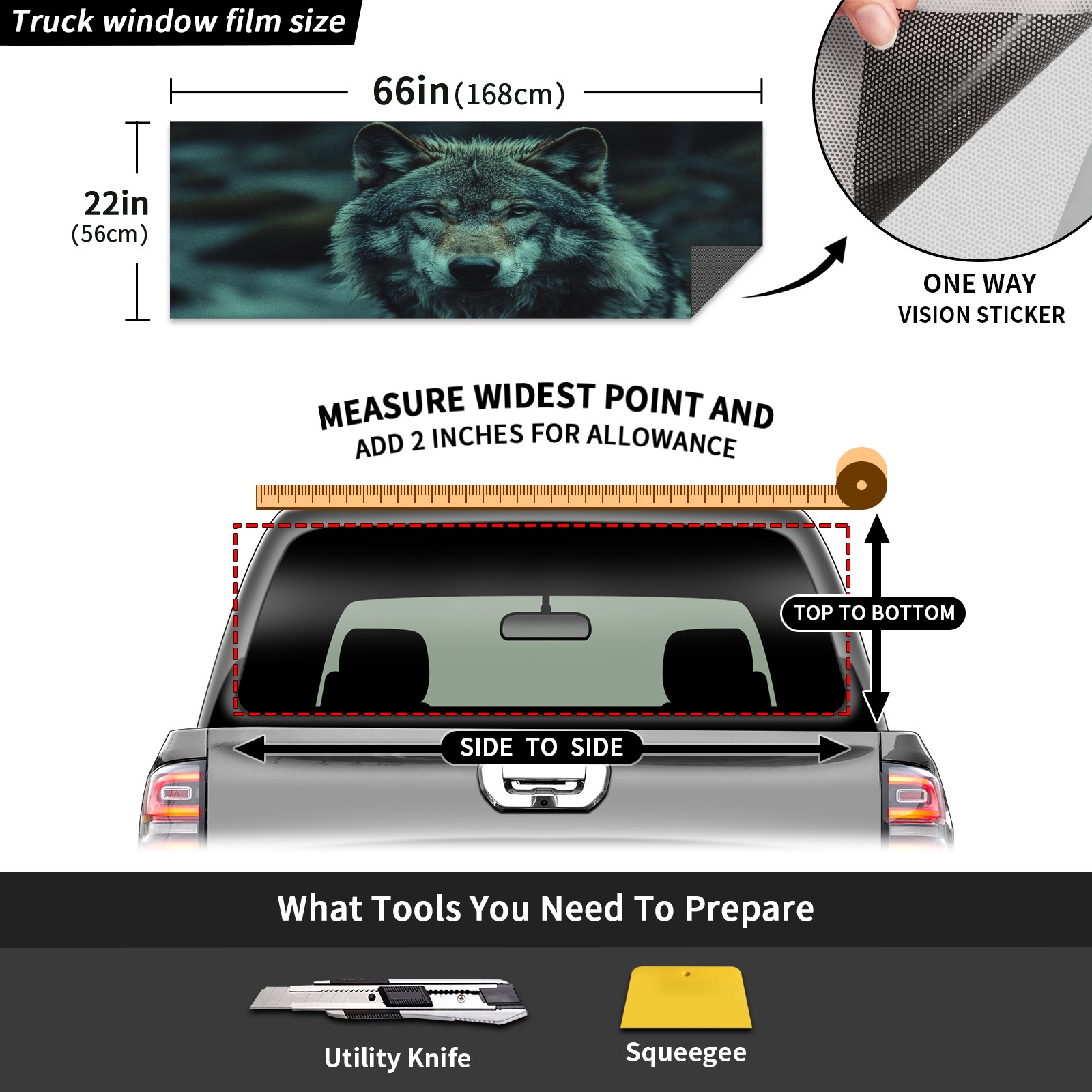 <p><strong>Truck Rear Window Graphics Decals Pickup Trucks Back Window Film Stickers 66" x 22" Perforated Vinyl Wrap Stickers Decorations for Car Rear Window</strong></p><p><strong><br /></strong></p><p><strong>Features :</strong></p><p>- Size of the rear window decals for trucks is 66x22 Inches (168x56cm).</p><p>- High quality perforated vinyl window film, one way vision sticker.</p><p>- Perforated is see through from the inside but not from outside.</p><p>- Clear printing, waterproof and durable.</p><p>- The car back window graphics stickers fits most truck and makes your vehicle more beautiful.&nbsp;</p><p><br /></p><p><strong>【Installation Instructions】</strong></p><p><strong>1. CLEAN SURFACE -</strong> Clean the rear window thoroughly and make sure the surface clean.</p><p><strong>2. STICK THE DECALS -</strong> Tear off the paper on the back and stick the decal on the window.</p><p><strong>3. SCRAPE OFF AIR BUBBLES -</strong> Use a squeegee or other card to scrape off the excess air bubbles.</p><p><strong>4. TRIM THE EXCESS -</strong> Use a knife to cut off the excess stickers of the window, finally complete.</p><p><br /></p><p>1. Please measure the size before purchasing, back window graphics decal for truck can be cut to your desired size.</p><p>2.The graphics stickers for truck back window is a great gift for yourself also can as a birthday / halloween / christmas gift for your friends and family.</p>