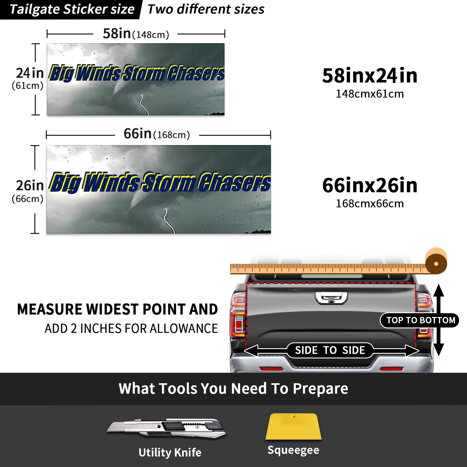 <p><strong>Truck Tailgate Wraps Vinyl Graphic Decal Sticker Pickup Rear Tailgate Graphics Wrap for Truck Pickup Car Camper for Men and Women</strong></p><p>Size:</p><p>66″(L) x 26″(W) (168cm x 66cm)</p><p>58″(L) x 24″(W) (148cm x 61cm)</p><p>Material: PVC Vinyl</p><p>Applicable Places: Truck Tailgate</p><p>Shape: Banner</p><p>Package Includes: 1* Vinyl Decal.</p><p>Please measure your tailgate before ordering to make sure the provided size will fit correctly.</p><p><br /></p><p>- Our pickup tailgate wraps are trimmable so you can fit them to your size by trimming them according to the measurements. Our tailgate stickers are digitally printed on professinoal high quality vinyls, give an impressive HD look and vibrant, long lasting colors.</p><p>- This graphic decals for the truck tailgate is made of PVC vinyl material to provide durability against weather and dust. Waterproof and weather-resistant. It can last up for a long time without fading.</p><p>- The funny and cute tailgates graphics stickers made to fit most pickup trucks camper, you can put it on the front of vehicle or tailgate.</p><p>- Truck tailgates graphics wraps are the perfect spot to add character look to your drive vehilcle, get a lot of attention. Easy peel and stick installation. Place on the front, left, lower, rear, right, upper of the truck.</p>