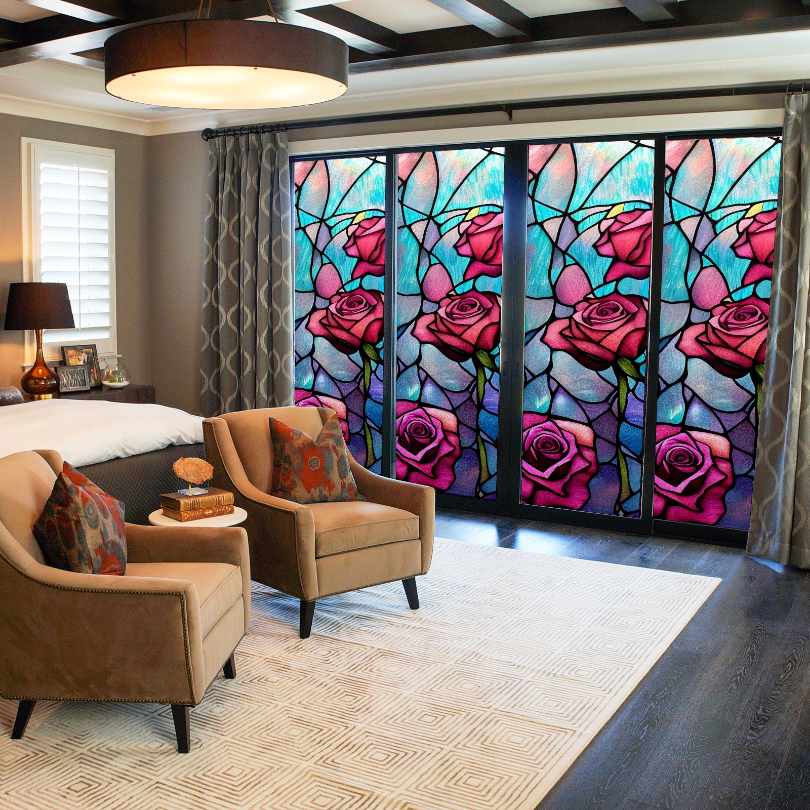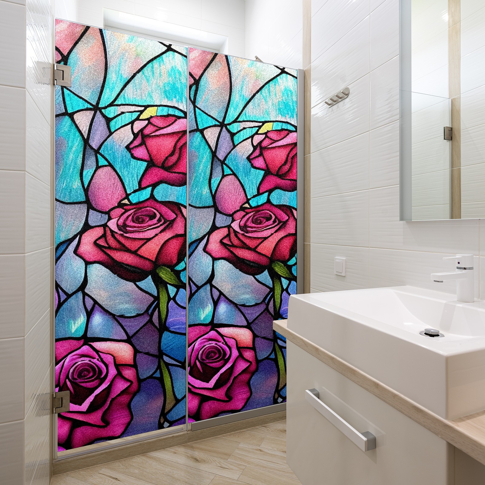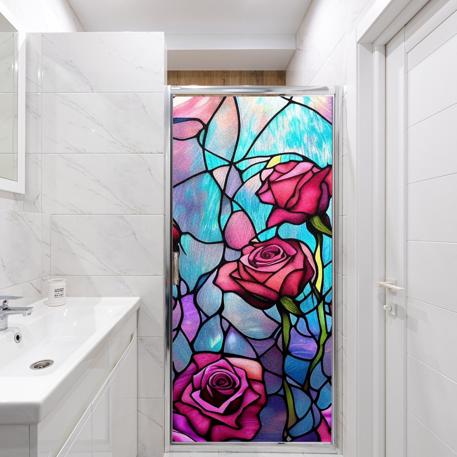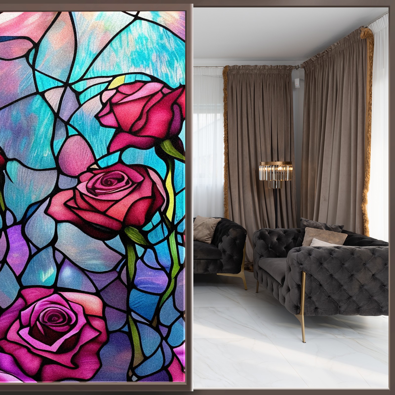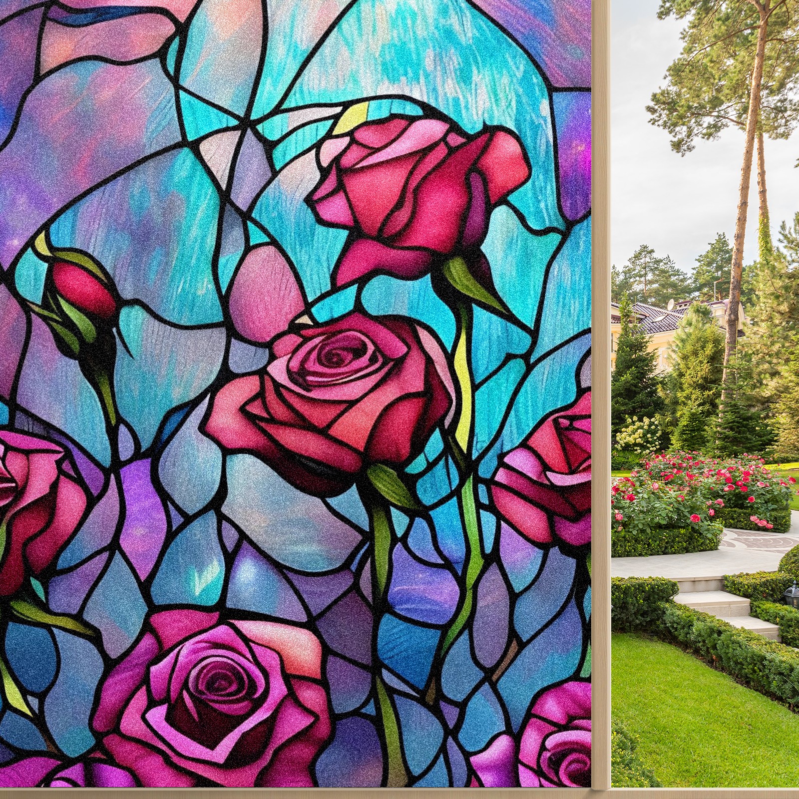 Static Cling Decorative Window Film Frosted Privacy Film Window Clings for Glass Windows No Glue Window Sticker for Bathroom Bedroom Office Stained Glass Roses
