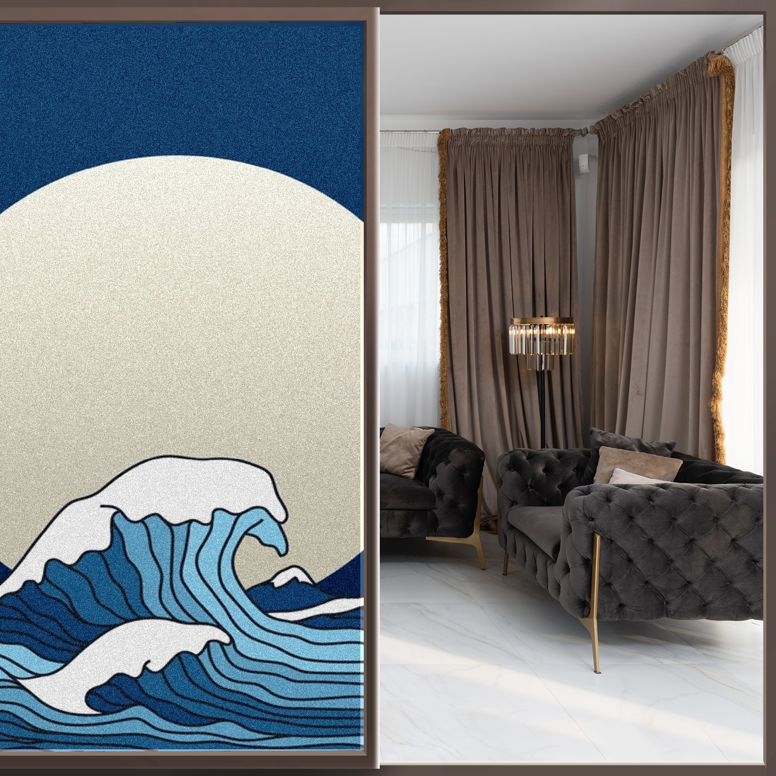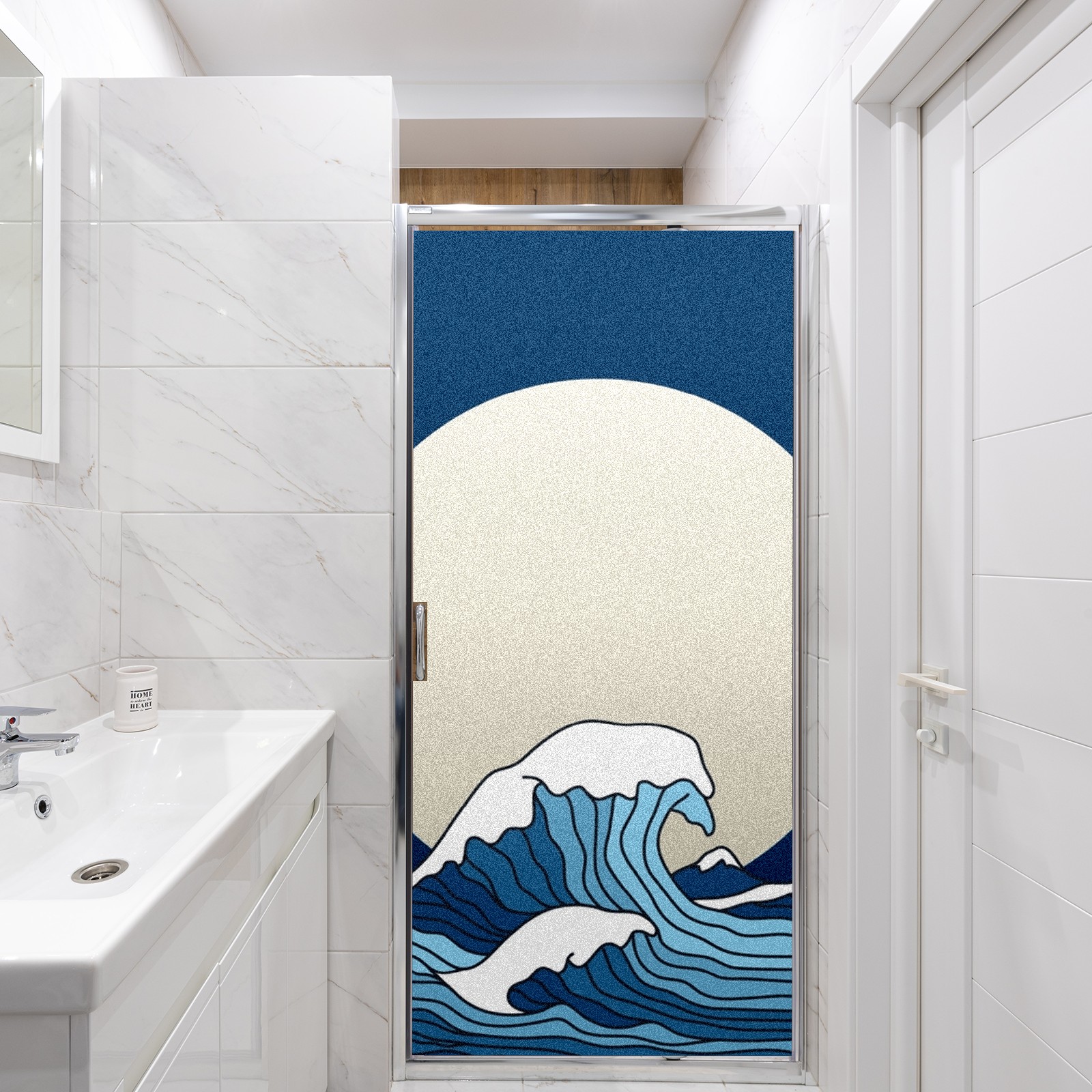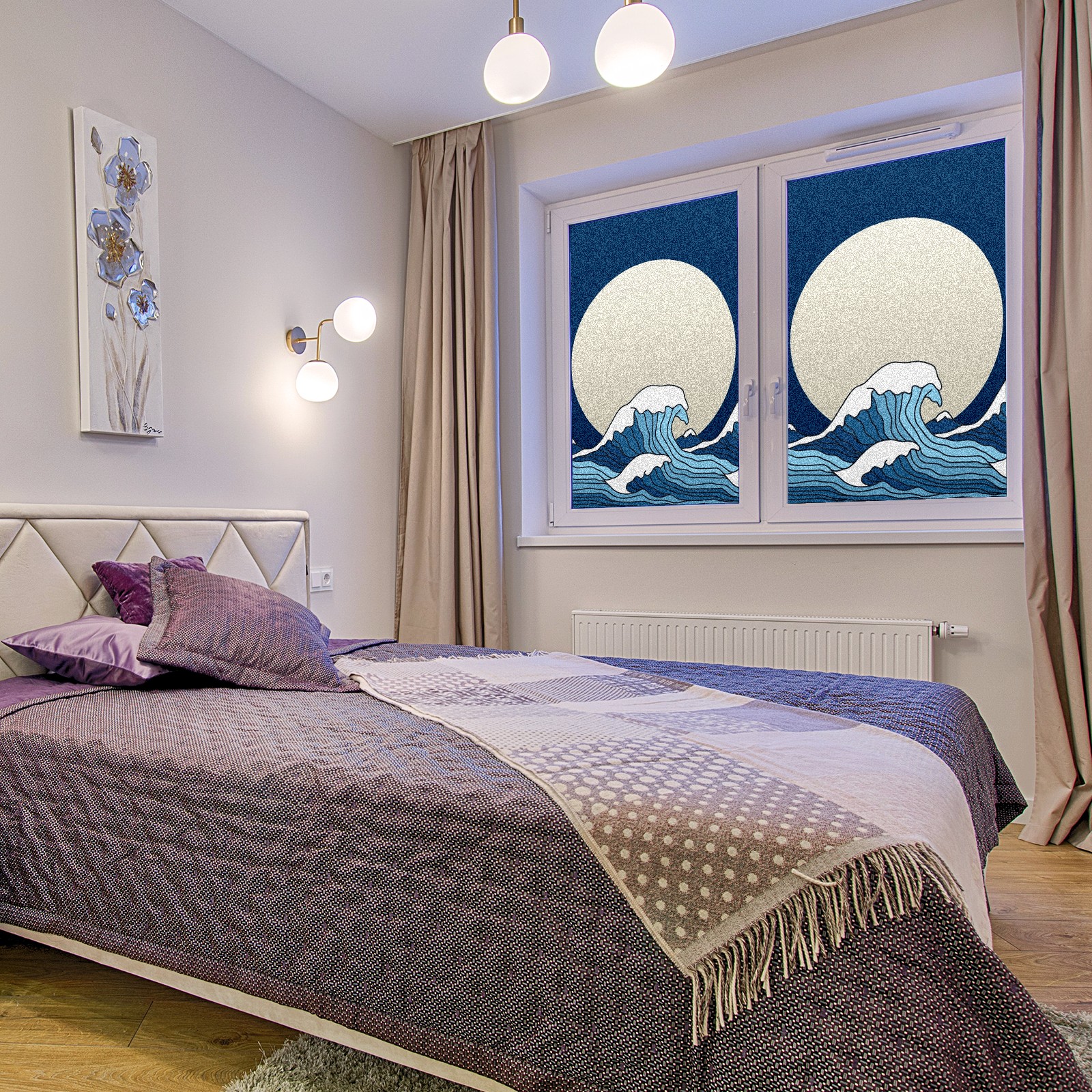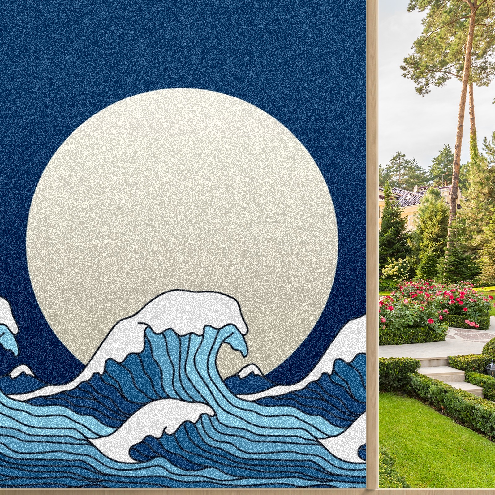 Static Cling Decorative Window Film Frosted Privacy Film Window Clings for Glass Windows No Glue Window Sticker for Bathroom Bedroom Office Sea Wave Moon