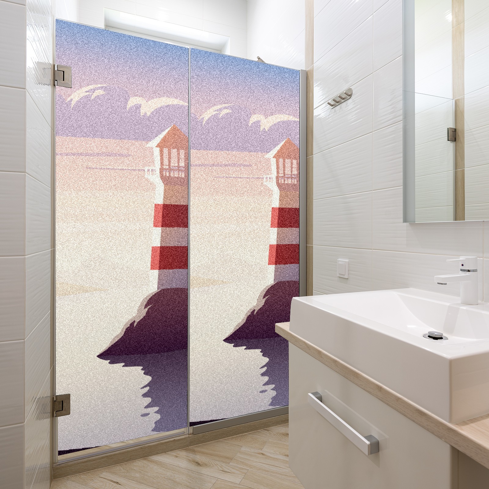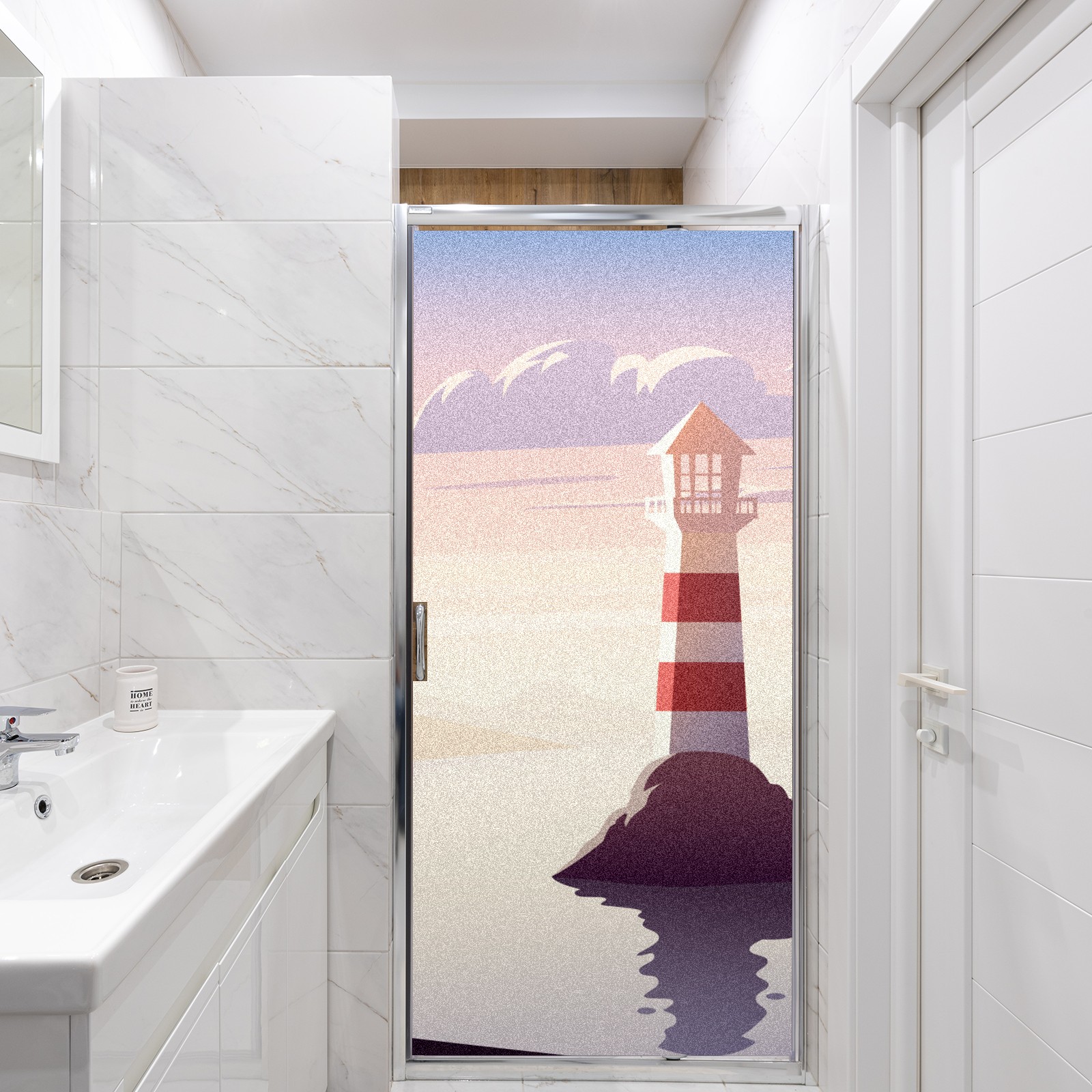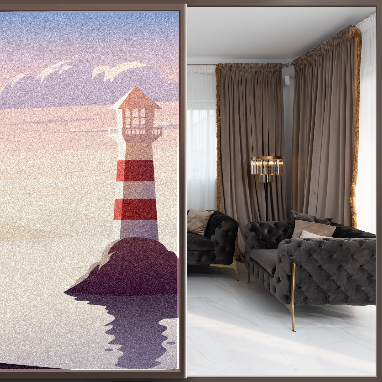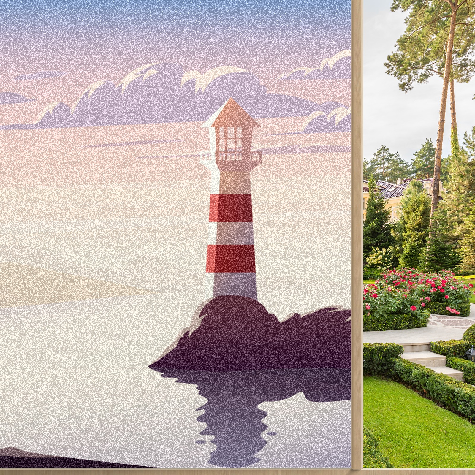 Static Cling Decorative Window Film Frosted Privacy Film Window Clings for Glass Windows No Glue Window Sticker for Bathroom Bedroom Office Landscape Lighthouse Illustration Sunset Sea