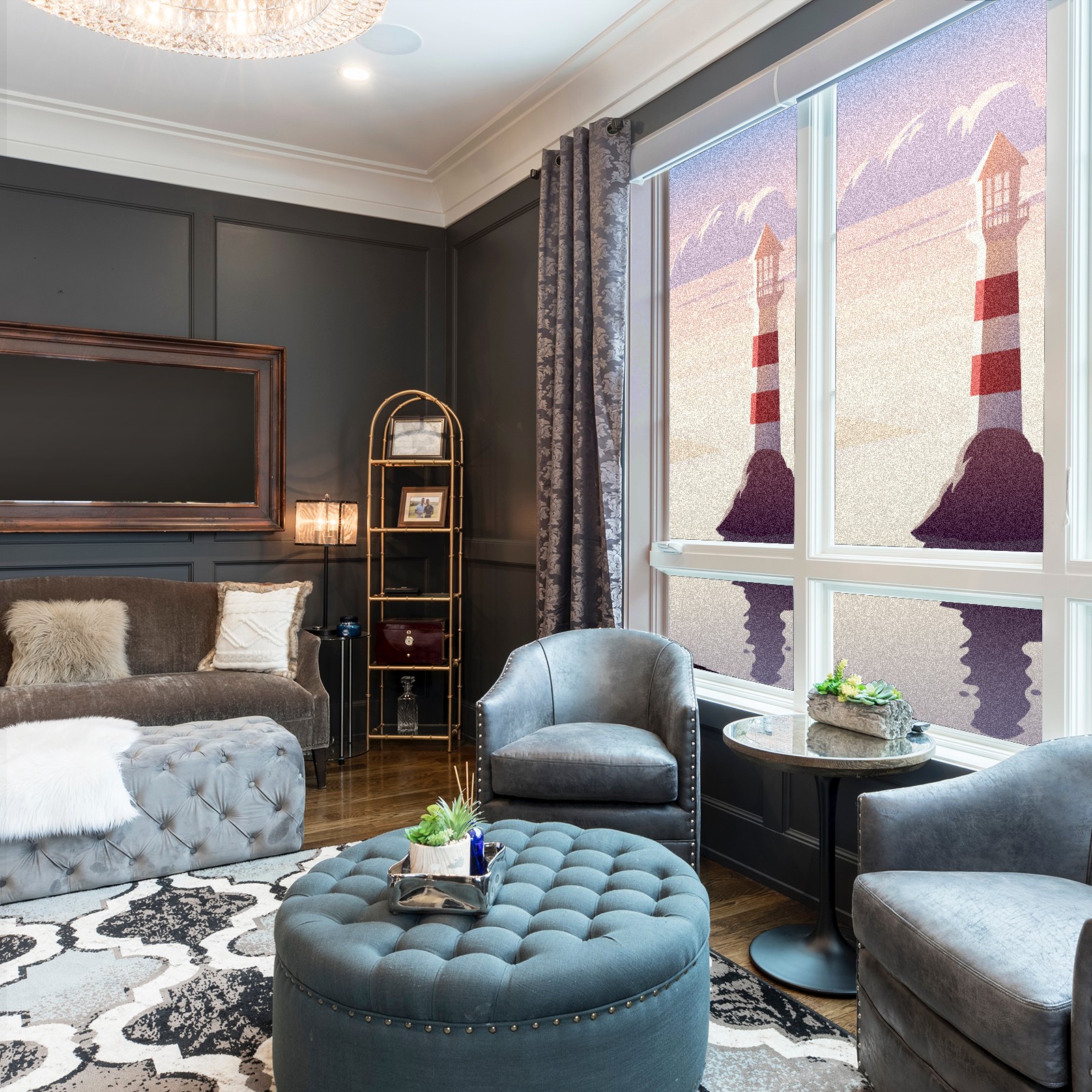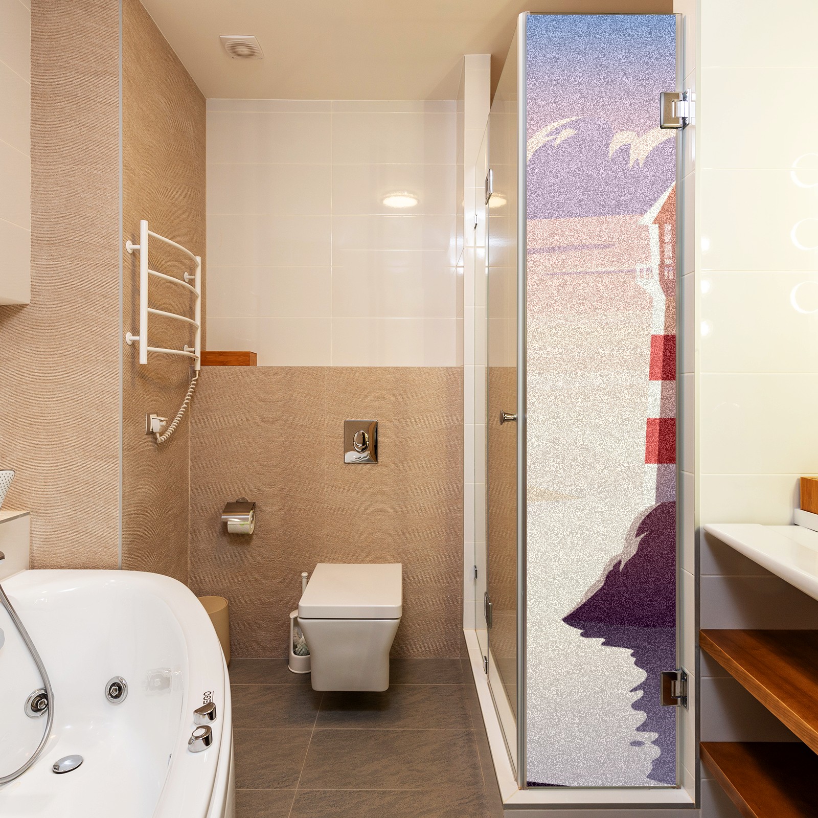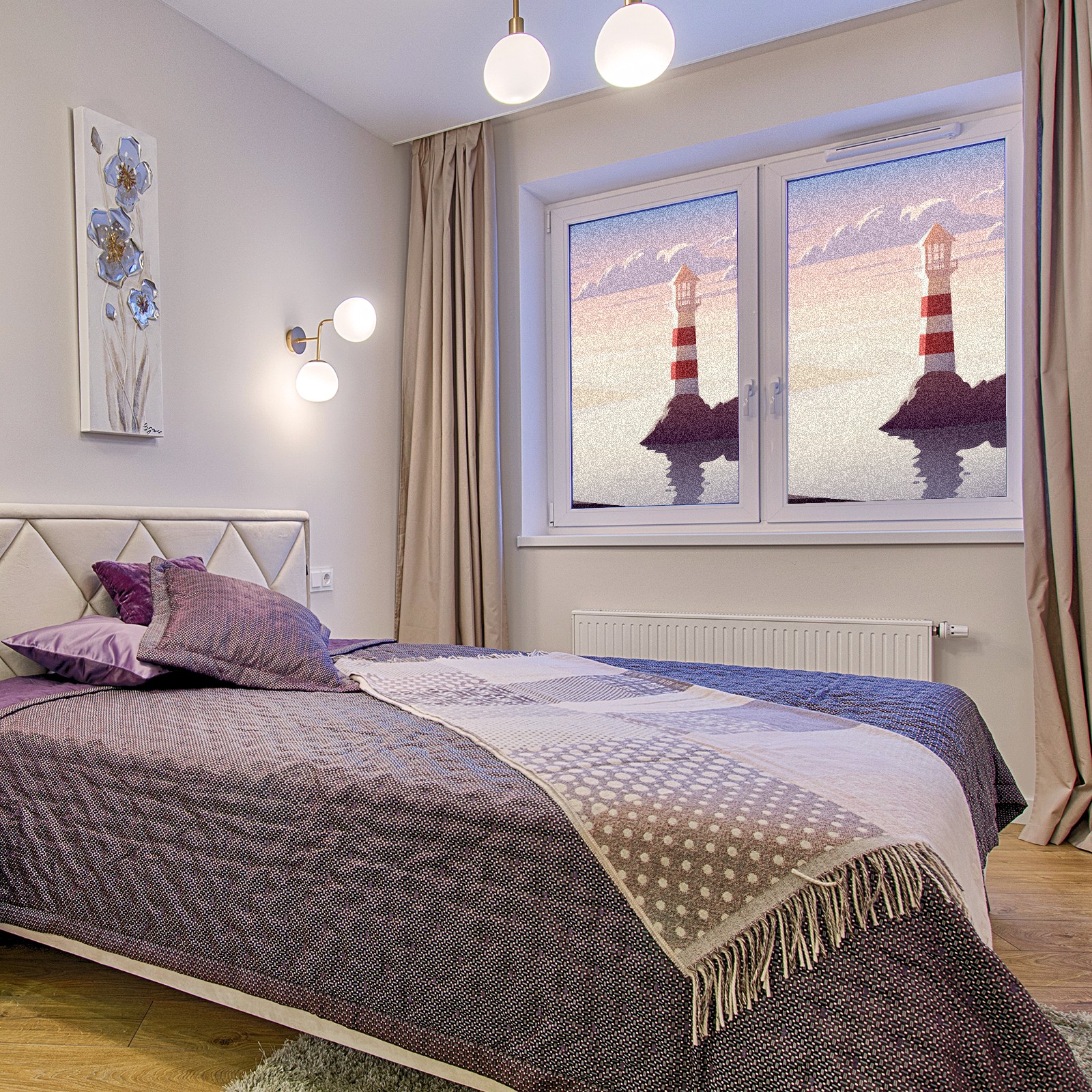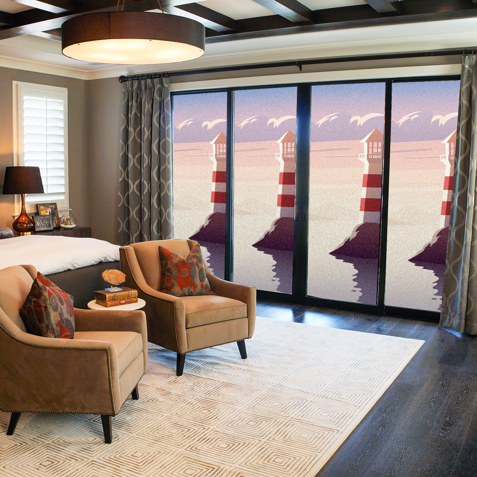 Static Cling Decorative Window Film Frosted Privacy Film Window Clings for Glass Windows No Glue Window Sticker for Bathroom Bedroom Office Landscape Lighthouse Illustration Sunset Sea