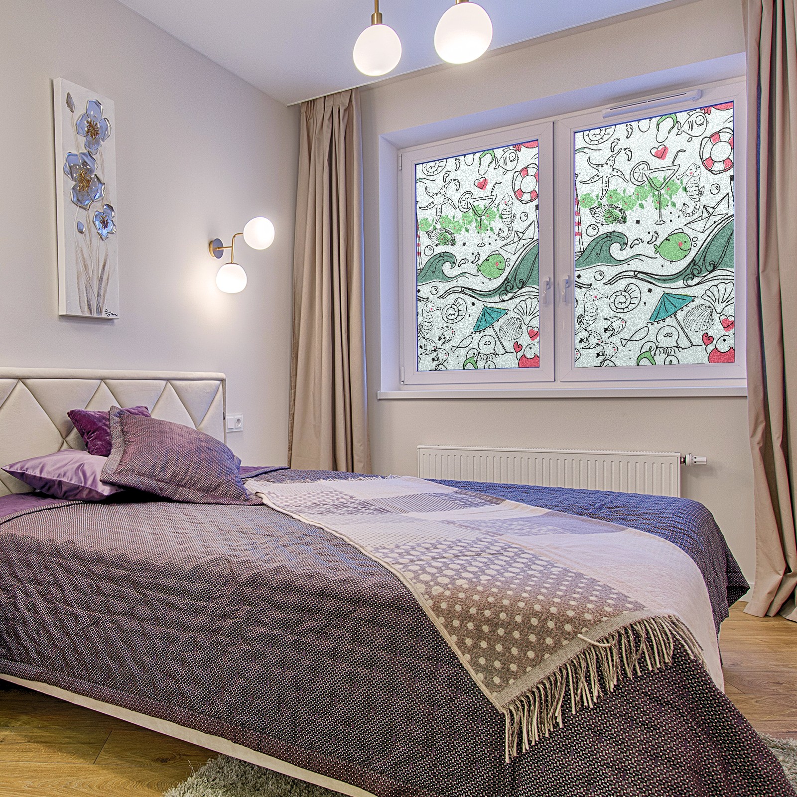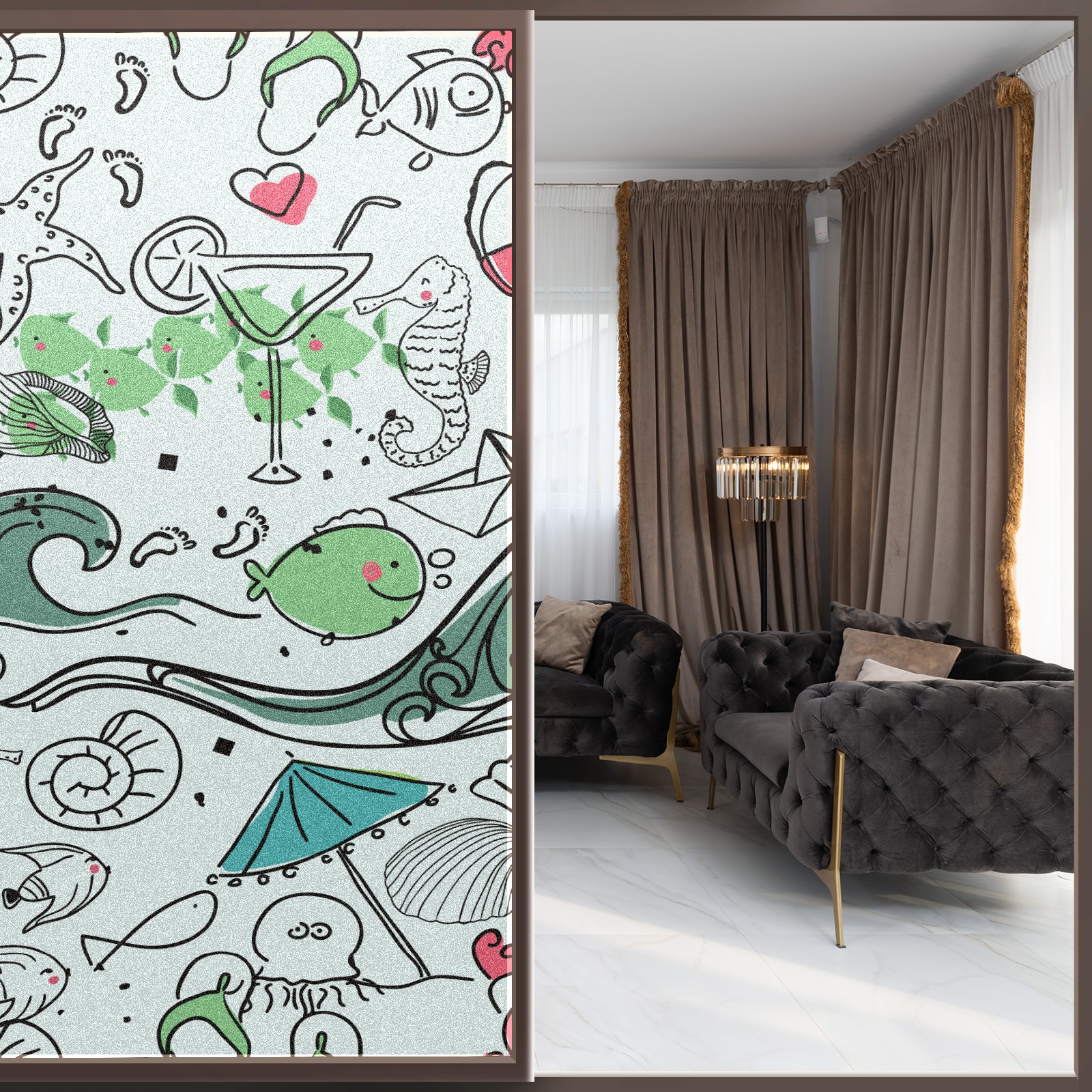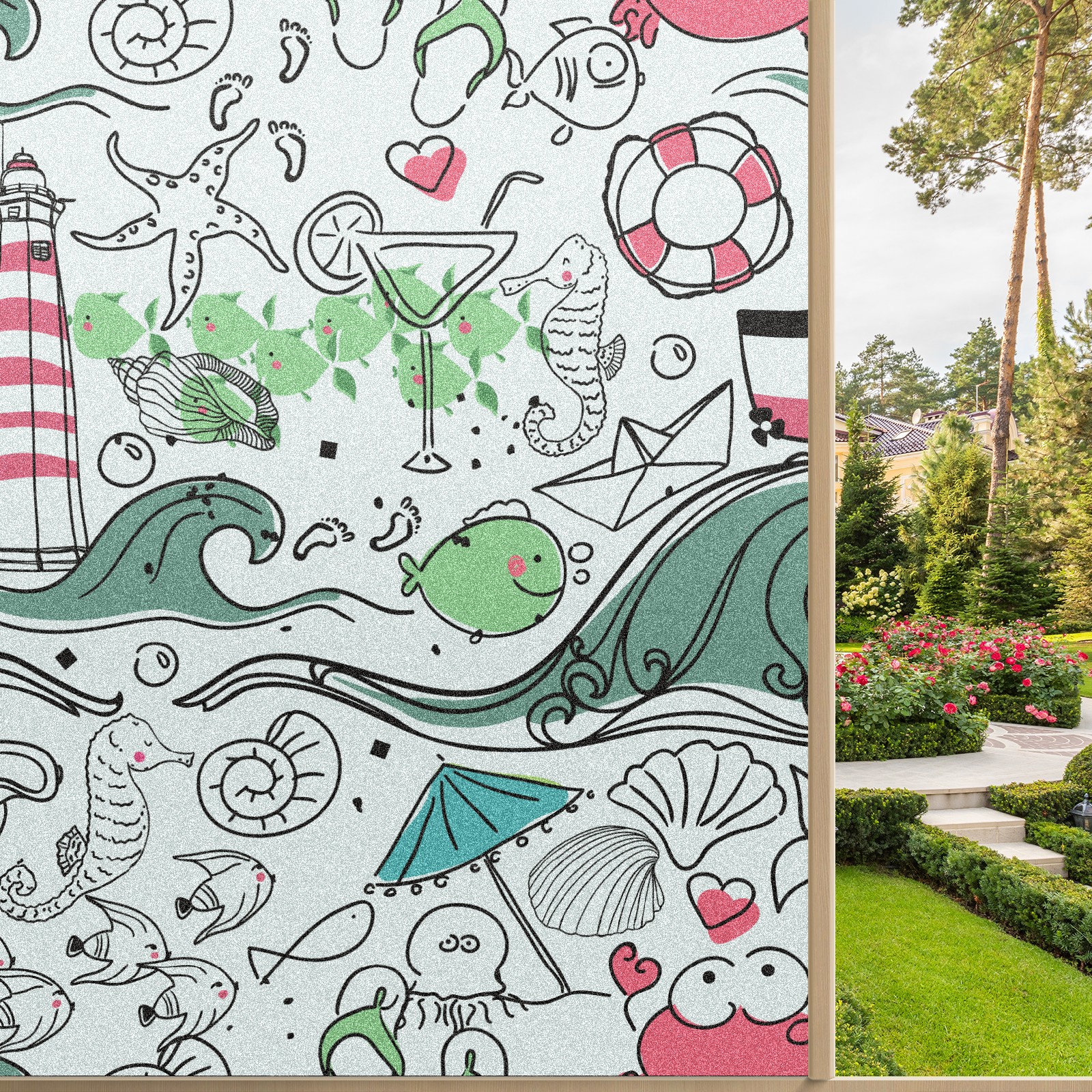 Static Cling Decorative Window Film Frosted Privacy Film Window Clings for Glass Windows No Glue Window Sticker for Bathroom Bedroom Office Lighthouse Seahorse Wave Fish