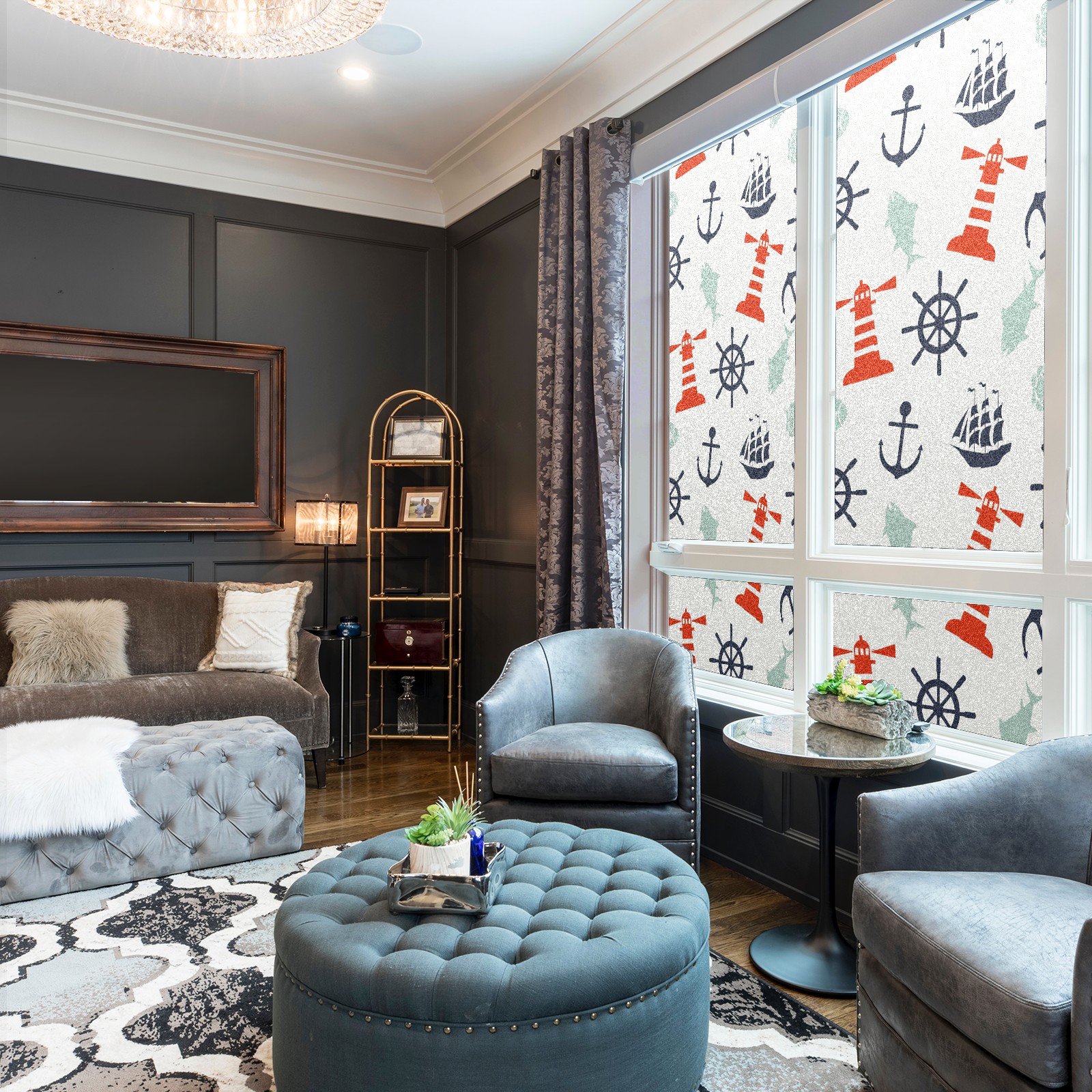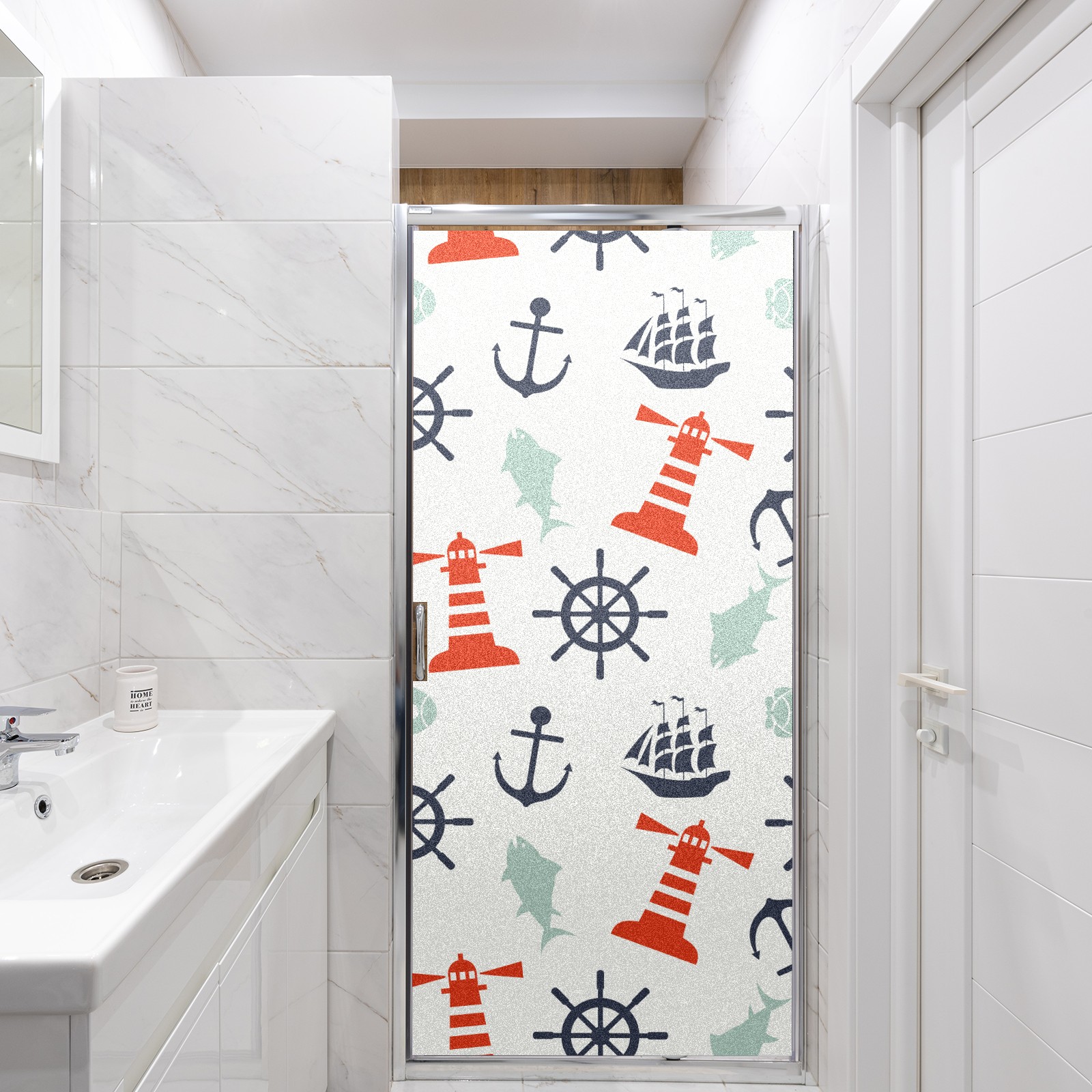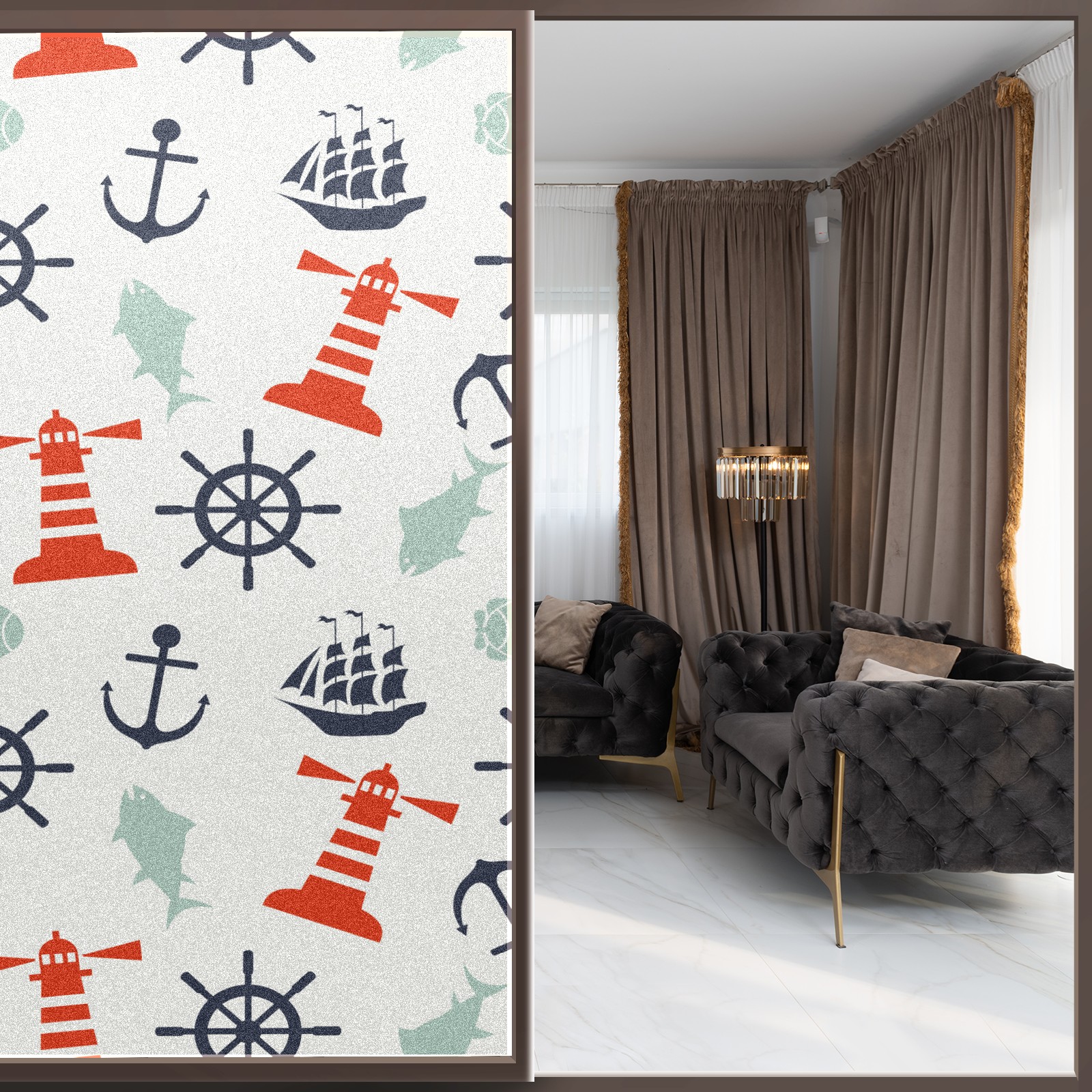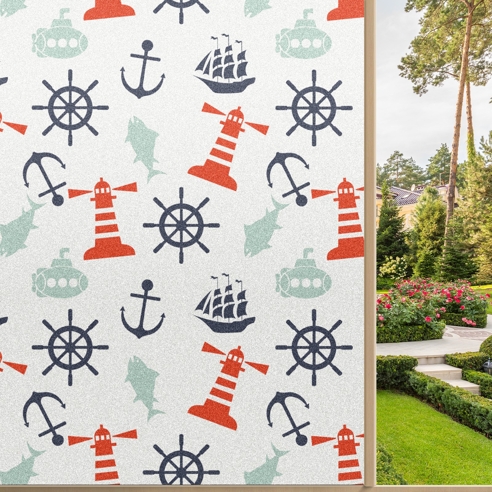 Static Cling Decorative Window Film Frosted Privacy Film Window Clings for Glass Windows No Glue Window Sticker for Bathroom Bedroom Office Lighthouse Rudder Anchor Boat Pattern