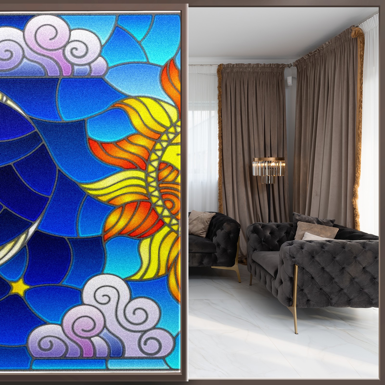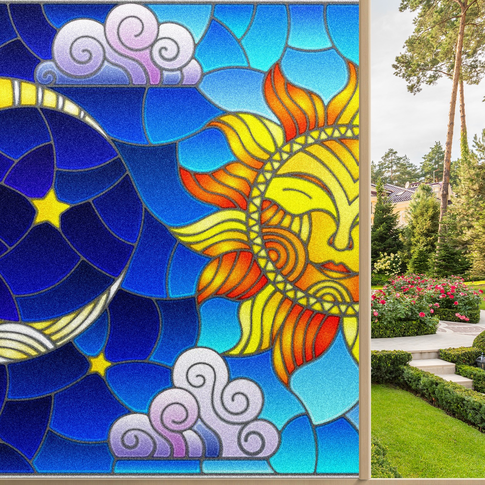 Static Cling Decorative Window Film Frosted Privacy Film Window Clings for Glass Windows No Glue Window Sticker for Bathroom Bedroom Office Sun Moon Stained Glass