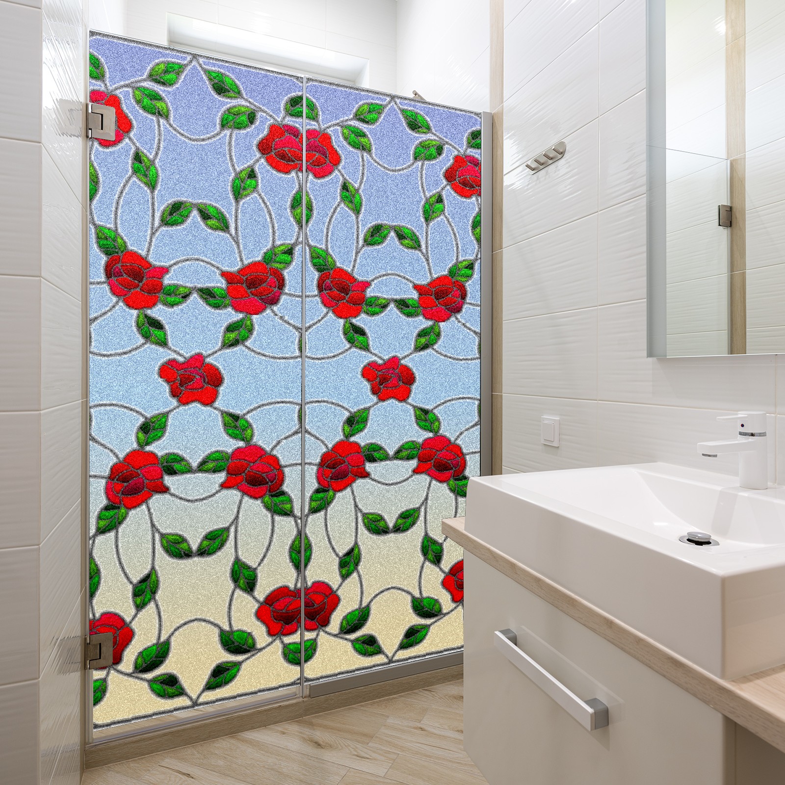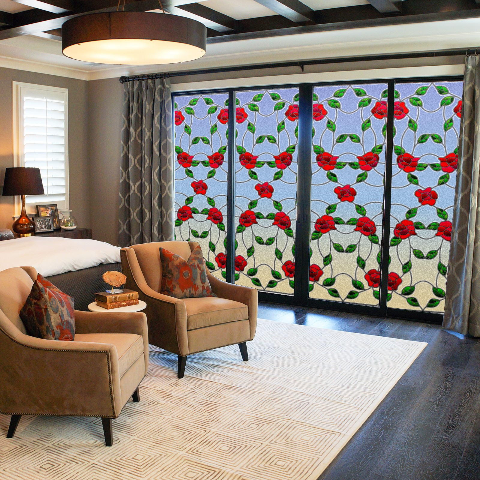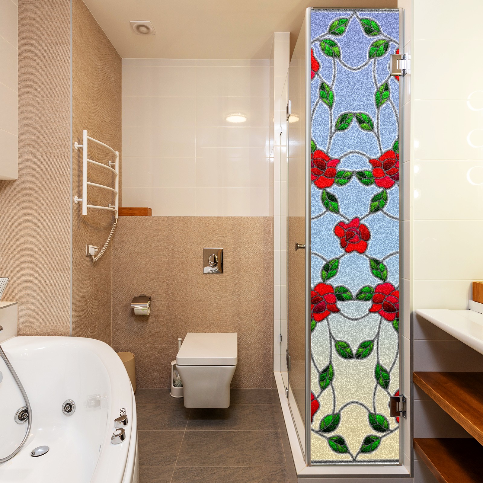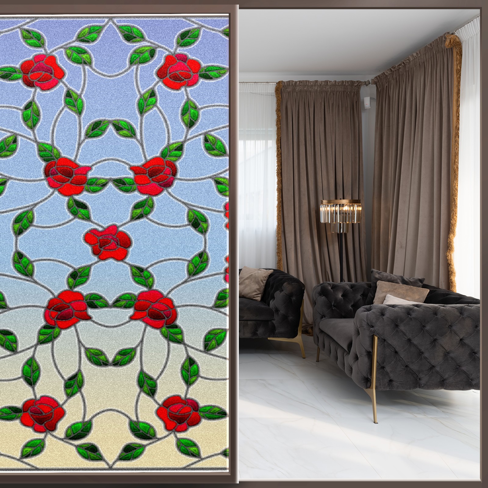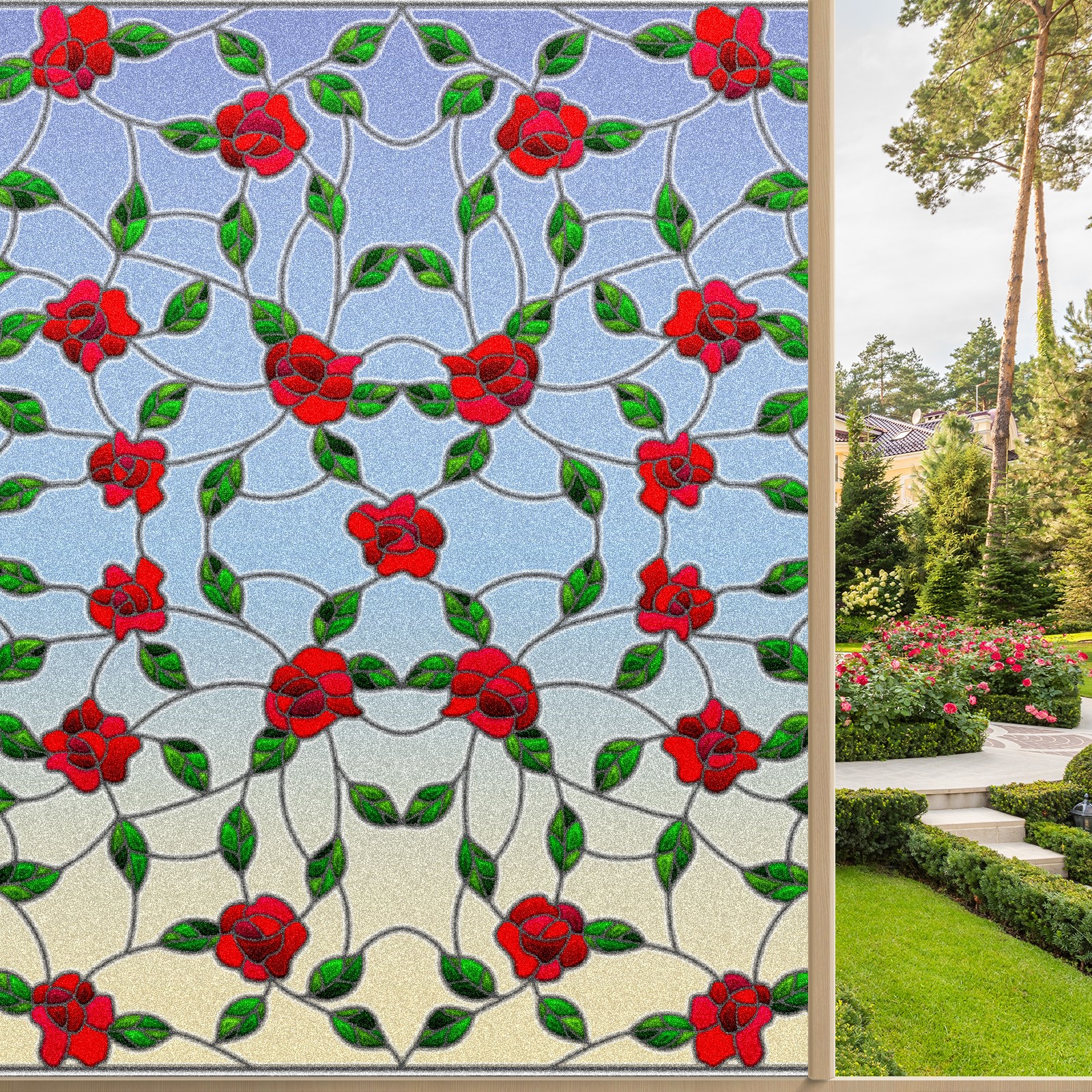 Static Cling Decorative Window Film Frosted Privacy Film Window Clings for Glass Windows No Glue Window Sticker for Bathroom Bedroom Office Colorful Rose Flower Stained Glass