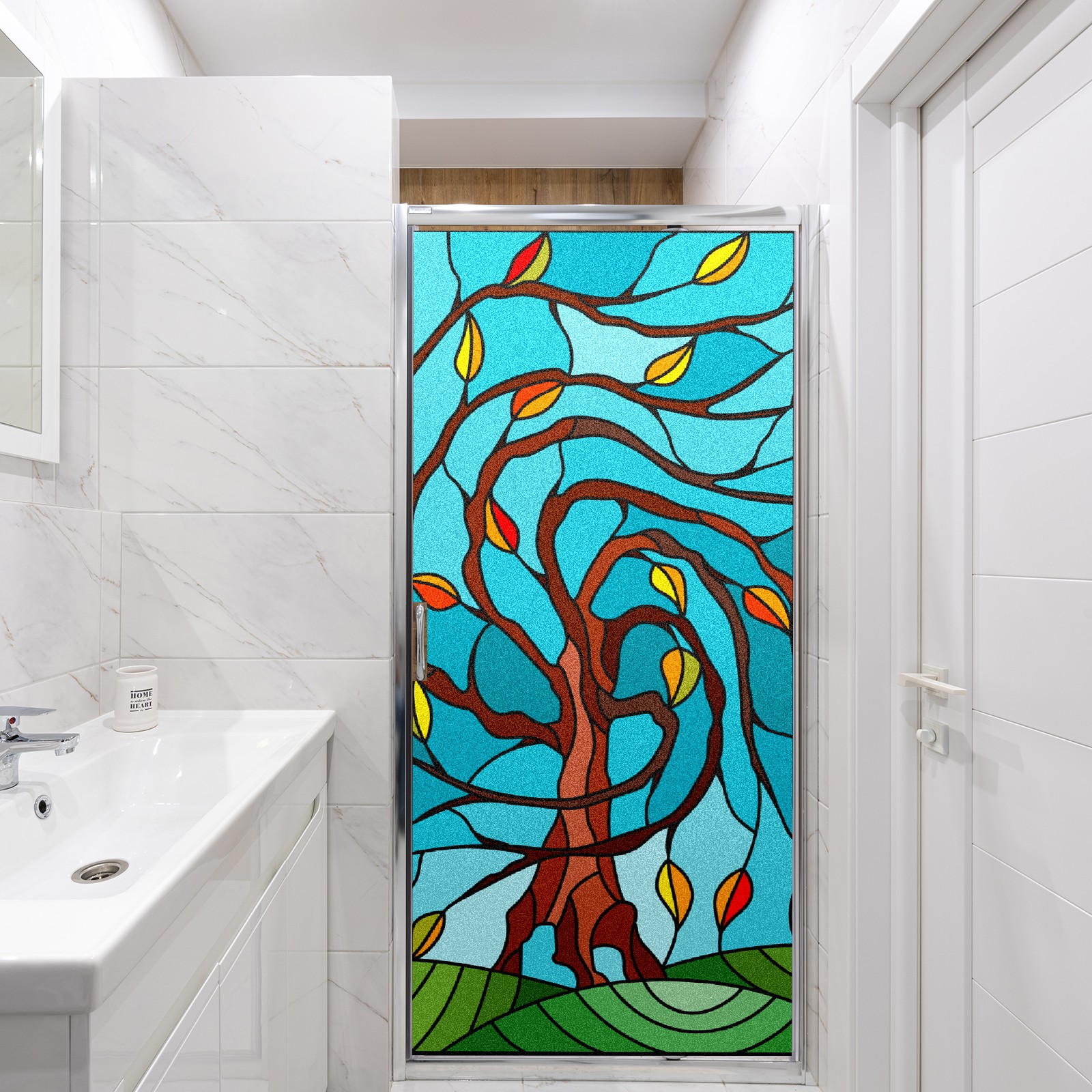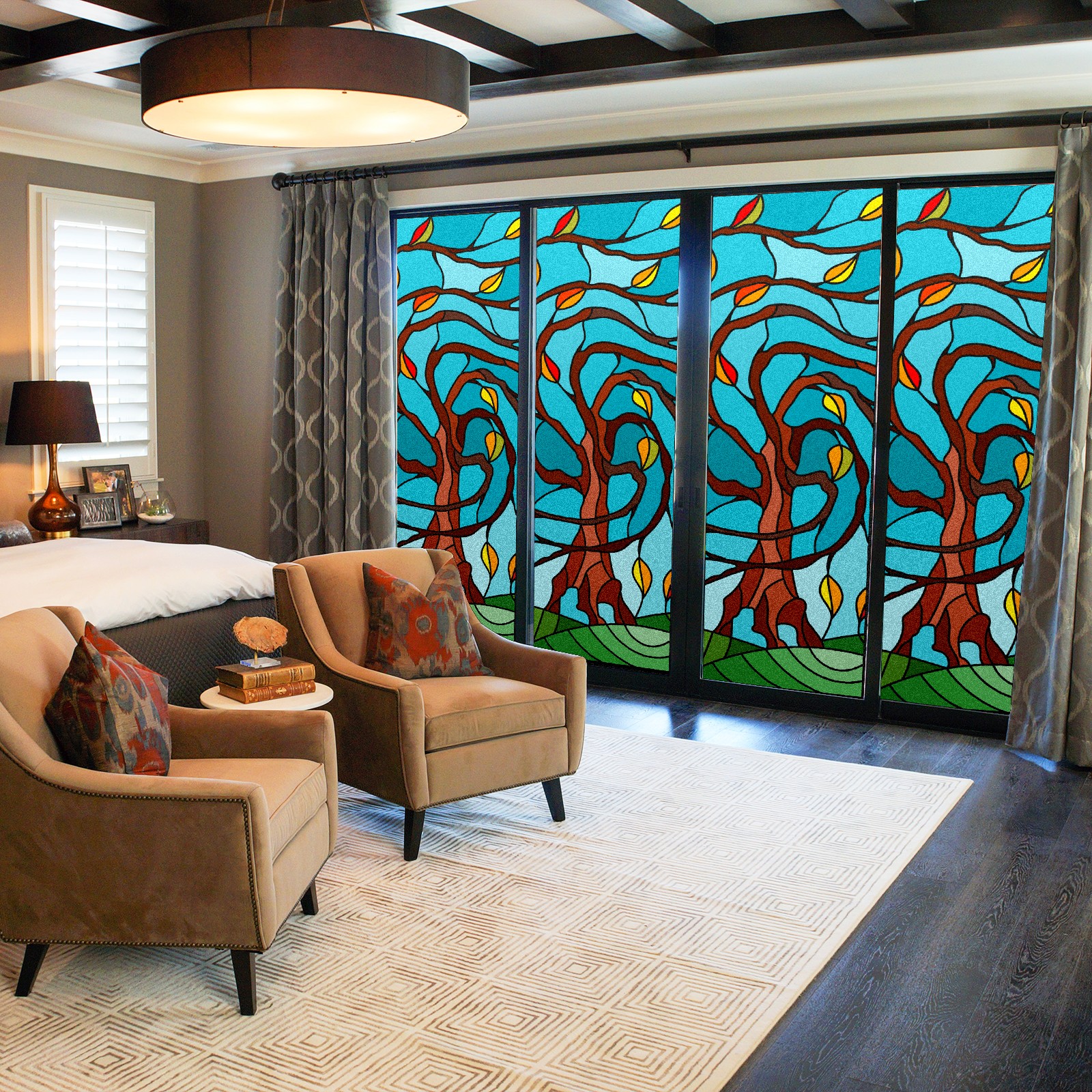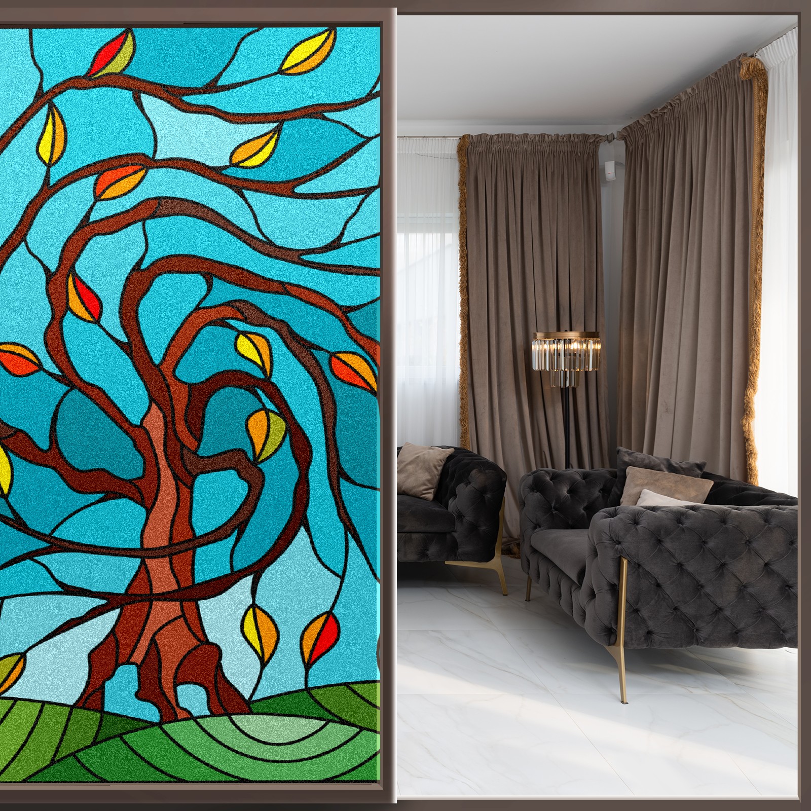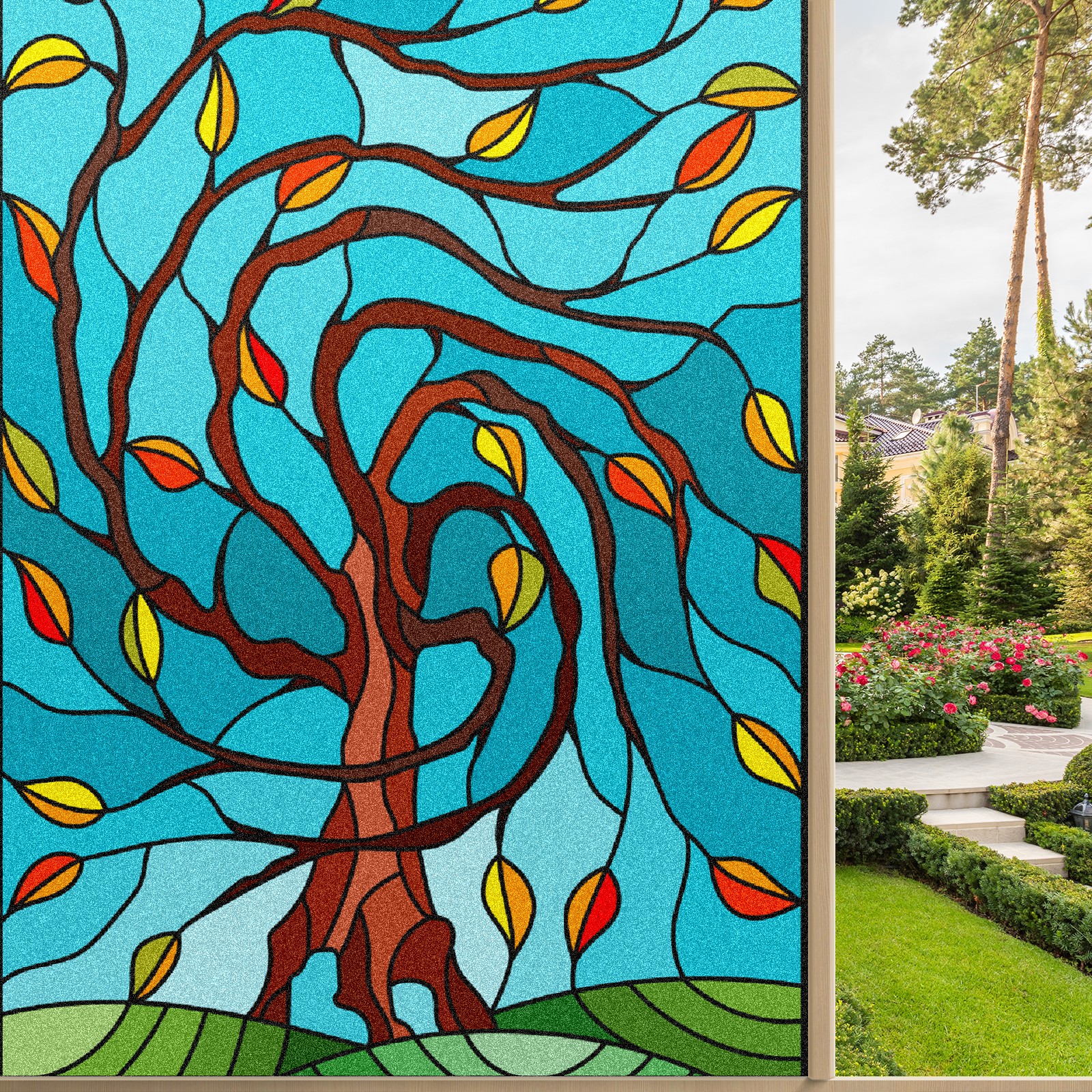 Static Cling Decorative Window Film Frosted Privacy Film Window Clings for Glass Windows No Glue Window Sticker for Bathroom Bedroom Office Colorful Tree Stained Glass