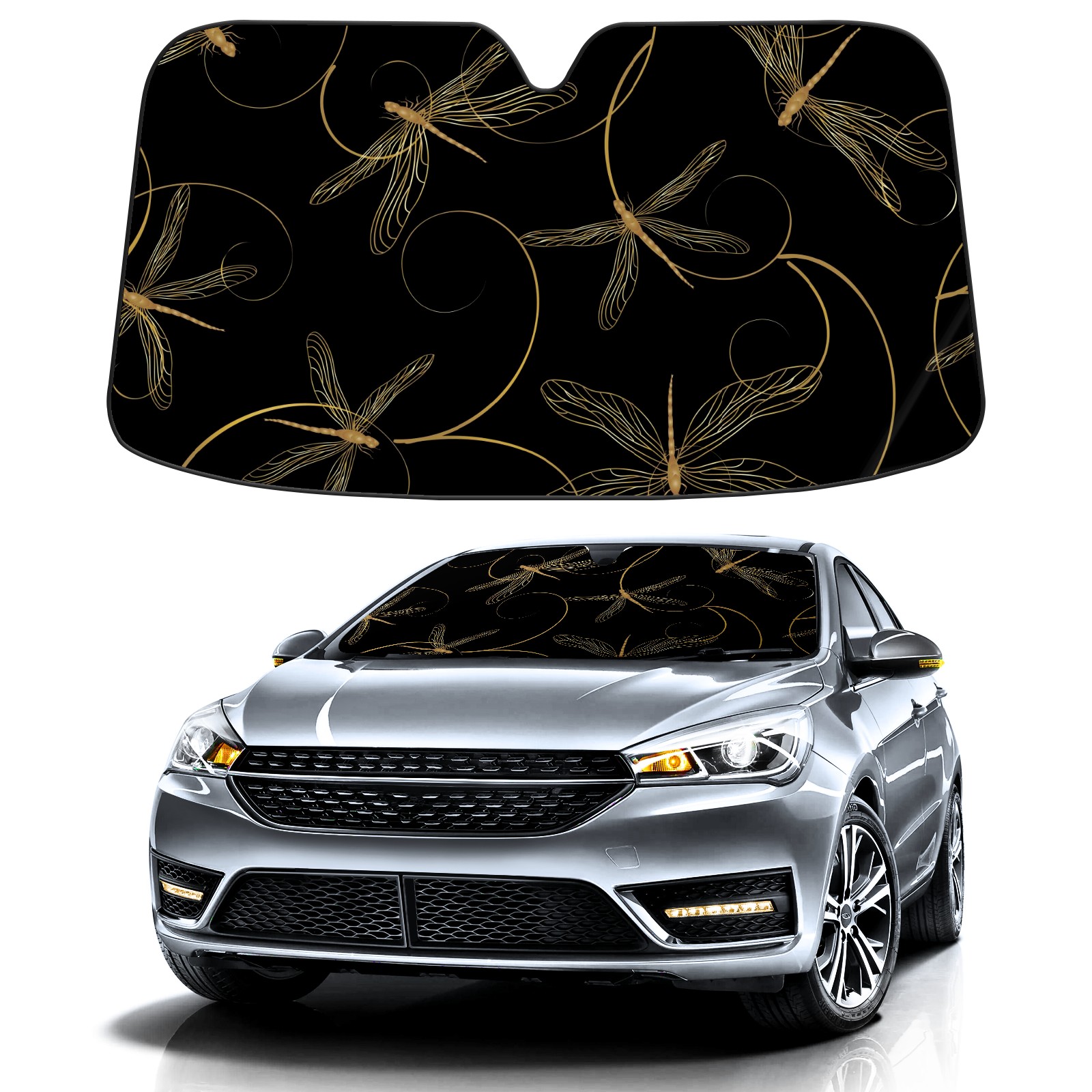 Car Windshield Sun Shade for Front Window Golden Dragonfly On Black Background Foldable Vehicle Windshield Car Sun Visor Covers Automotive Window Protector Car Camping Privacy Sun Blocker