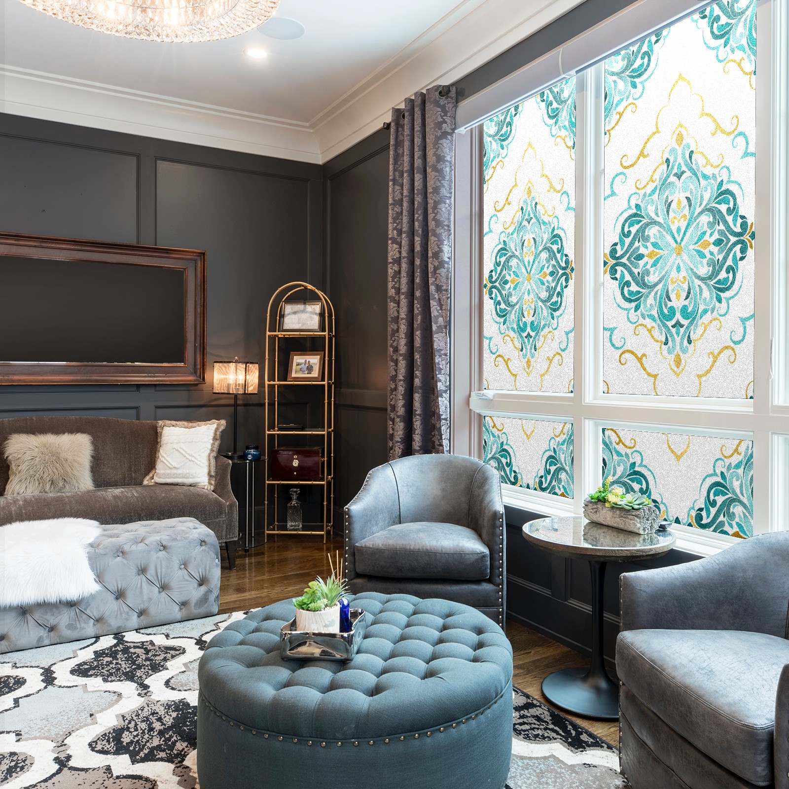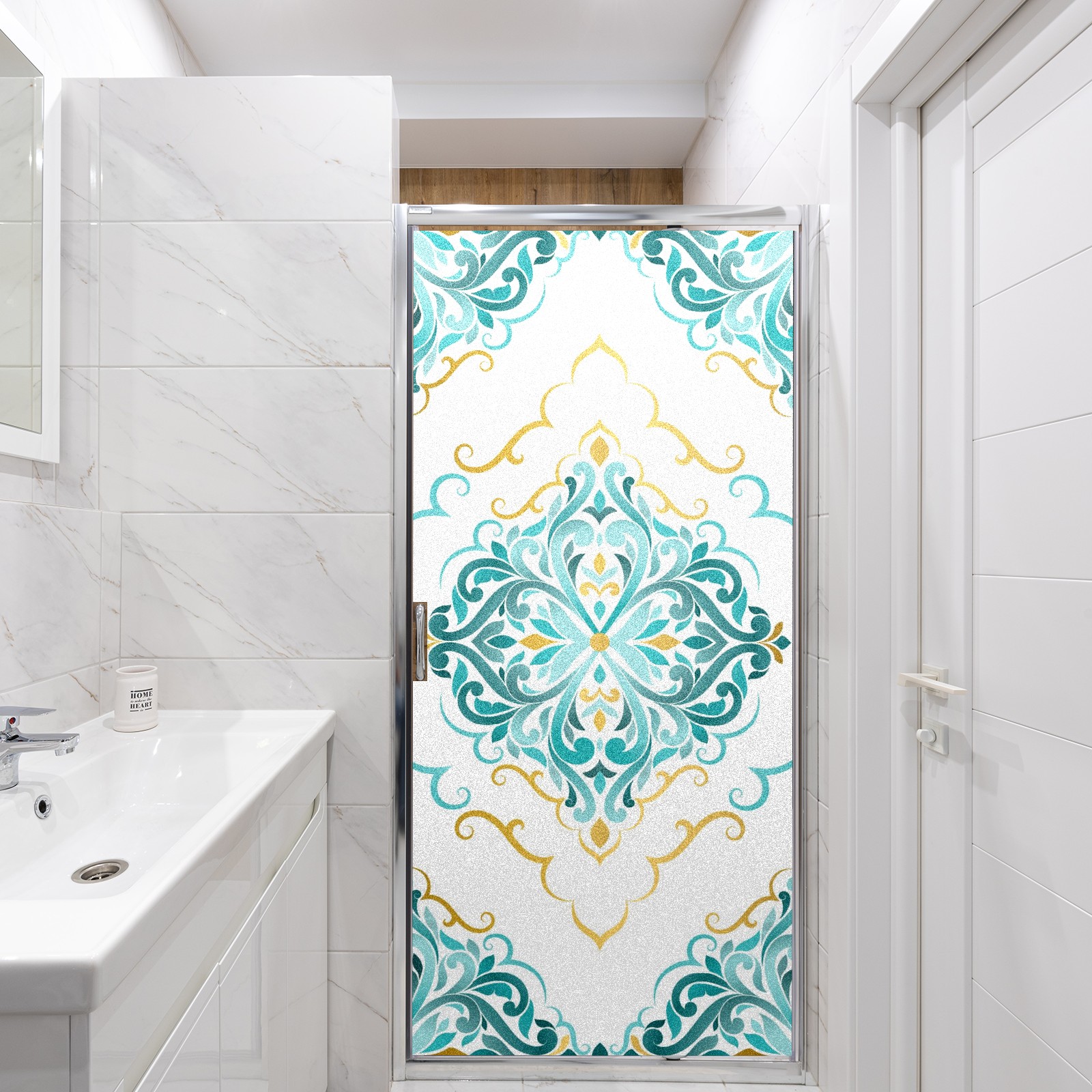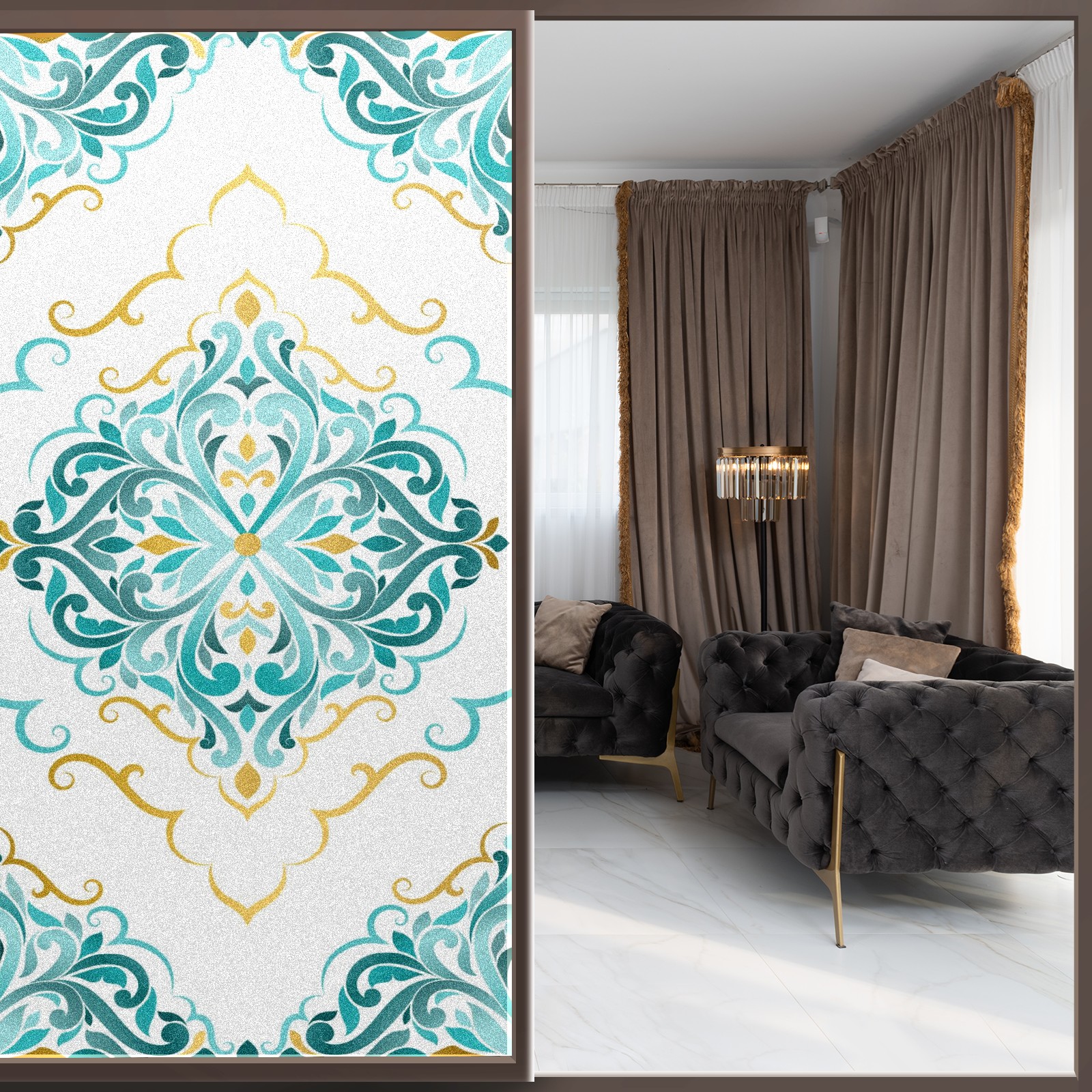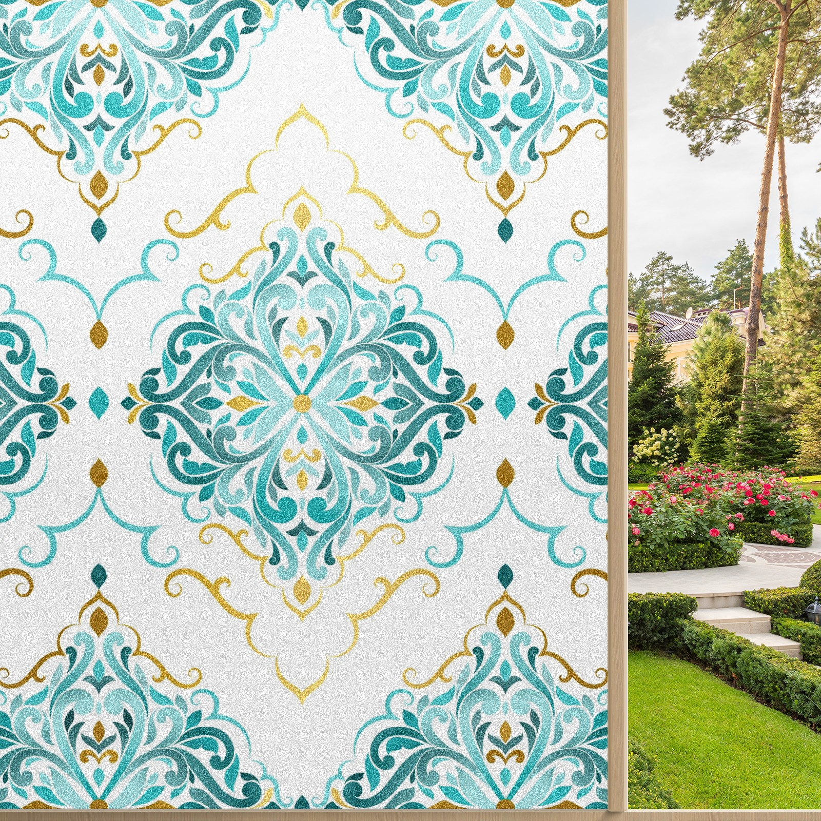 Static Cling Decorative Window Film Frosted Privacy Film Window Clings for Glass Windows No Glue Window Sticker for Bathroom Bedroom Office Gold And Turquoise Ethnic Floral