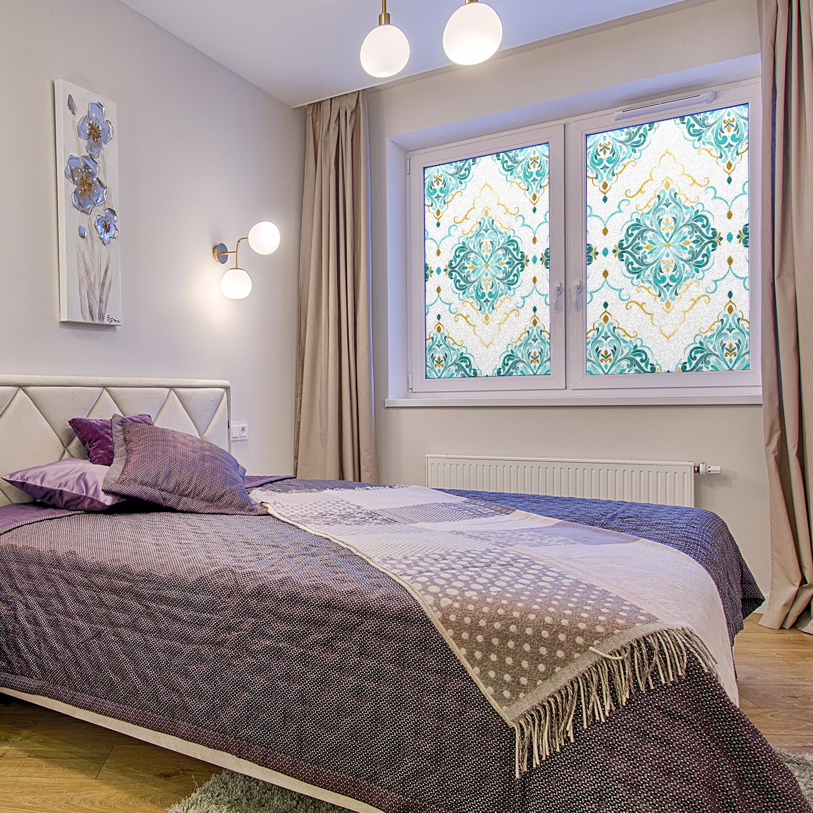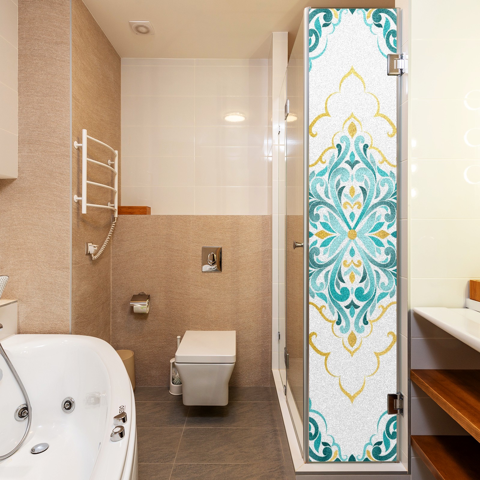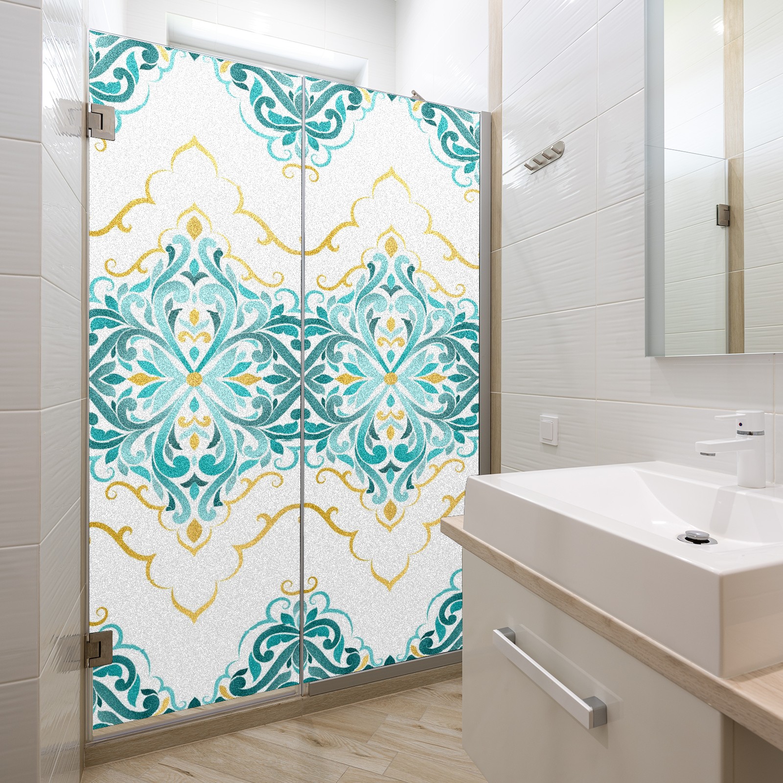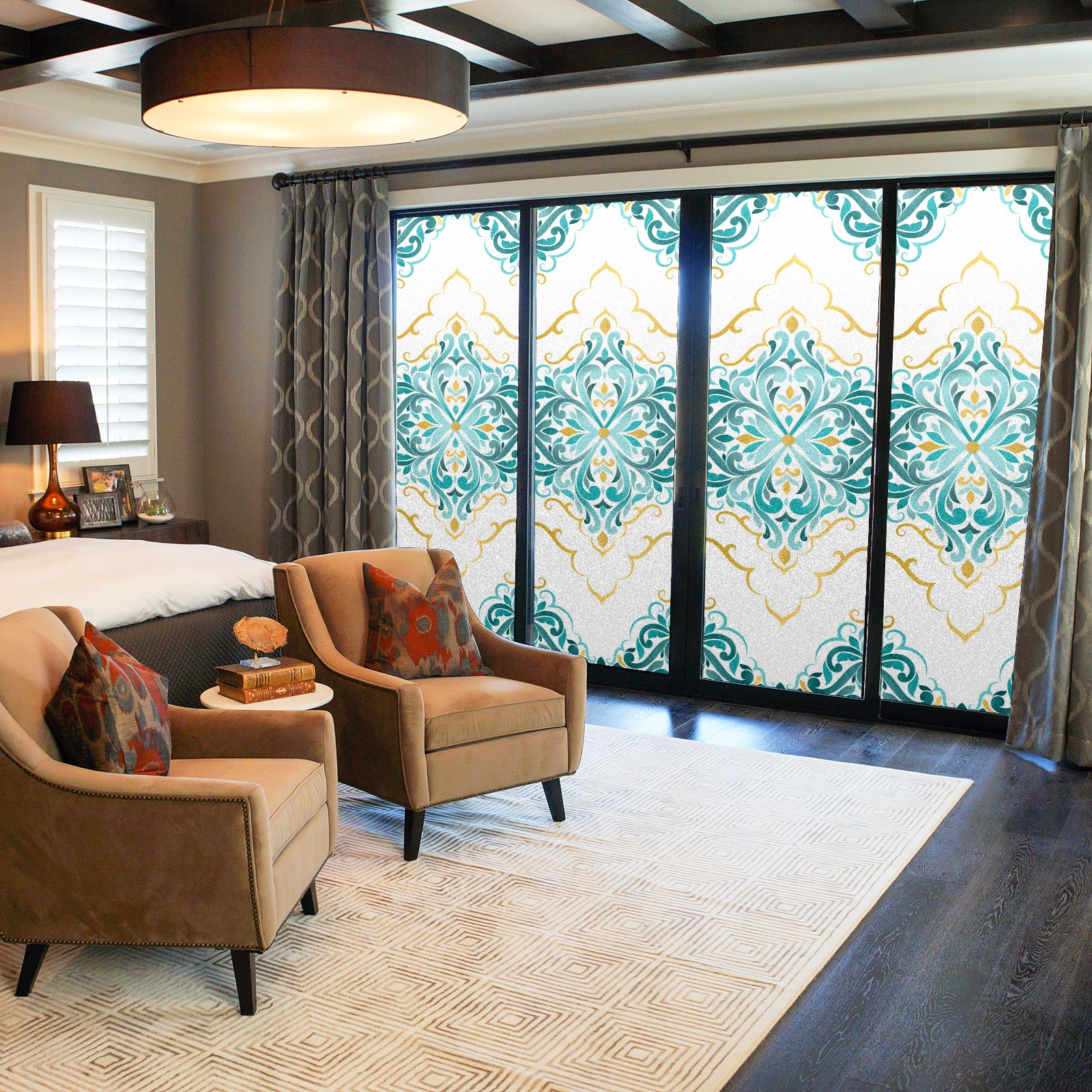 Static Cling Decorative Window Film Frosted Privacy Film Window Clings for Glass Windows No Glue Window Sticker for Bathroom Bedroom Office Gold And Turquoise Ethnic Floral