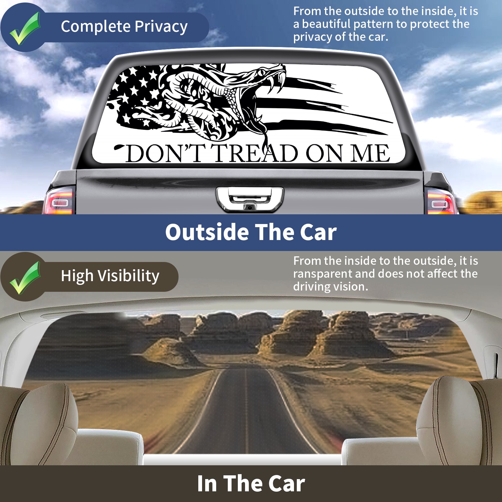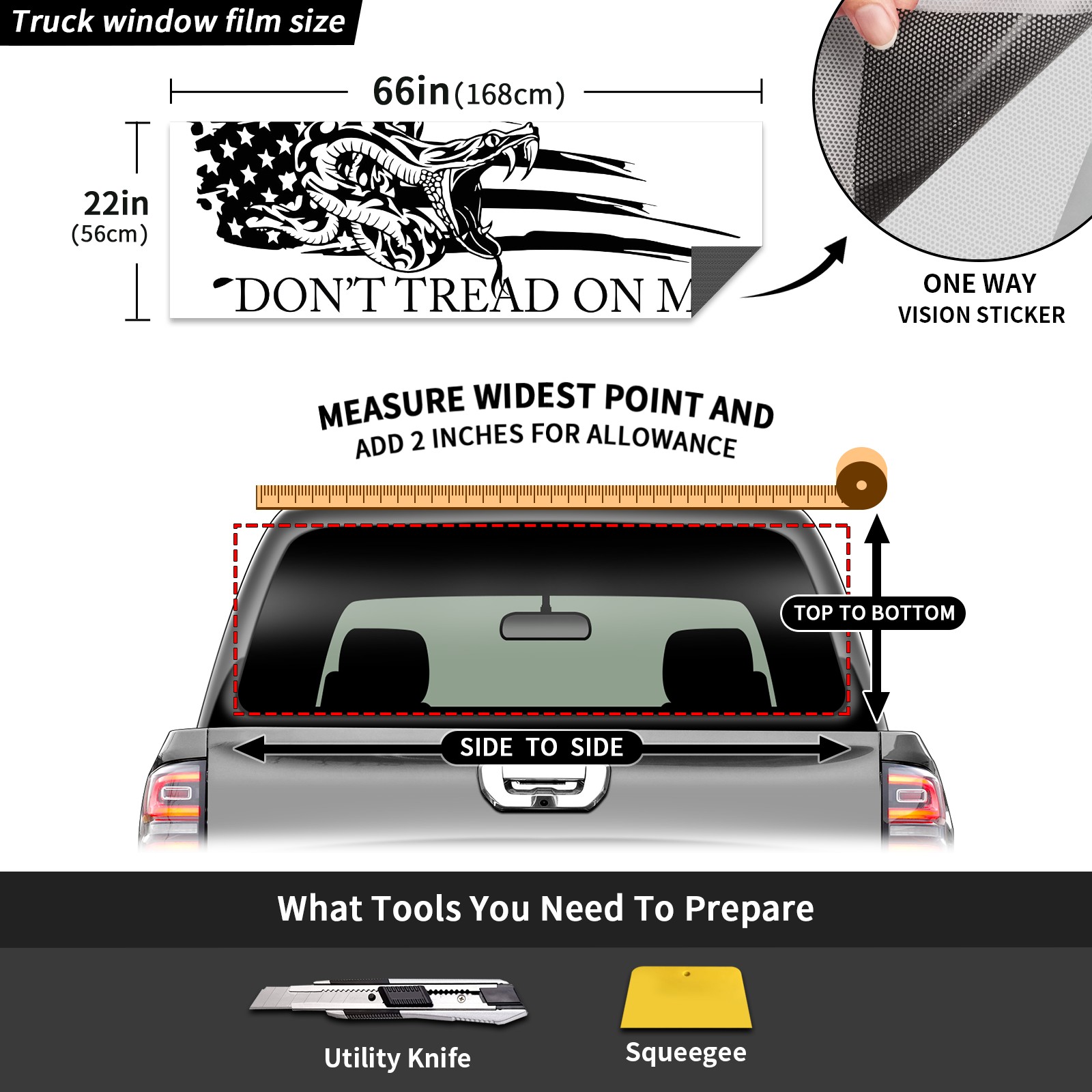 <p><strong>Truck Rear Window Graphics Decals Pickup Trucks Back Window Film Stickers 66" x 22" Perforated Vinyl Wrap Stickers Decorations for Car Rear Window</strong></p><p><strong><br /></strong></p><p><strong>Features :</strong></p><p>- Size of the rear window decals for trucks is 66x22 Inches (168x56cm).</p><p>- High quality perforated vinyl window film, one way vision sticker.</p><p>- Perforated is see through from the inside but not from outside.</p><p>- Clear printing, waterproof and durable.</p><p>- The car back window graphics stickers fits most truck and makes your vehicle more beautiful. </p><p><br /></p><p><strong>【Installation Instructions】</strong></p><p><strong>1. CLEAN SURFACE -</strong> Clean the rear window thoroughly and make sure the surface clean.</p><p><strong>2. STICK THE DECALS -</strong> Tear off the paper on the back and stick the decal on the window.</p><p><strong>3. SCRAPE OFF AIR BUBBLES -</strong> Use a squeegee or other card to scrape off the excess air bubbles.</p><p><strong>4. TRIM THE EXCESS -</strong> Use a knife to cut off the excess stickers of the window, finally complete.</p><p><br /></p><p>1. Please measure the size before purchasing, back window graphics decal for truck can be cut to your desired size.</p><p>2.The graphics stickers for truck back window is a great gift for yourself also can as a birthday / halloween / christmas gift for your friends and family.</p>