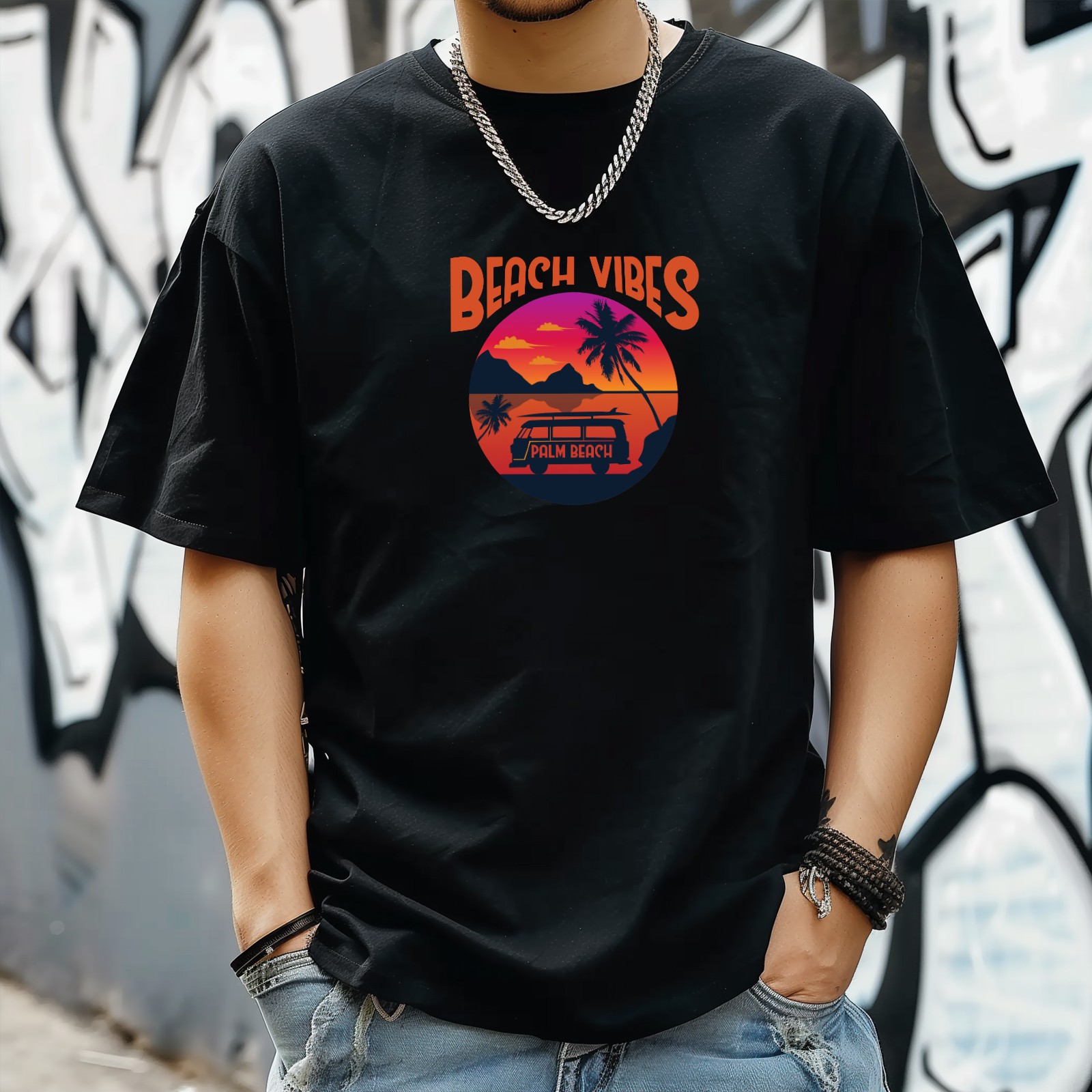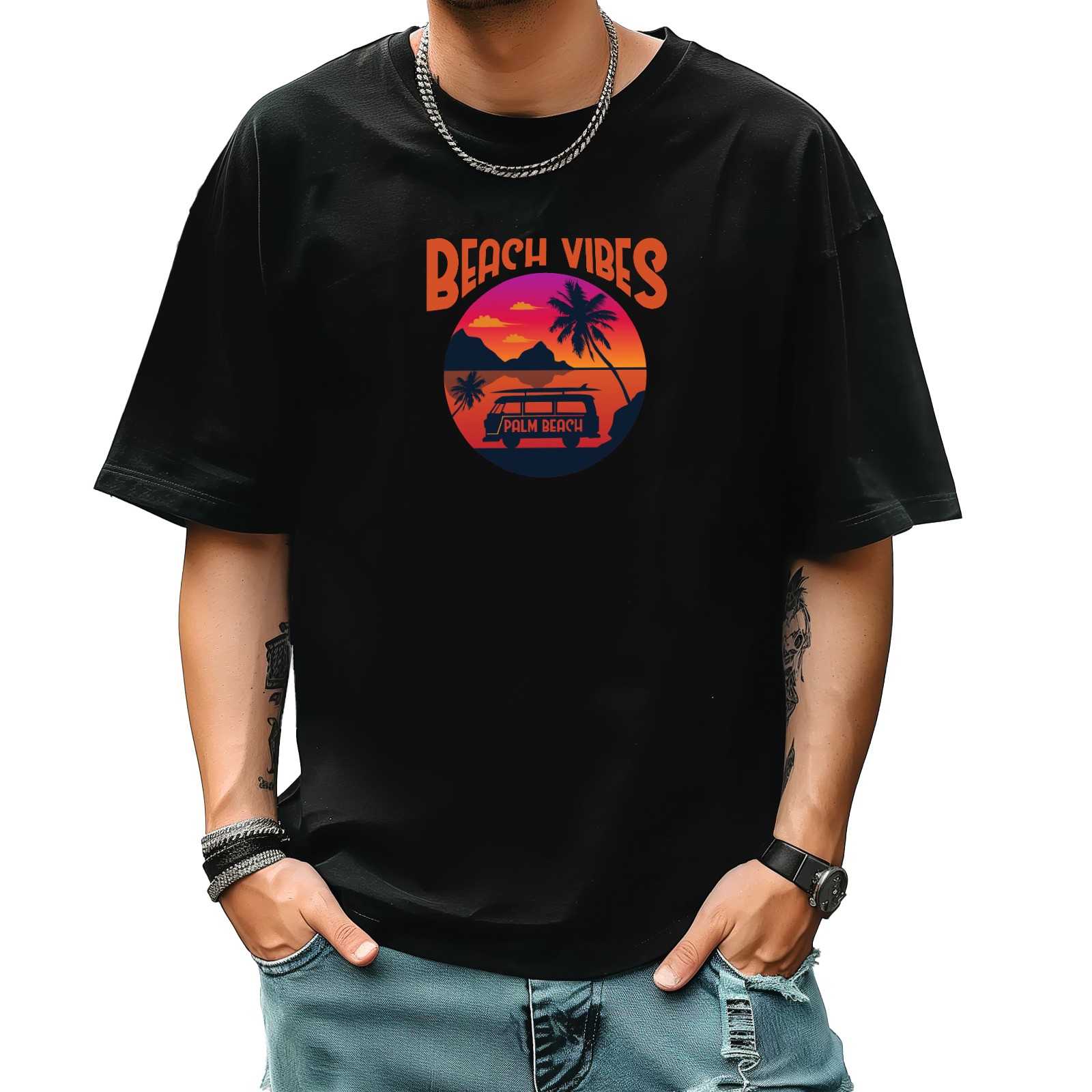 Beach Vibes T-Shirt for Man Tops Short Sleeves Shirt Crew Neck Shirt XS