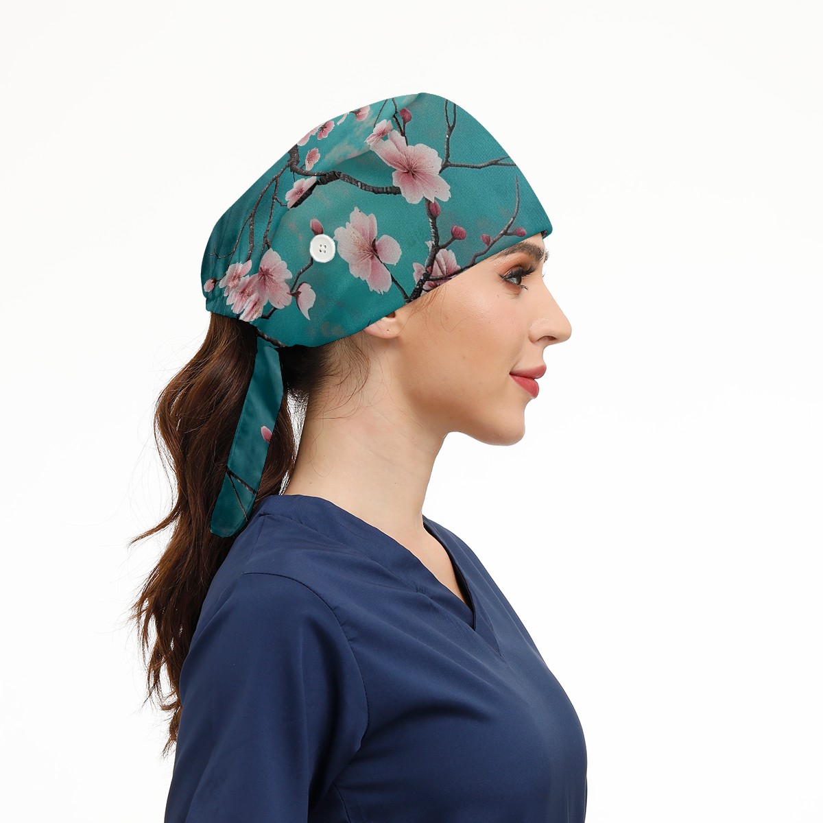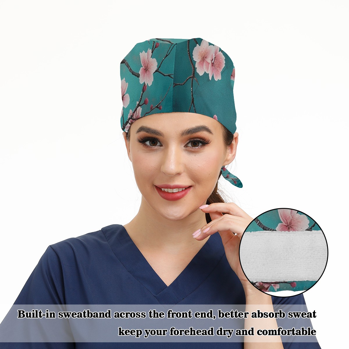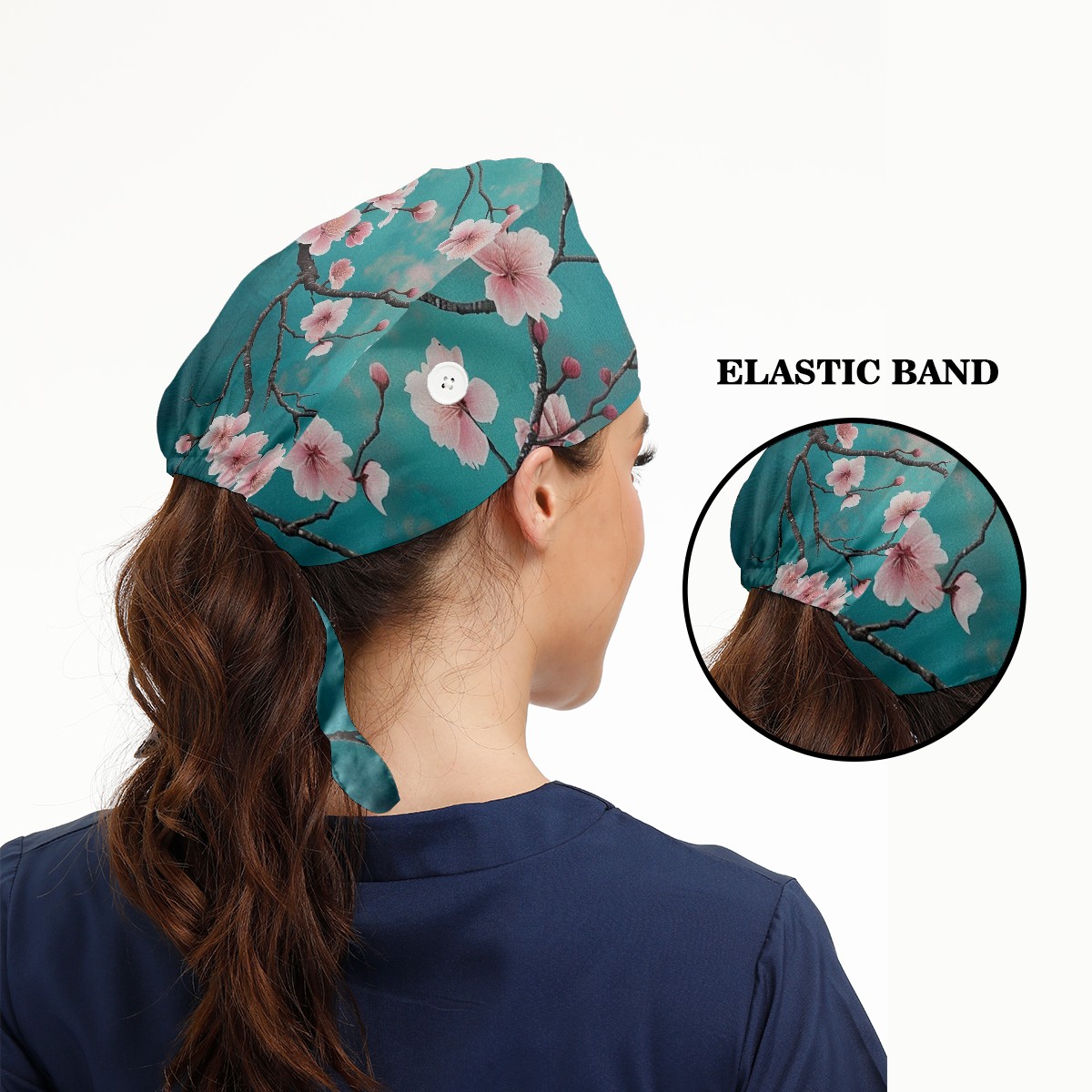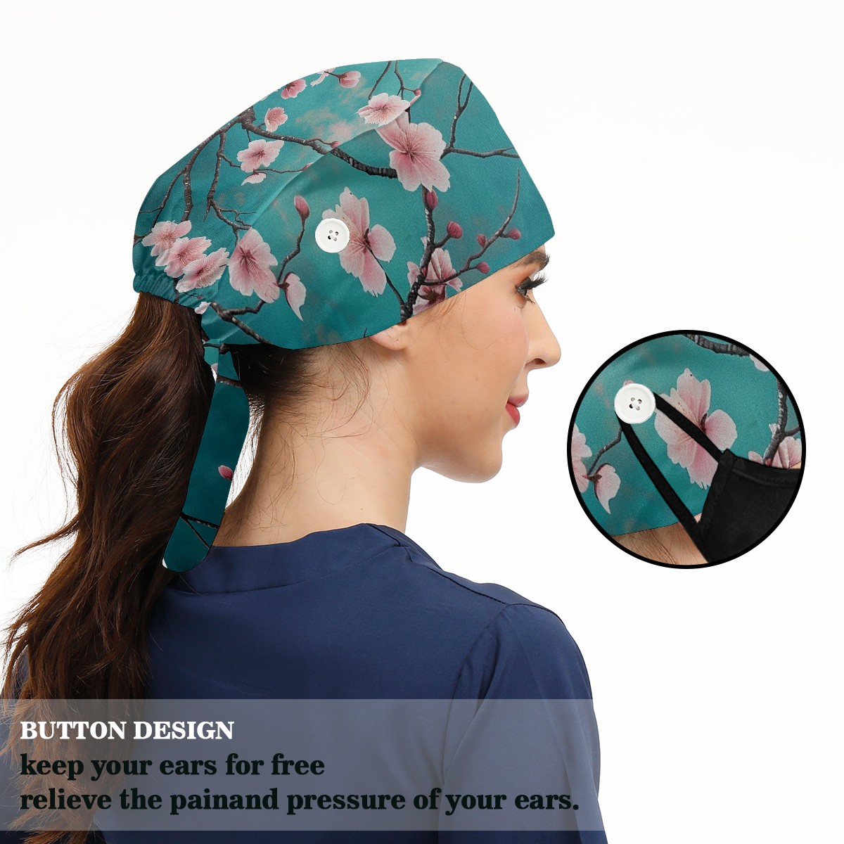Working Caps with Button & Sweatband Satin Lined Cotton Adjustable Nurse Hats Elastic Band Scrub Cap Surgeon Hat Cherry Blossom