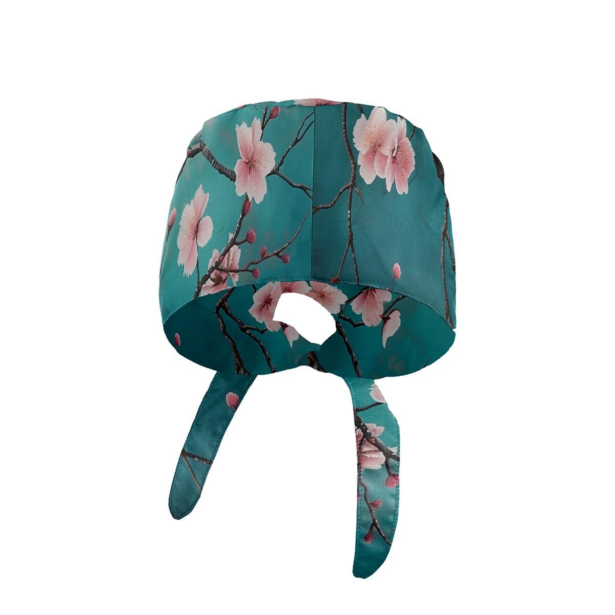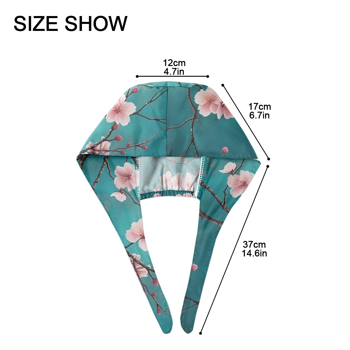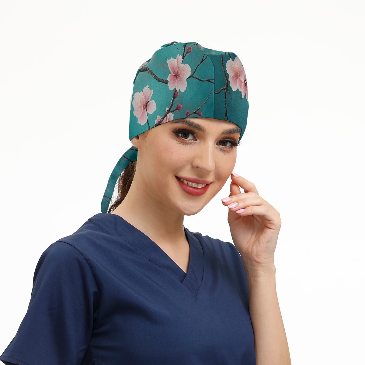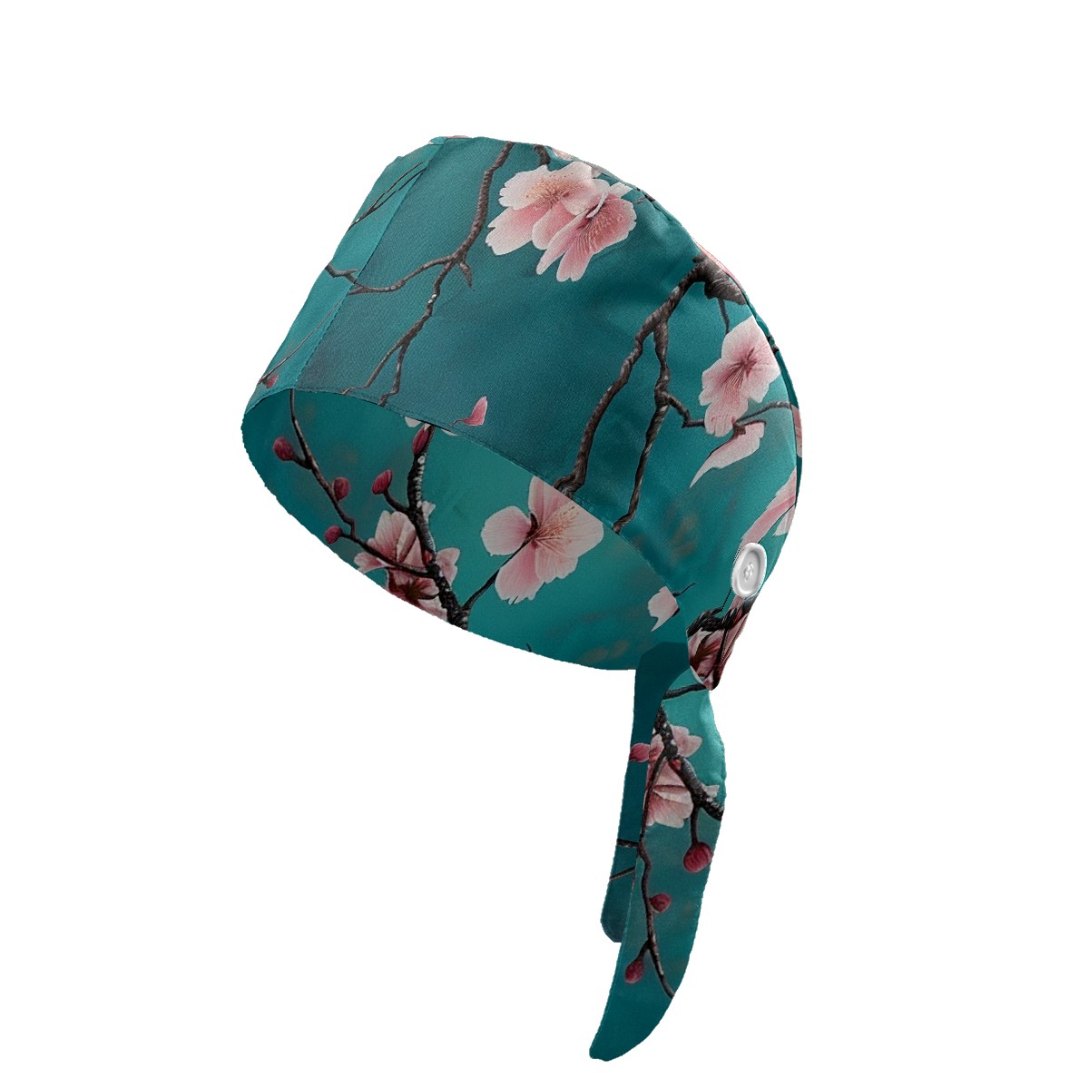 Working Caps with Button & Sweatband Satin Lined Cotton Adjustable Nurse Hats Elastic Band Scrub Cap Surgeon Hat Cherry Blossom