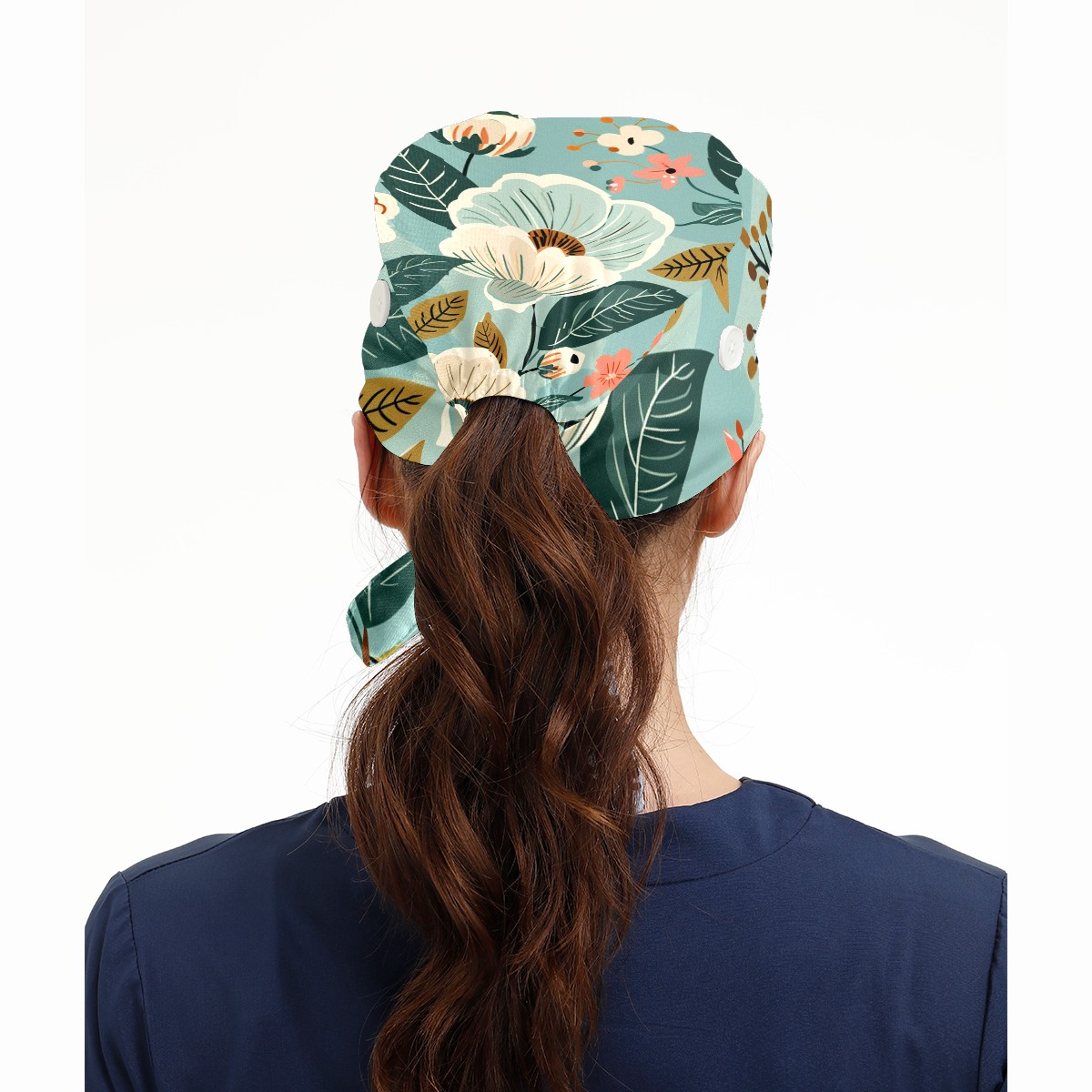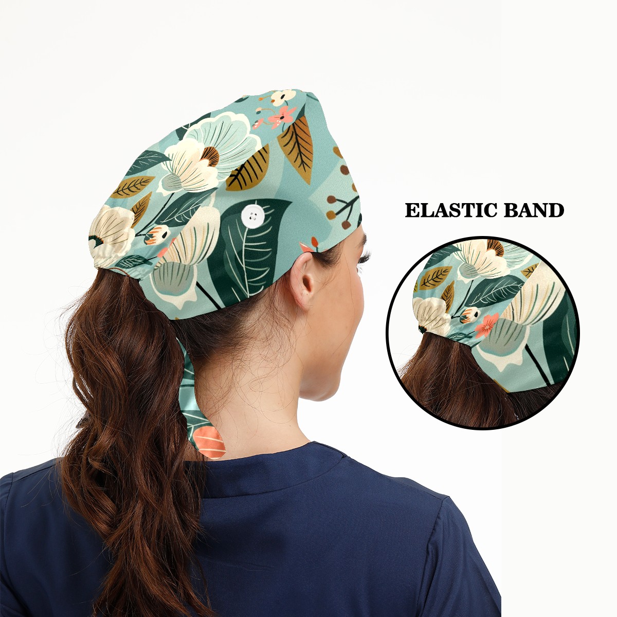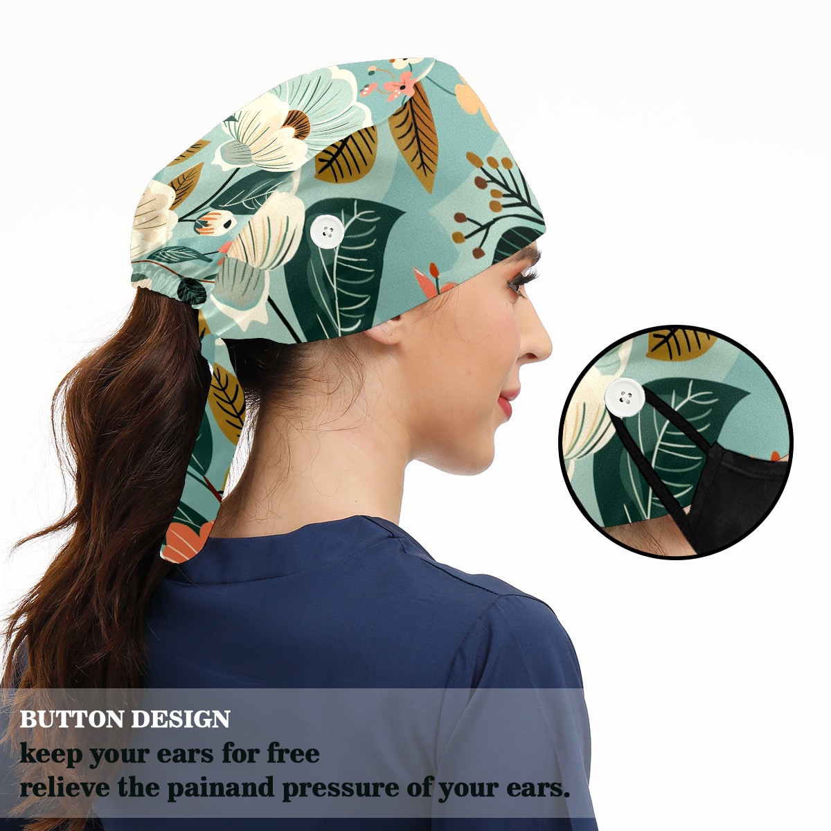 Working Caps with Button & Sweatband Satin Lined Cotton Adjustable Nurse Hats Elastic Band Scrub Cap Surgeon Hat White Lotus