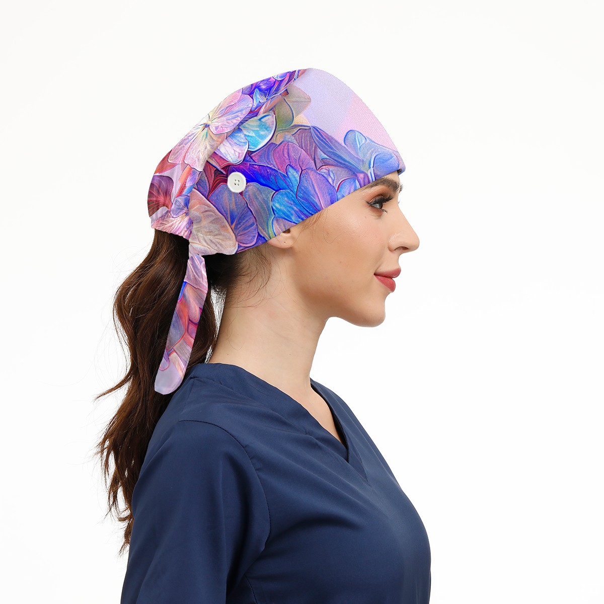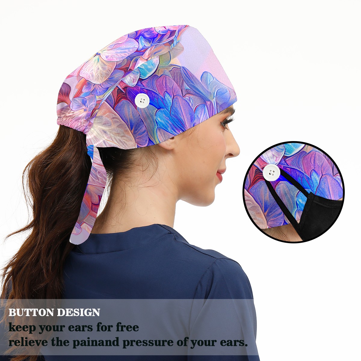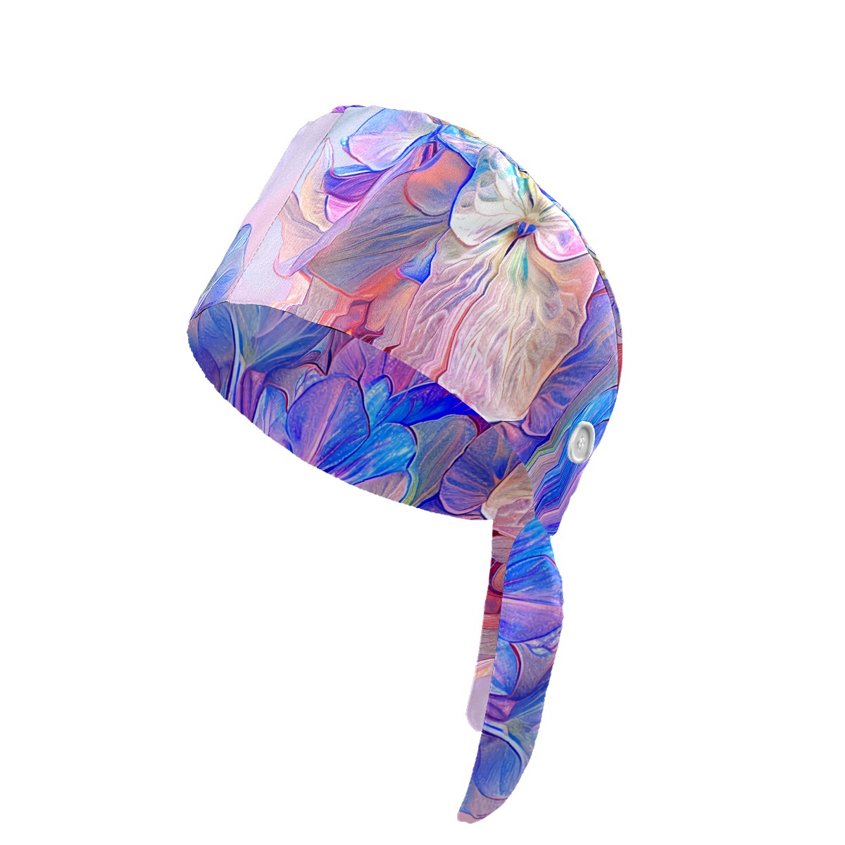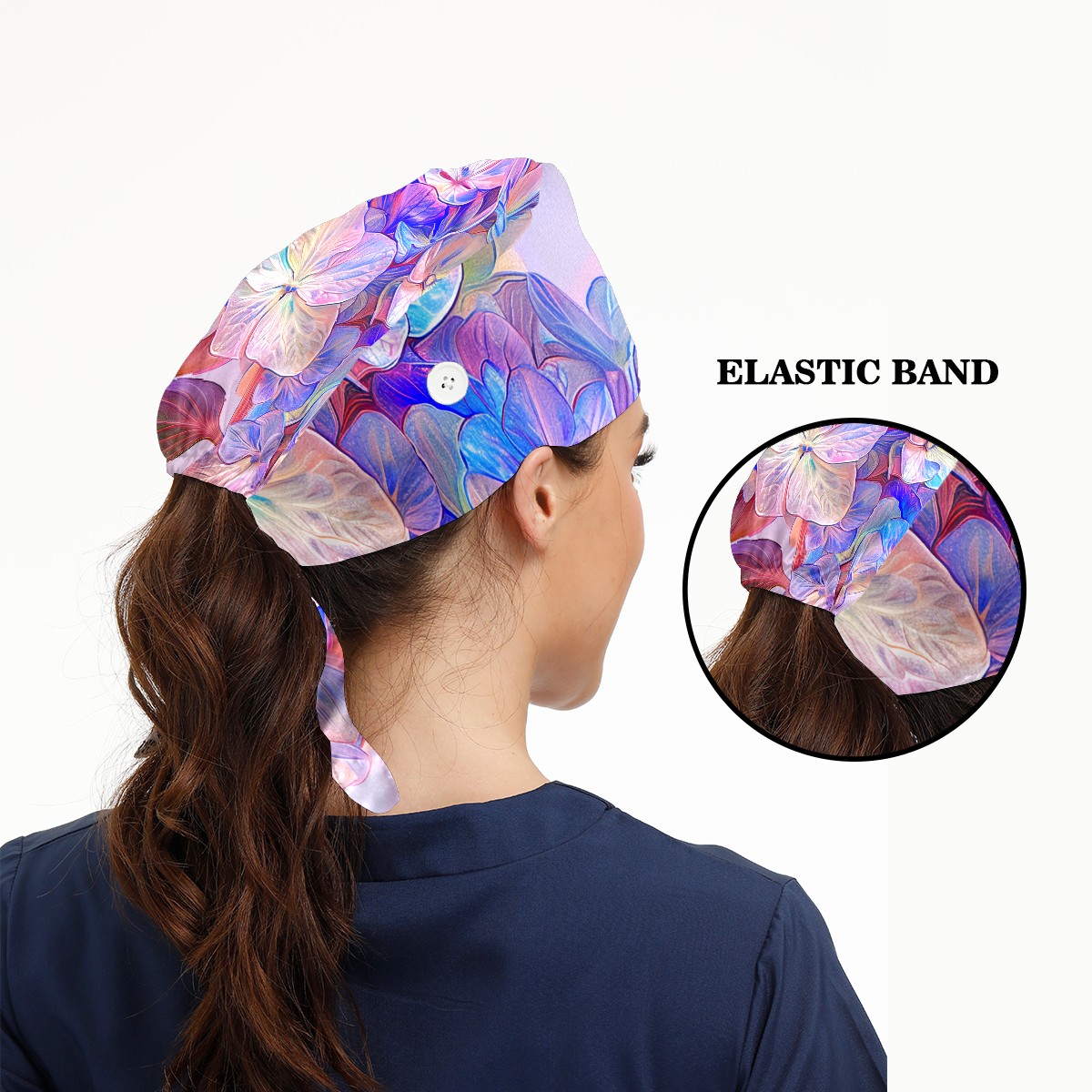 Working Caps with Button & Sweatband Satin Lined Cotton Adjustable Nurse Hats Elastic Band Scrub Cap Surgeon Hat Colorful Hydrangea E
