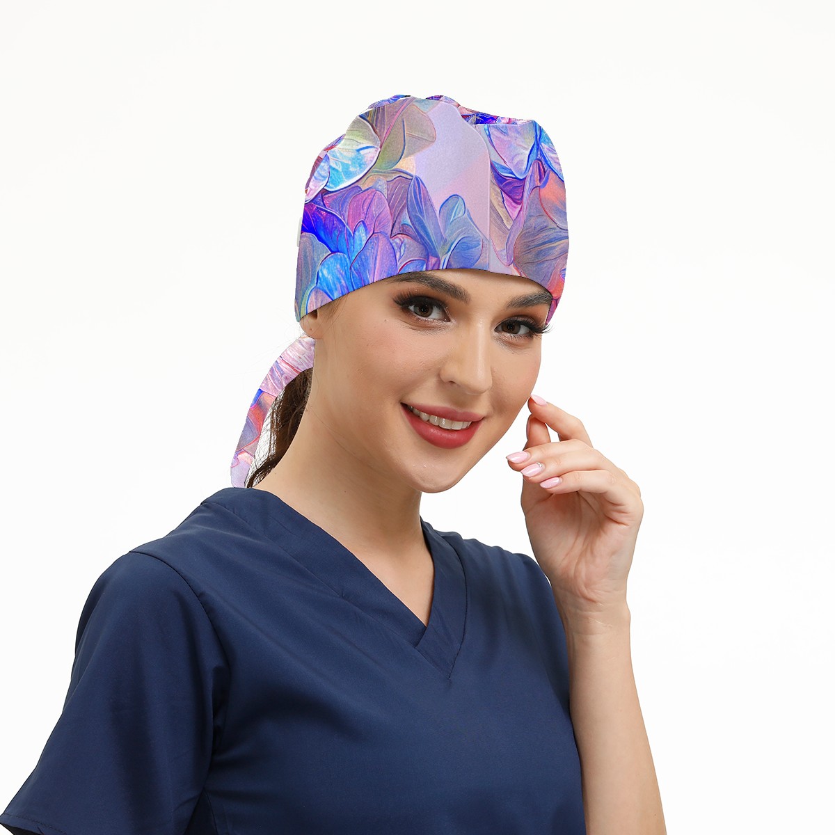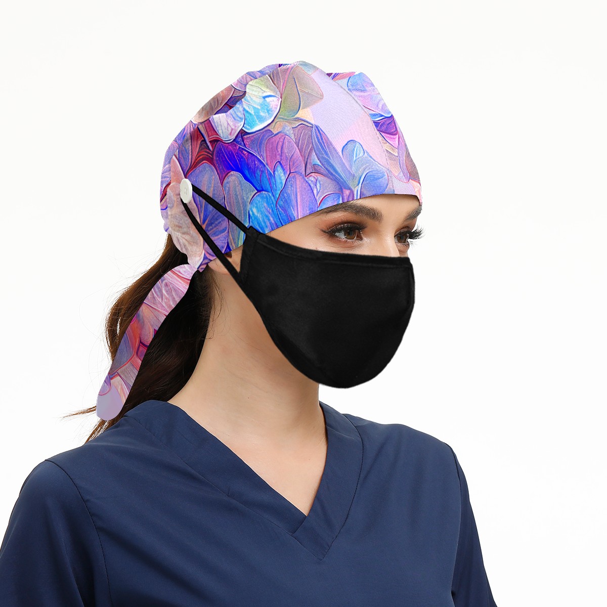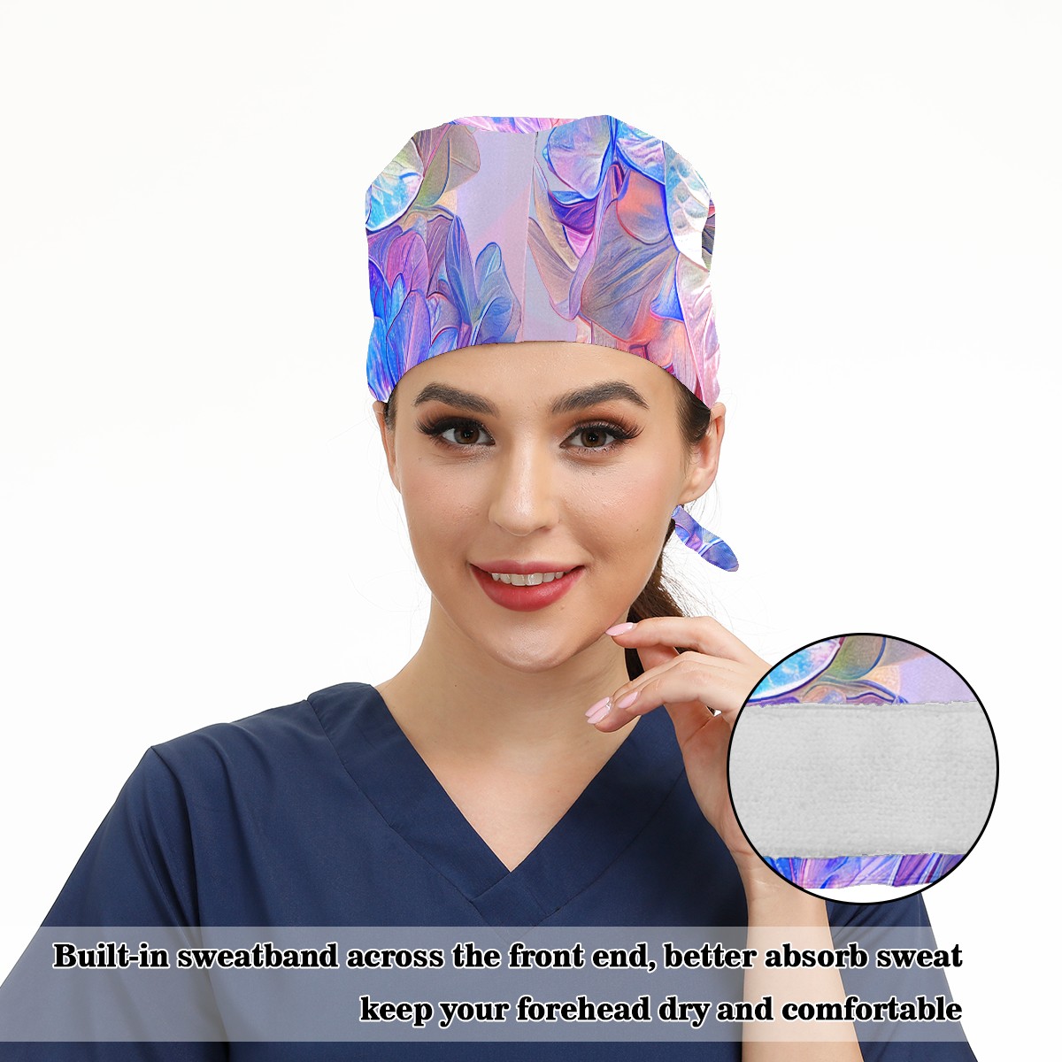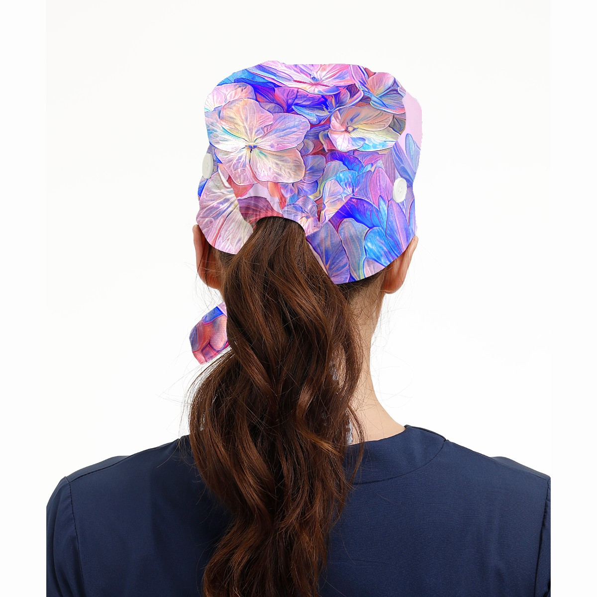 Working Caps with Button & Sweatband Satin Lined Cotton Adjustable Nurse Hats Elastic Band Scrub Cap Surgeon Hat Colorful Hydrangea E