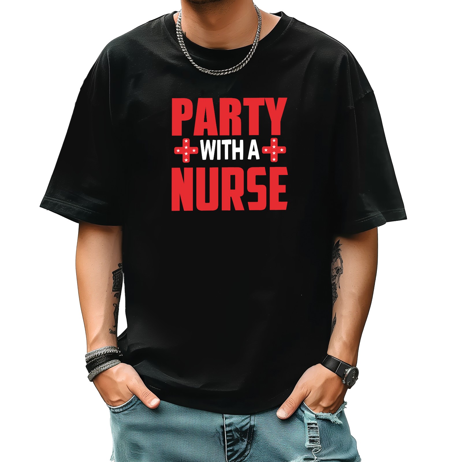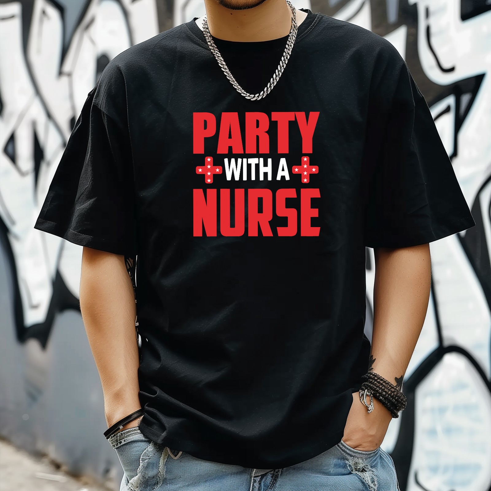 Party With Nurse T-Shirt for Man Tops Short Sleeves Shirt Crew Neck Shirt XS