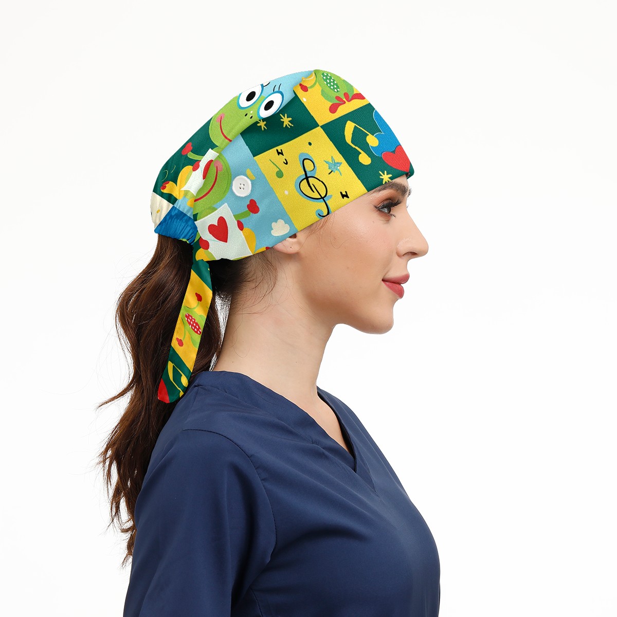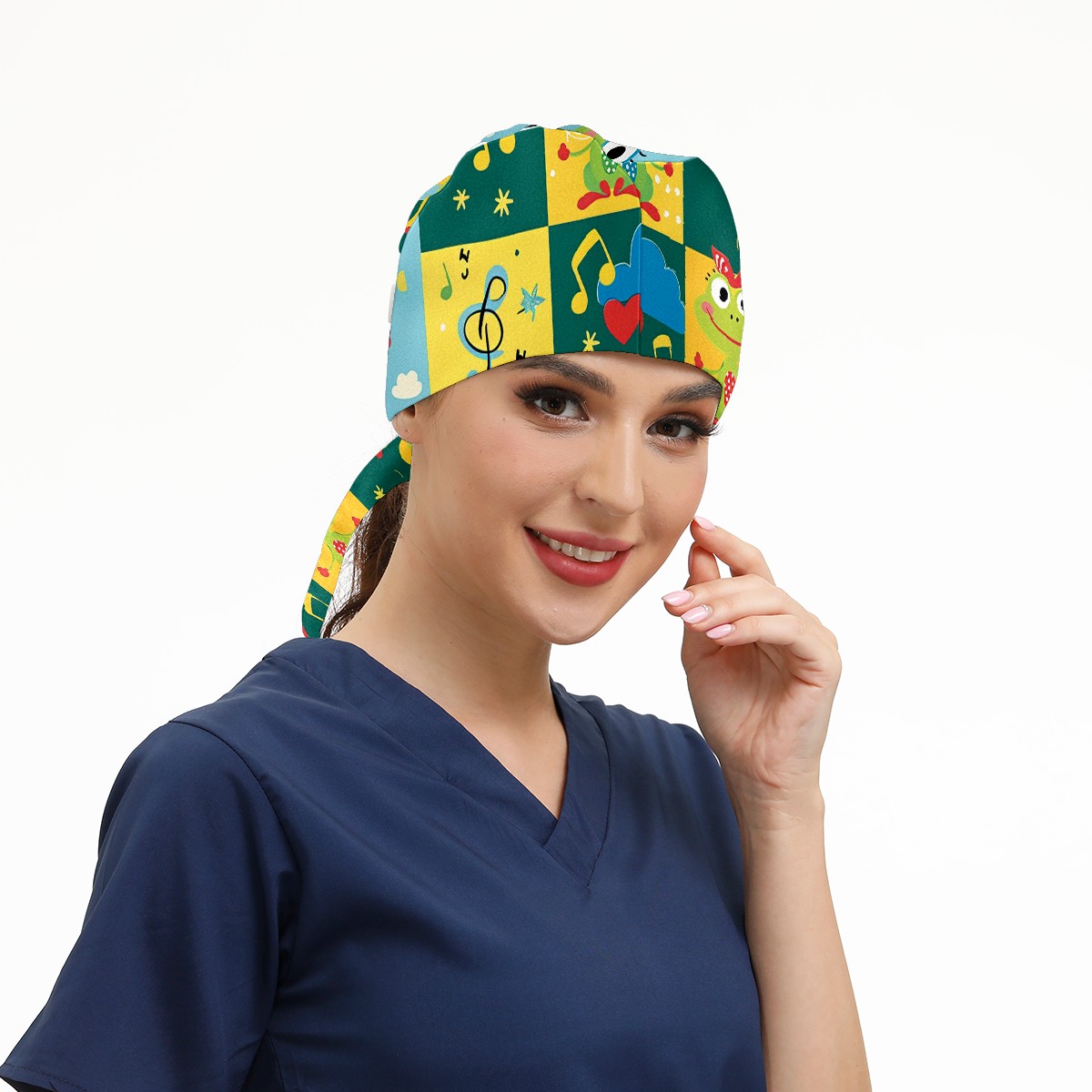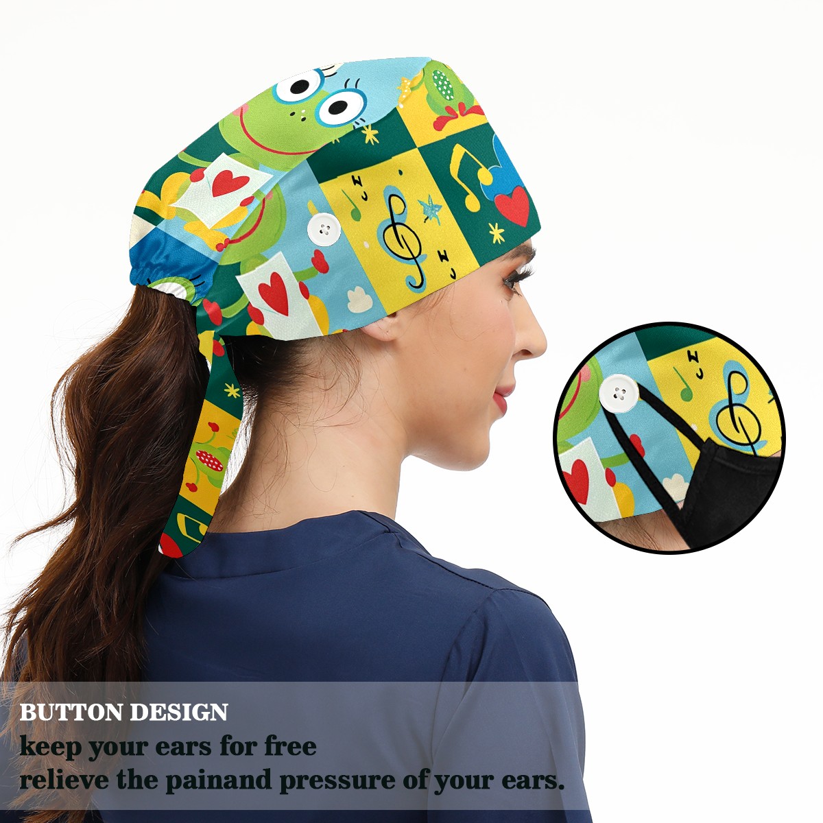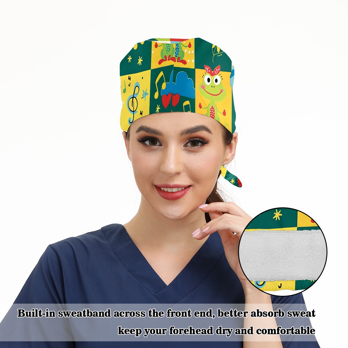 Working Caps with Button & Sweatband Satin Lined Cotton Adjustable Nurse Hats Elastic Band Scrub Cap Surgeon Hat Frog