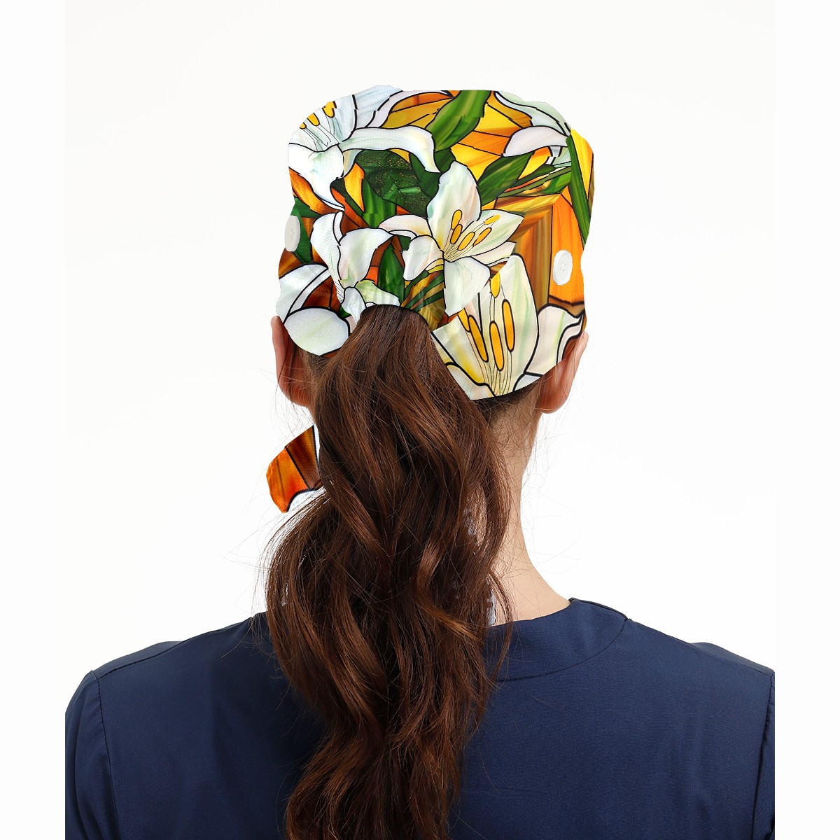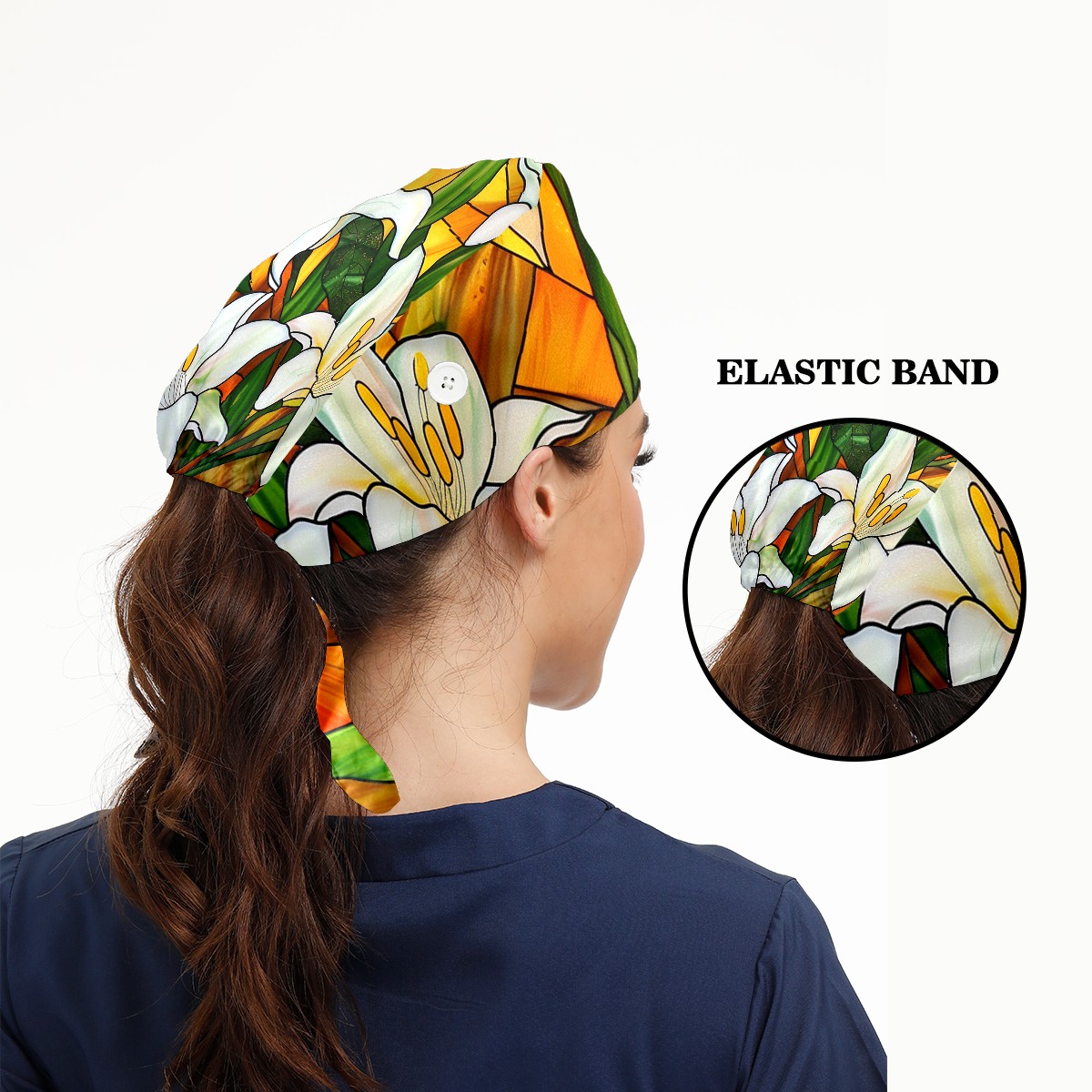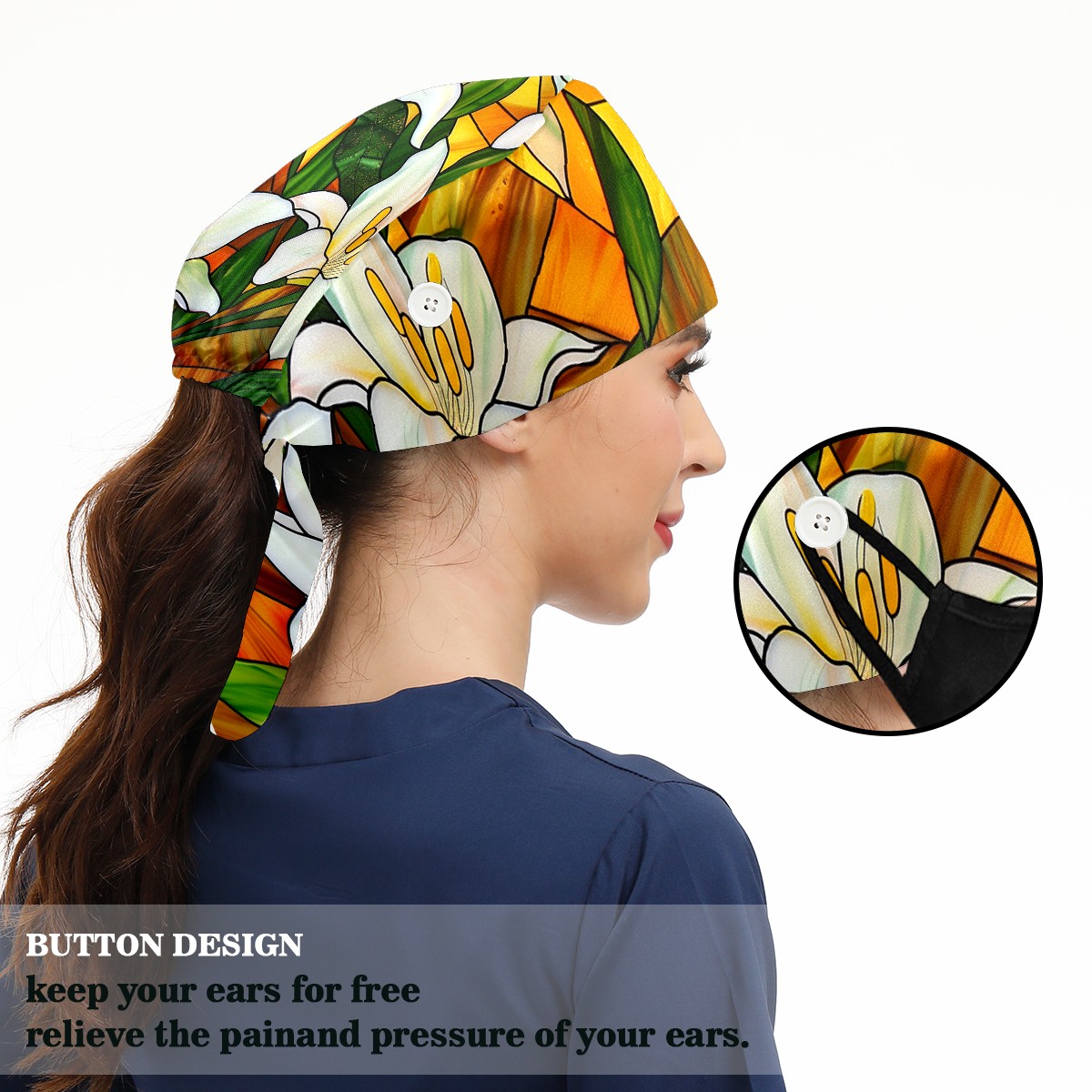 Working Caps with Button & Sweatband Satin Lined Cotton Adjustable Nurse Hats Elastic Band Scrub Cap Surgeon Hat White Lilies (1)