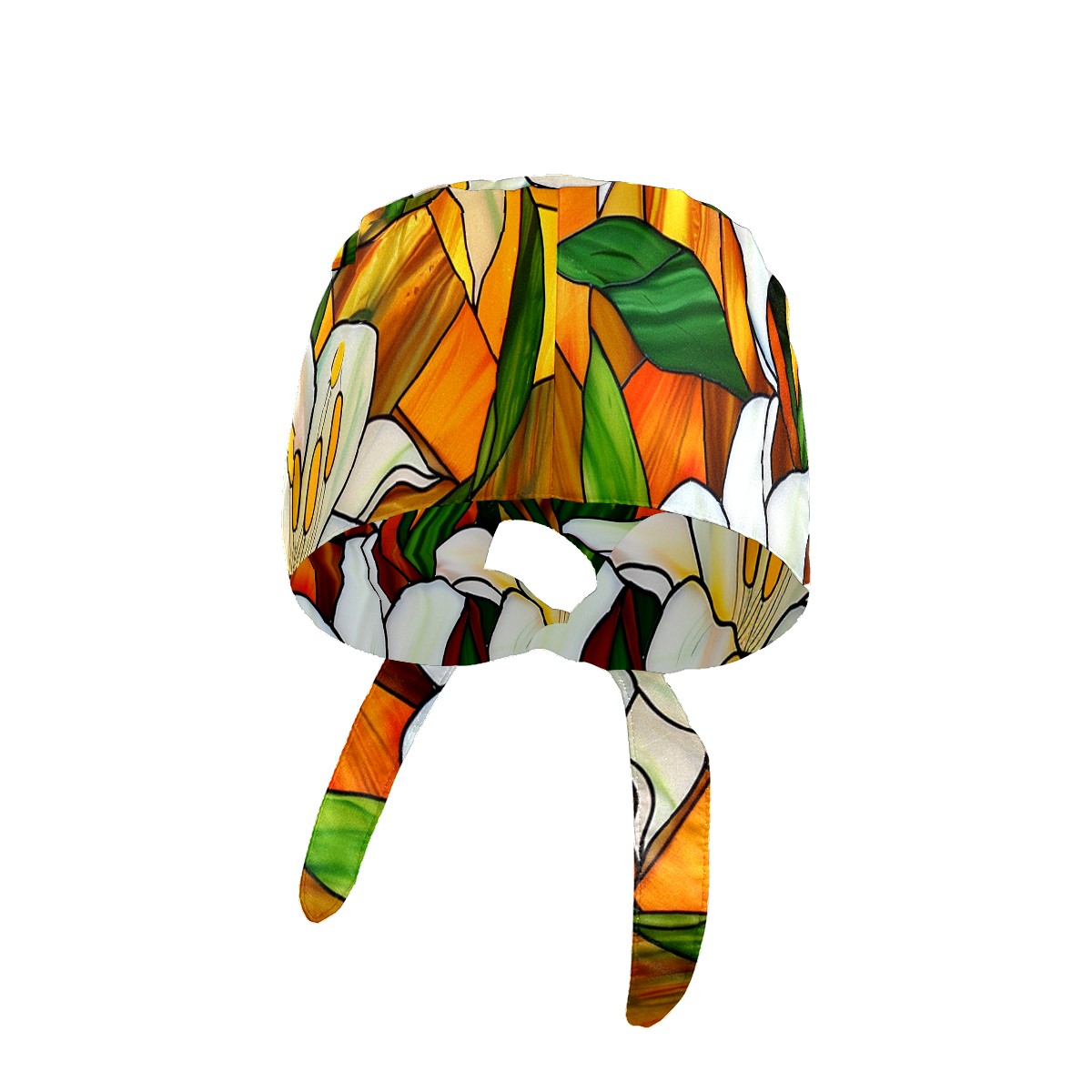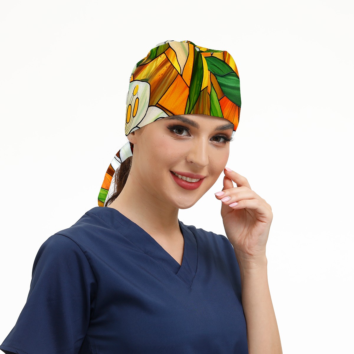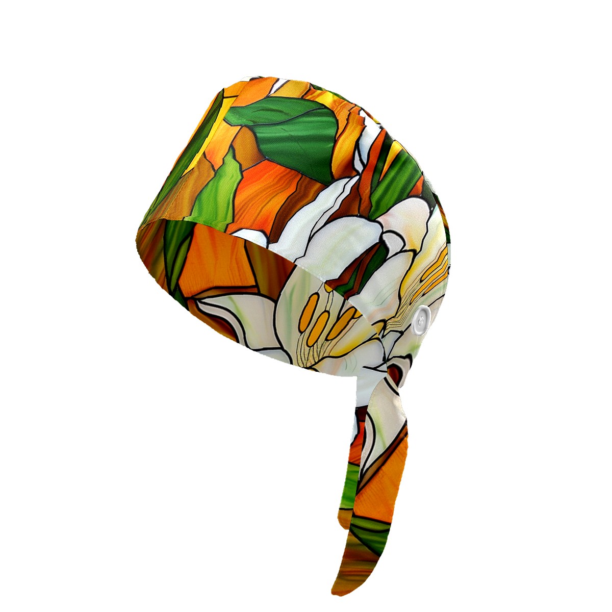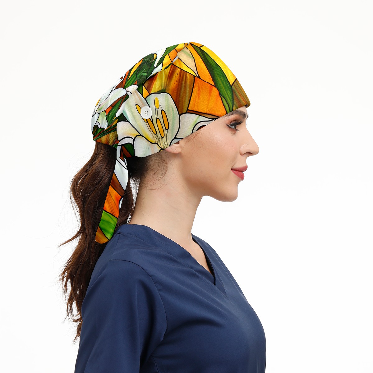 Working Caps with Button & Sweatband Satin Lined Cotton Adjustable Nurse Hats Elastic Band Scrub Cap Surgeon Hat White Lilies (1)