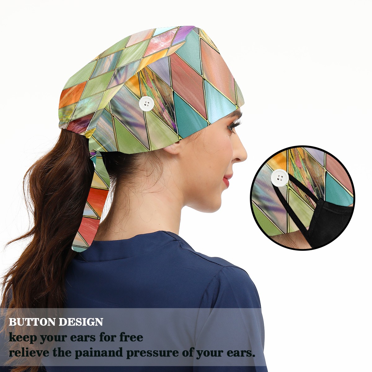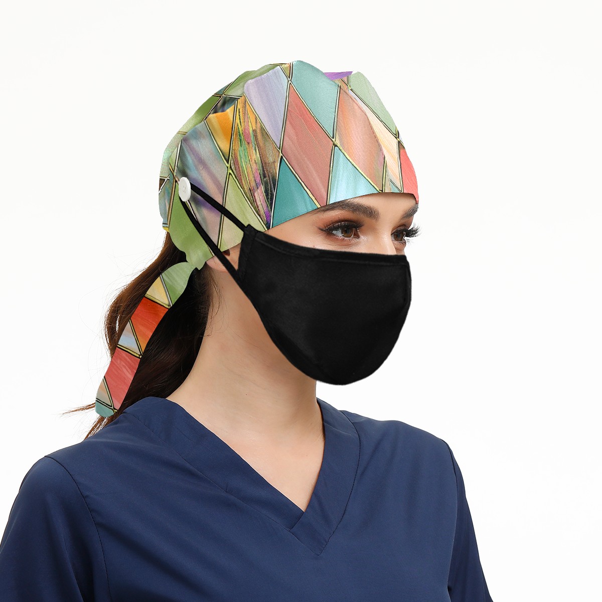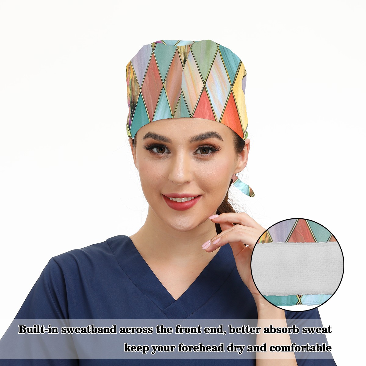 Working Caps with Button & Sweatband Satin Lined Cotton Adjustable Nurse Hats Elastic Band Scrub Cap Surgeon Hat Color Lattice (5)