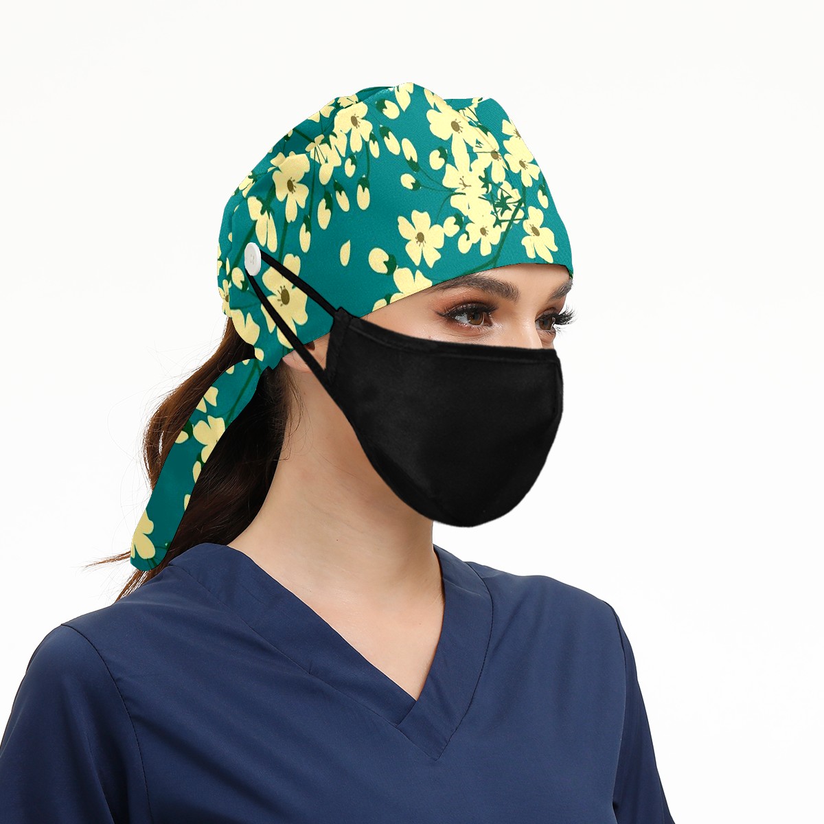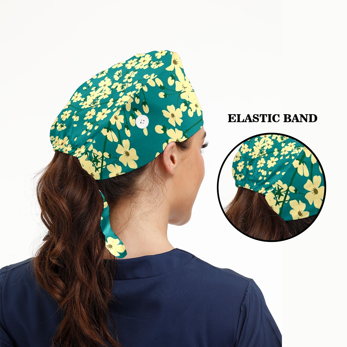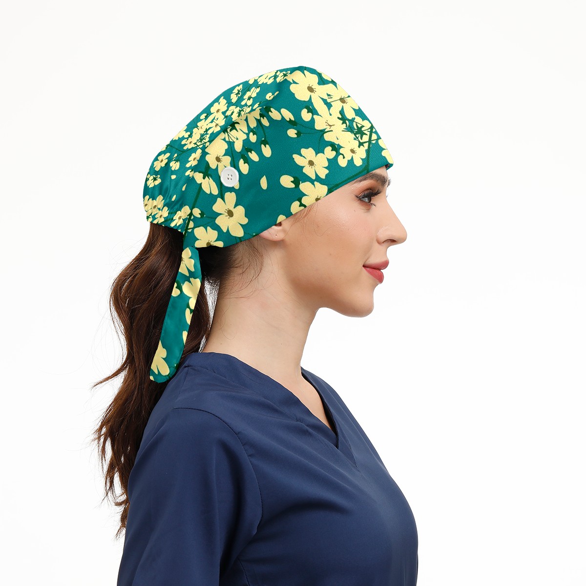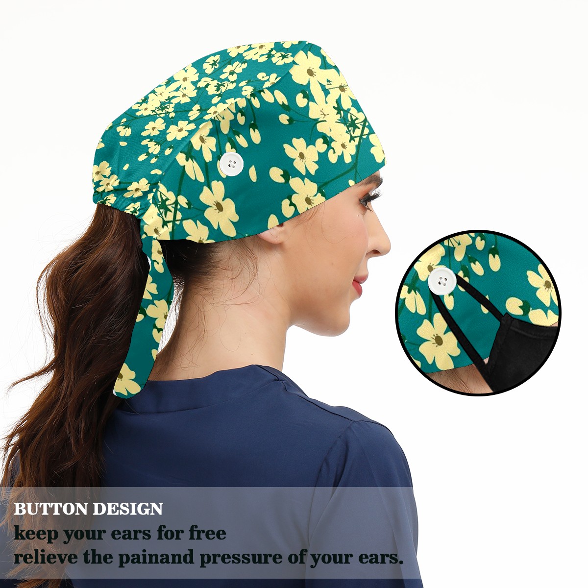 Working Caps with Button & Sweatband Satin Lined Cotton Adjustable Nurse Hats Elastic Band Scrub Cap Surgeon Hat Floral (5)